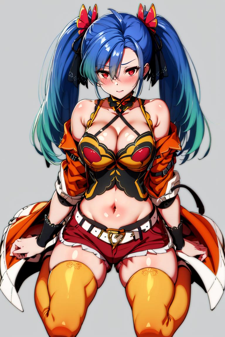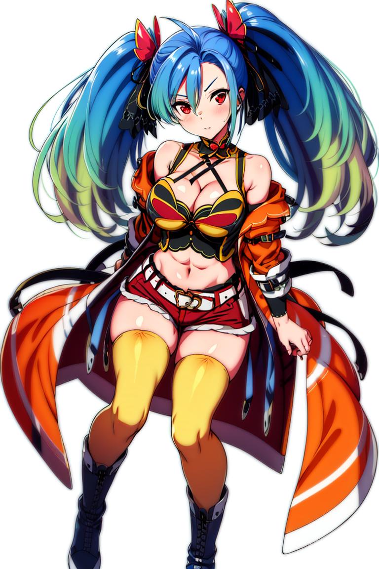 Az Seinklaus,1girl,solo,pink eyes,navel,belt,orange thighhighs,boots,breasts,short shorts,bare shoulders,brown shorts,midriff,cleavage,coat,