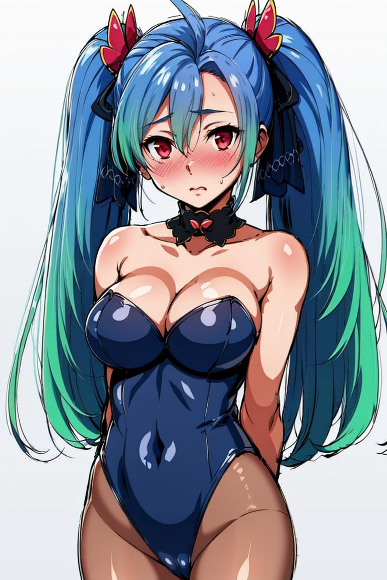 Az Seinklaus,1girl,solo,breasts,black leotard,blush,cleavage,brown pantyhose,large breasts,red eyes,bare shoulders,strapless leotard,cowboy shot,playboy bunny,aqua hair,covered navel,detached collar,hair ribbon,embarrassed,