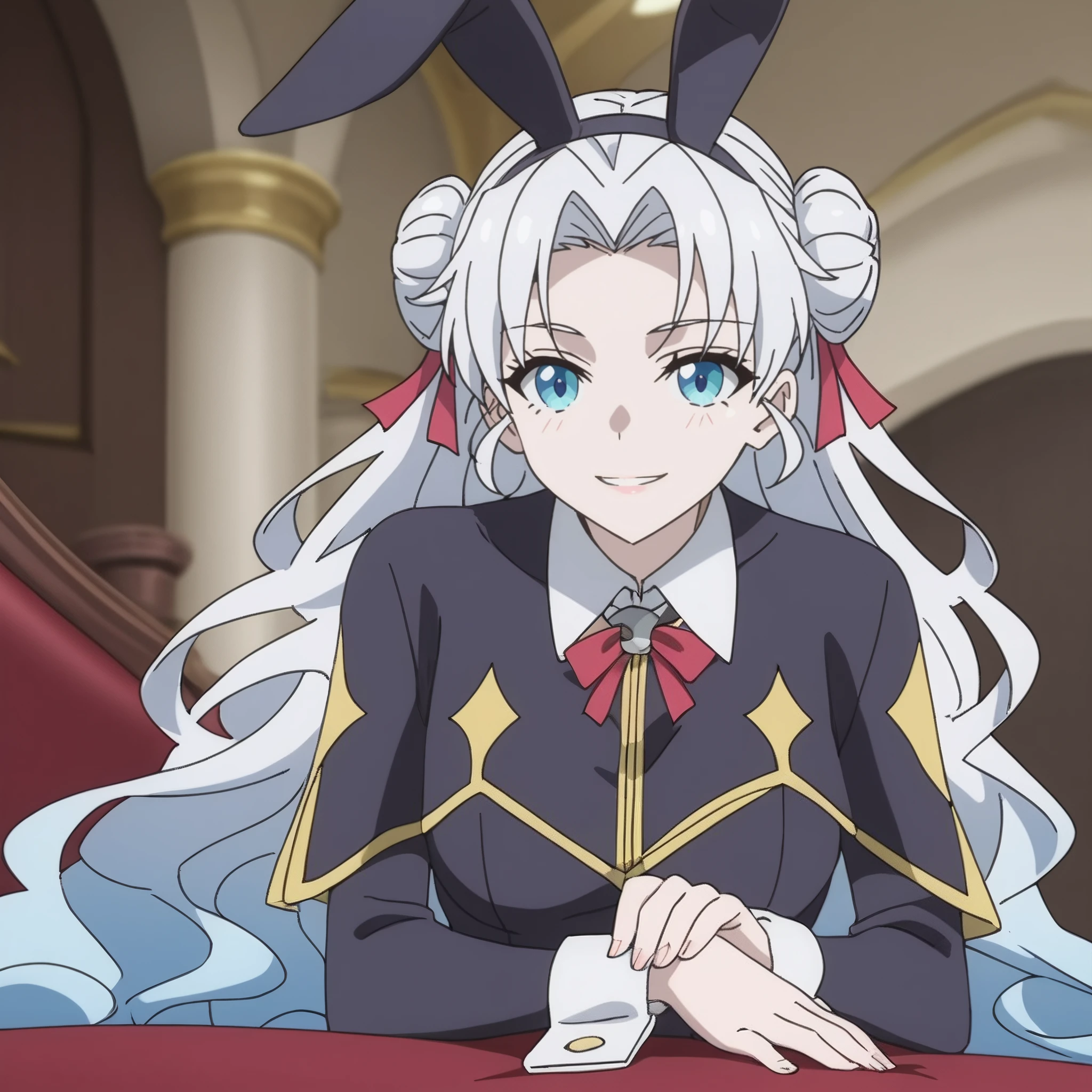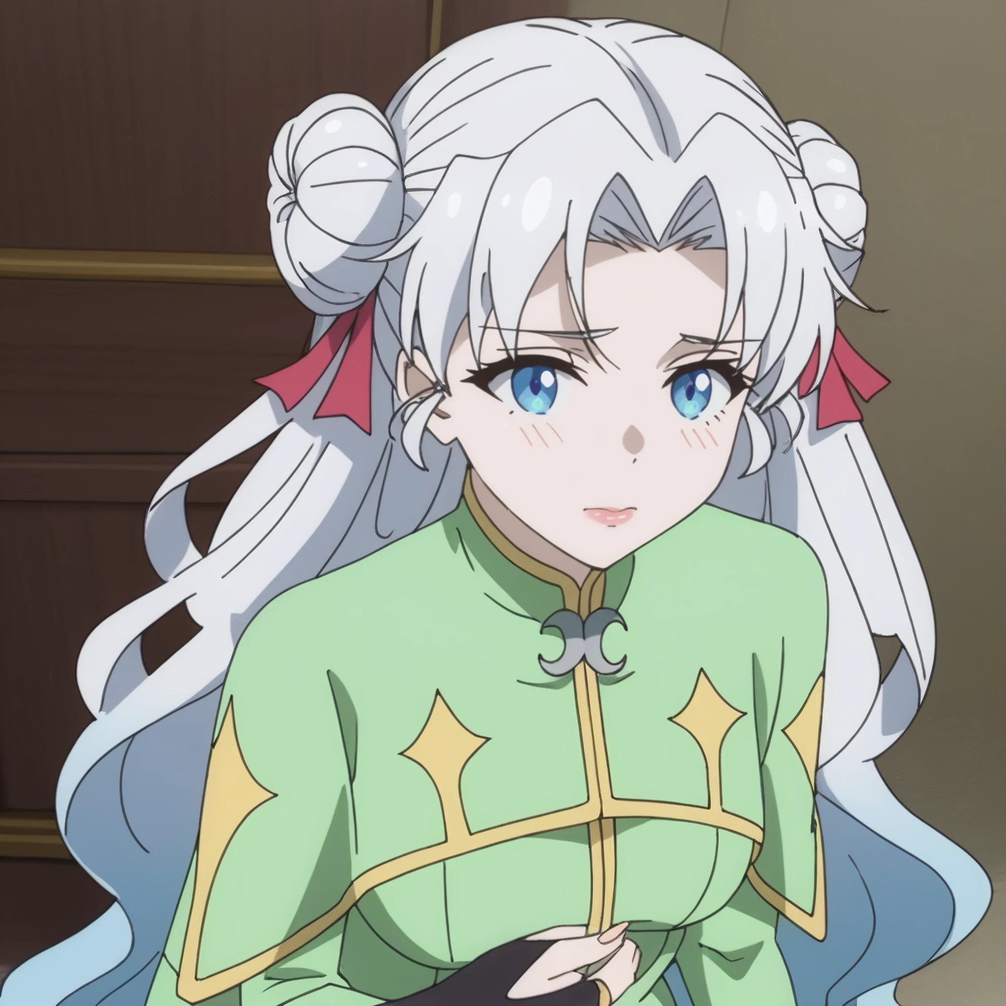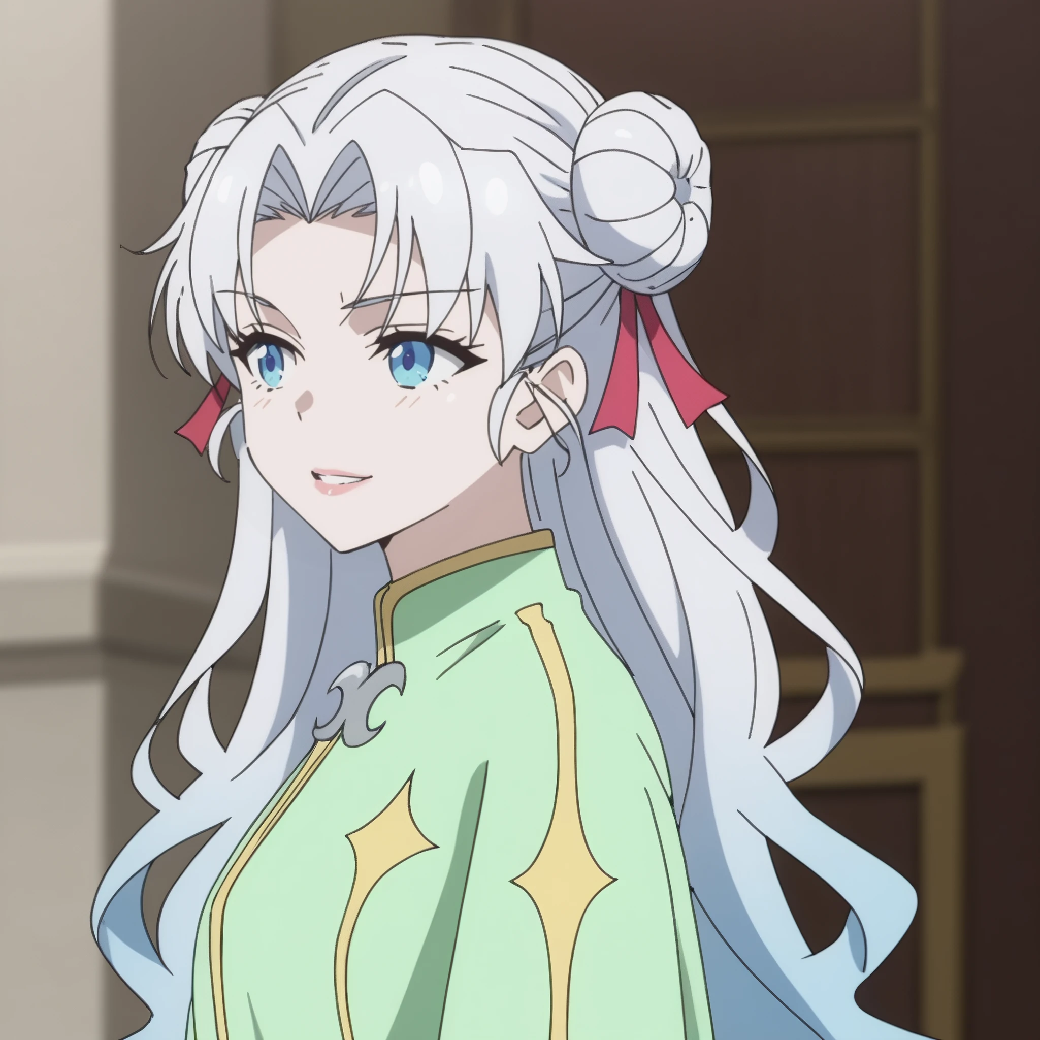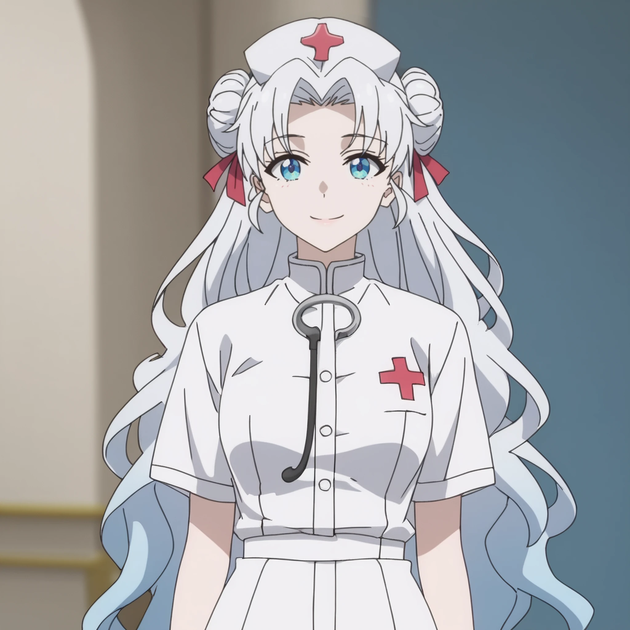 SRASheena, very long hair, hair bun, hair ribbon, red ribbon, white hair, double bun, blue eyes, wavy hair,