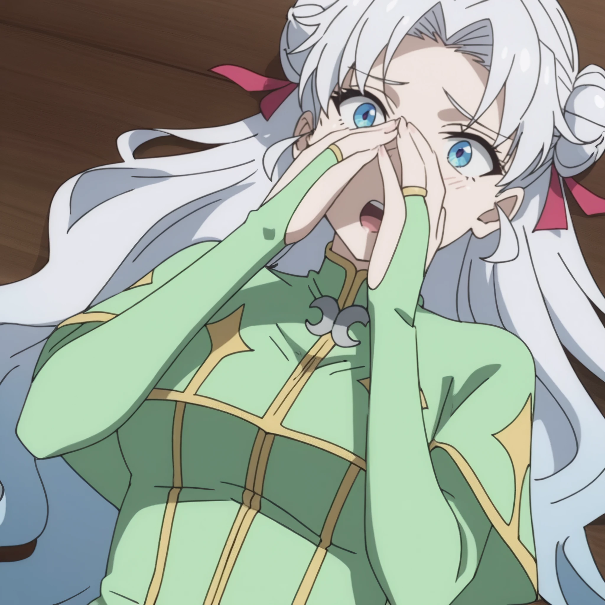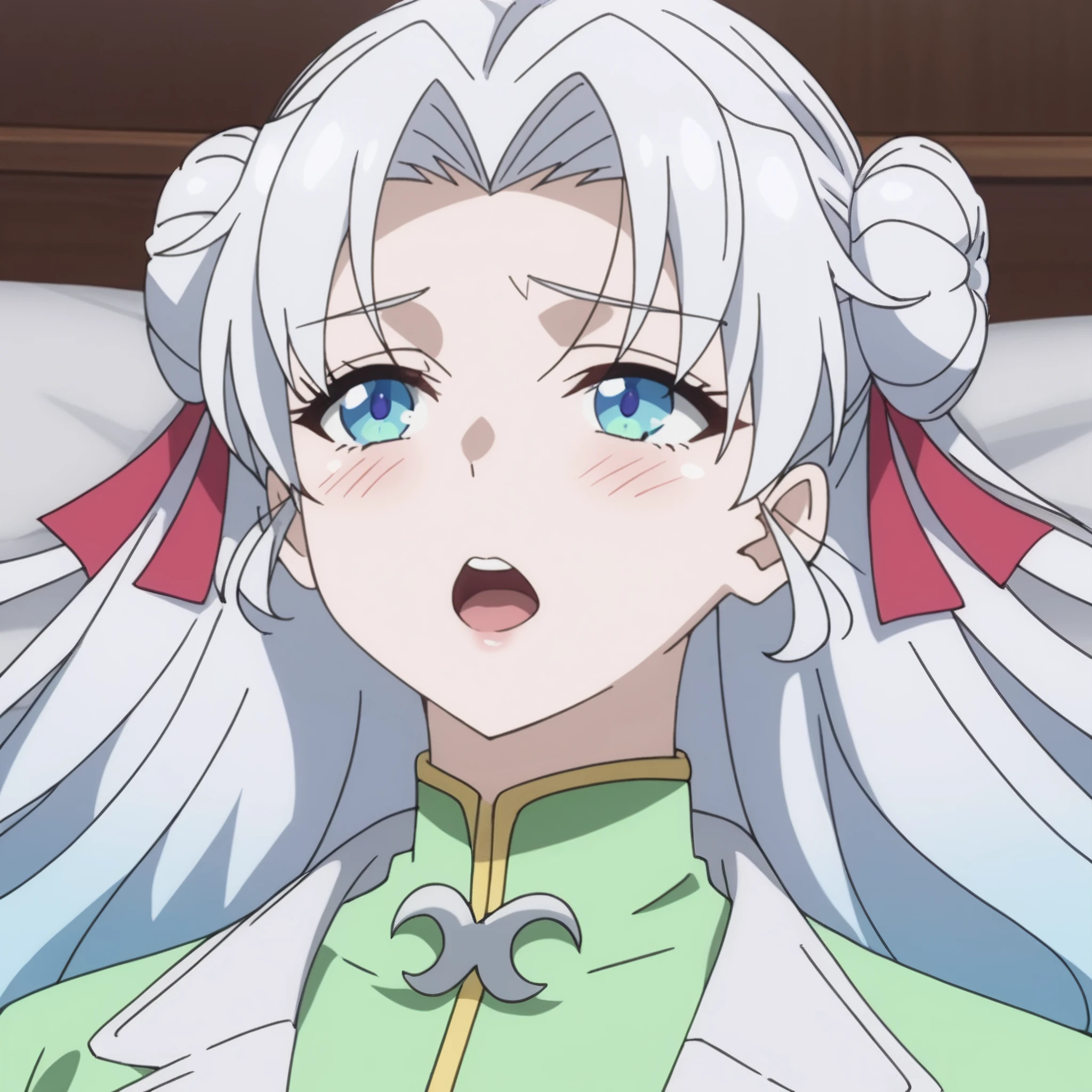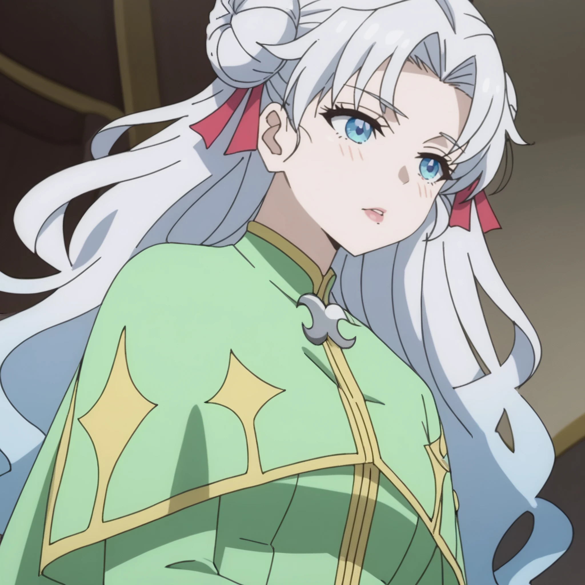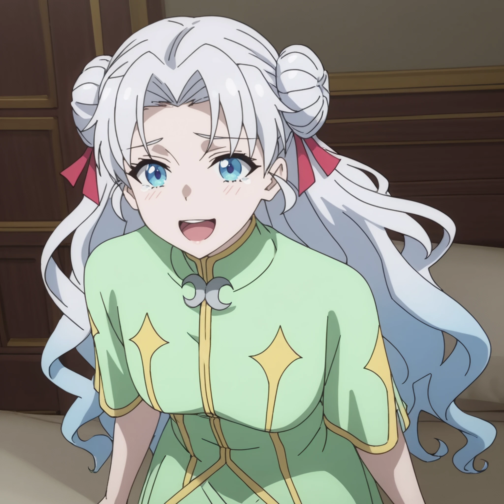 SRASheena, very long hair, hair bun, hair ribbon, red ribbon, white hair, double bun, blue eyes, wavy hair,