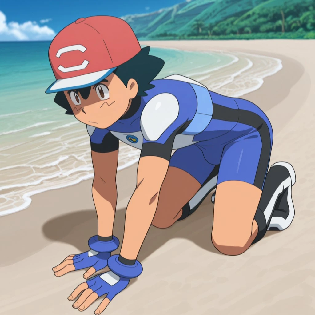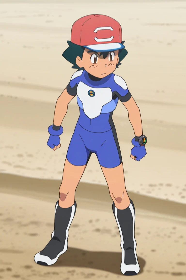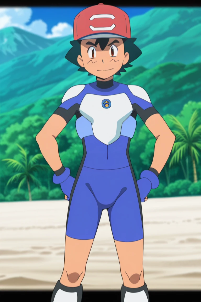 Ash Ketchum, 1boy, hair between eyes, brown eyes, black hair, fingerless gloves, male focus, ashsm, hat, baseball cap, red headwear, blue bodysuit, blue tightsuit, body suit with black accent, bare arms, bare thighs, short sleeves, ultra guardian suit, bike shorts, blue shorts, young, breastplate, armored, shoulder pads, knee boots, cosplay, bang, young boy, bulky pec, confident, manly, natural fitness body building, thick arms, no ??????, twink, anime screencap, source anime,