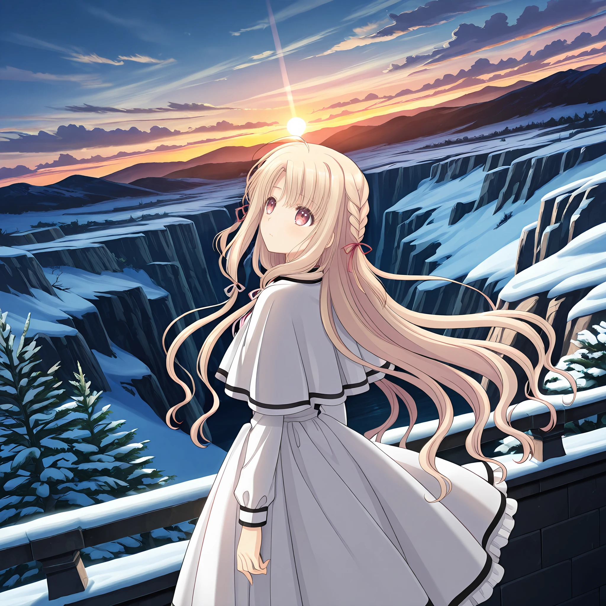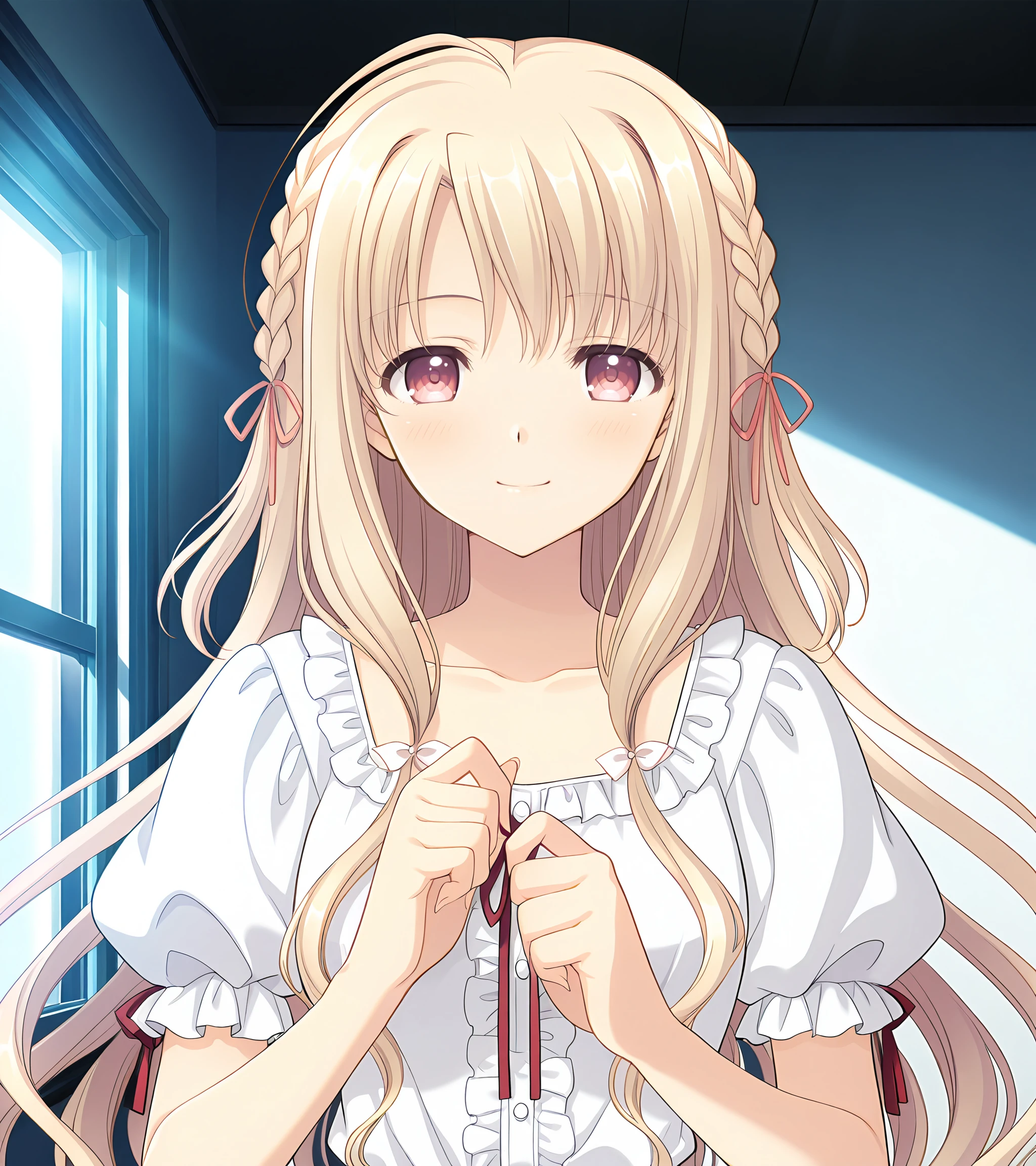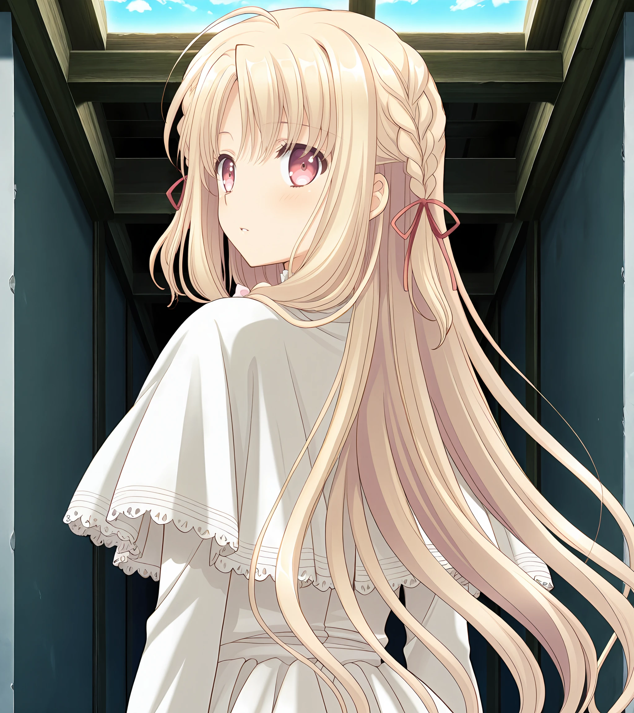 OtoRi_Meryl, long hair, very long hair, blonde hair, bangs, braid, twin braids, ribbon, hair ribbon, red eyes, 白色连衣裙 / 白い制服 / White dress