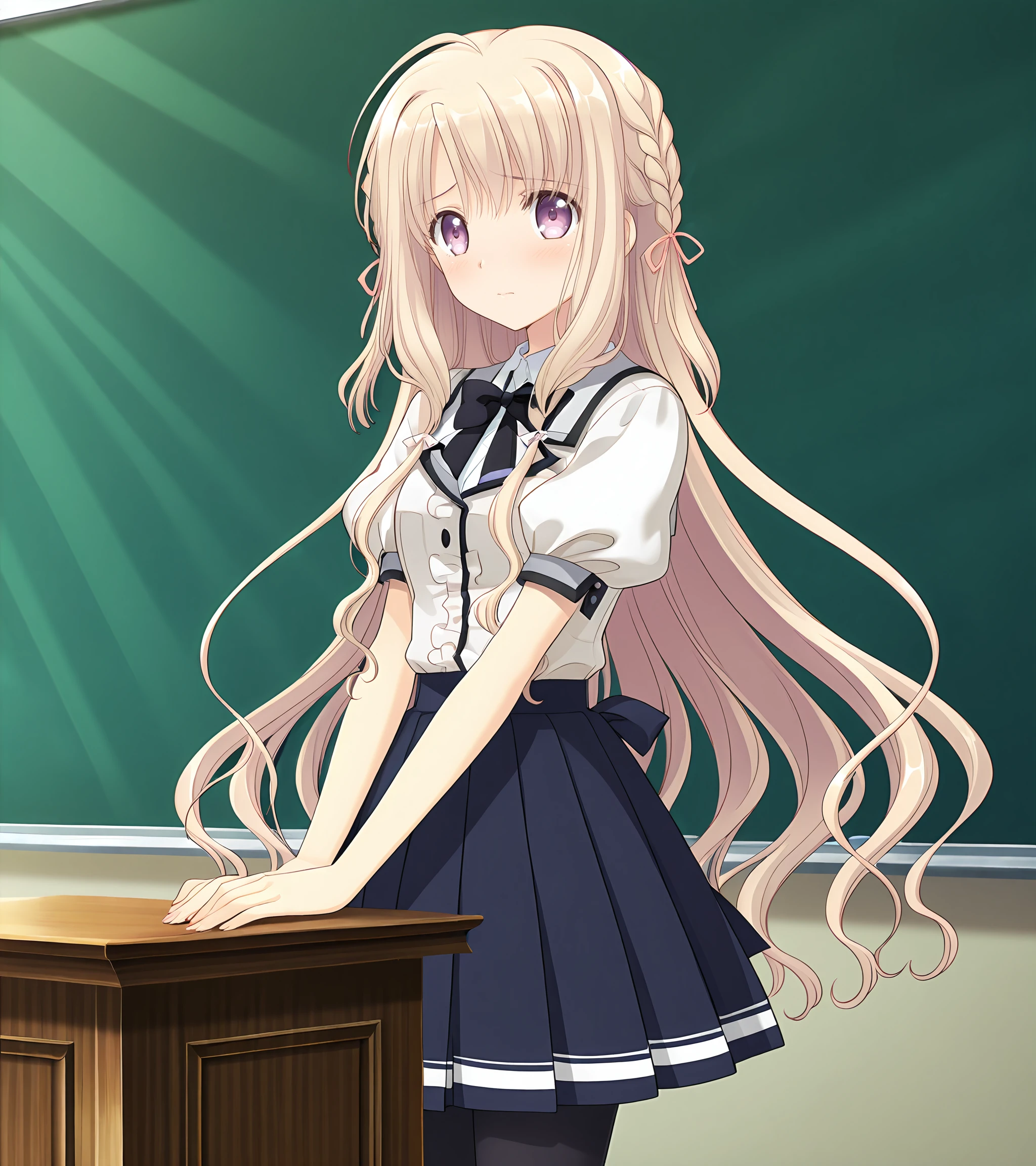 OtoRi_Meryl, long hair, very long hair, blonde hair, bangs, braid, twin braids, ribbon, hair ribbon, red eyes,