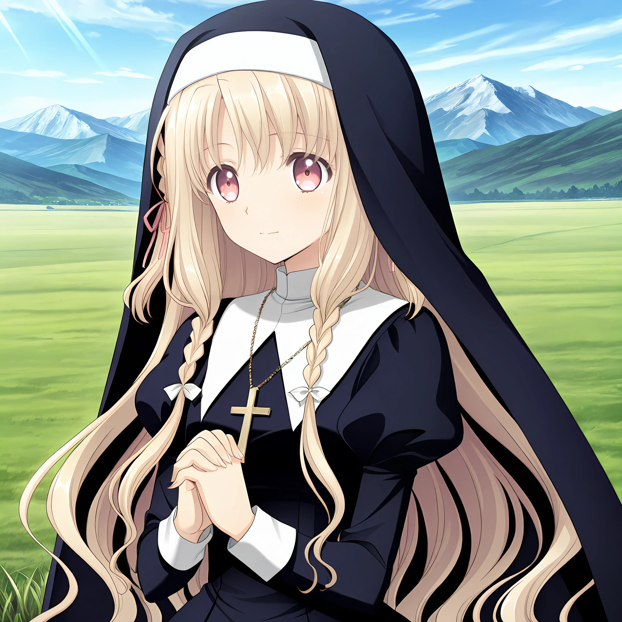 nun,habit,veil,dress,long sleeves,cross,necklace,cross necklace,jewelry,deep_blue_dressDescription
