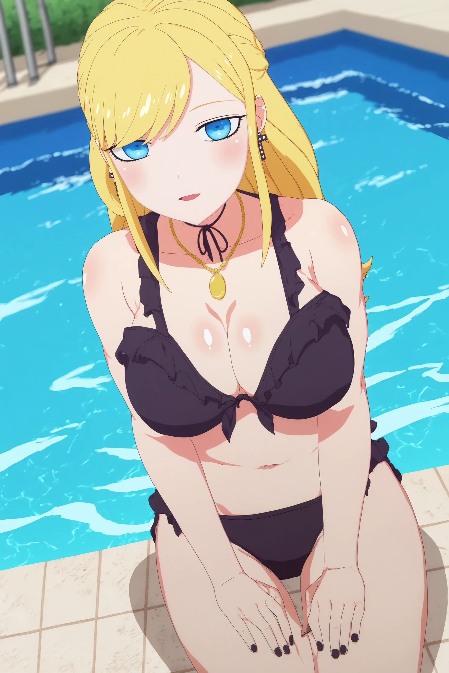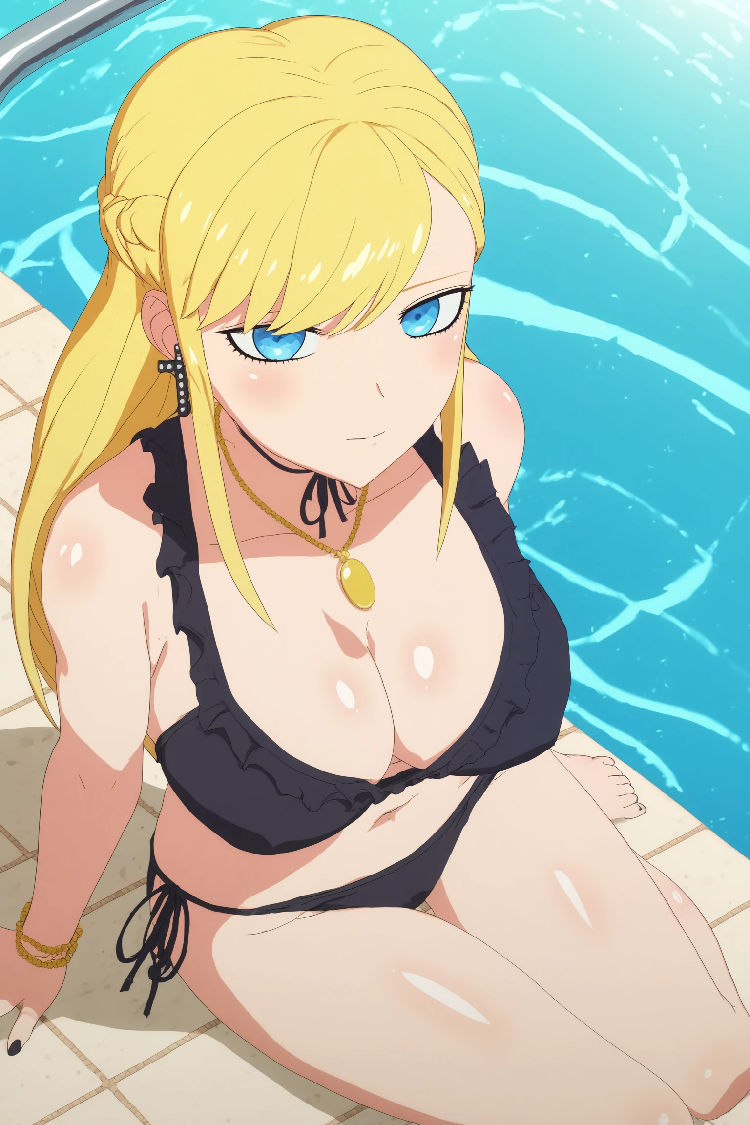 alice lendrott,1girl,solo,mature_female,blonde_hair, breasts, cleavage, jewelry, necklace, large_breasts, dress,looking_at_viewer, earrings, black_dress, off-shoulder dress, long dress,choker,black nails,black headwear,bangs,bare shoulders,hood_up