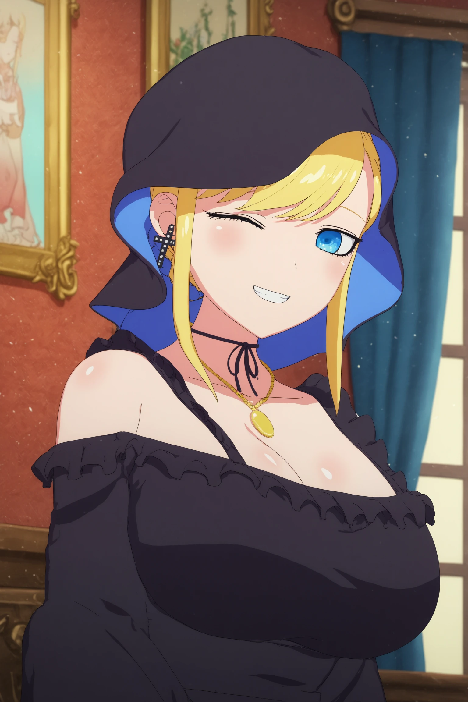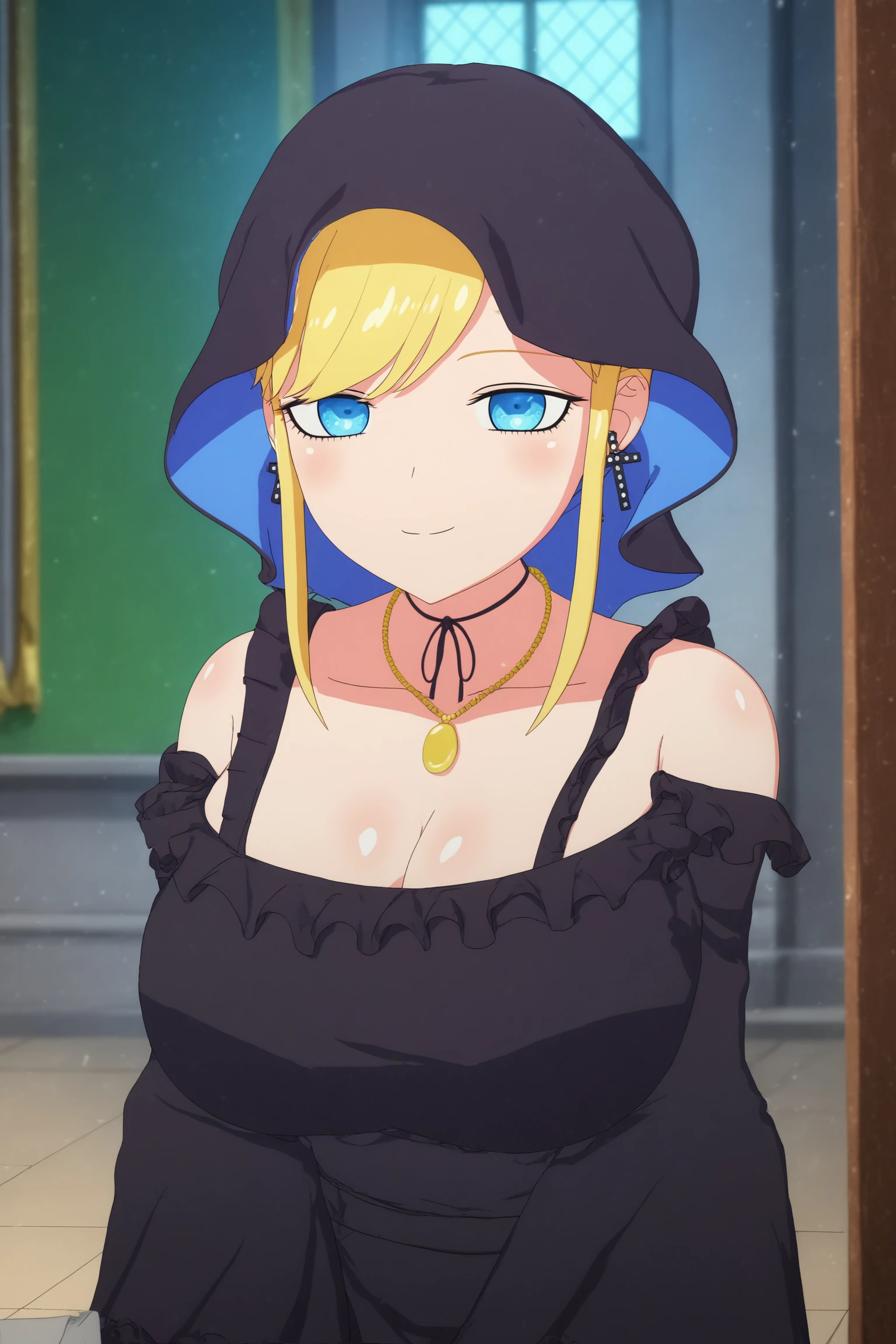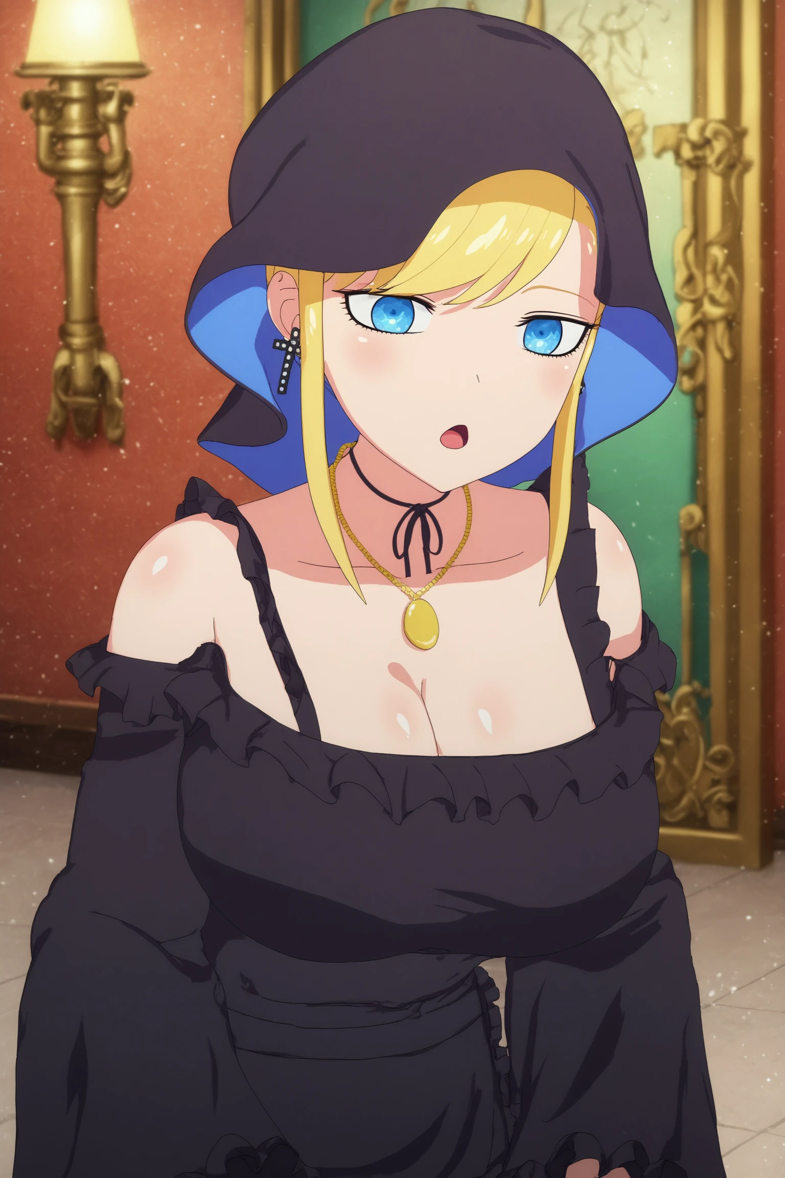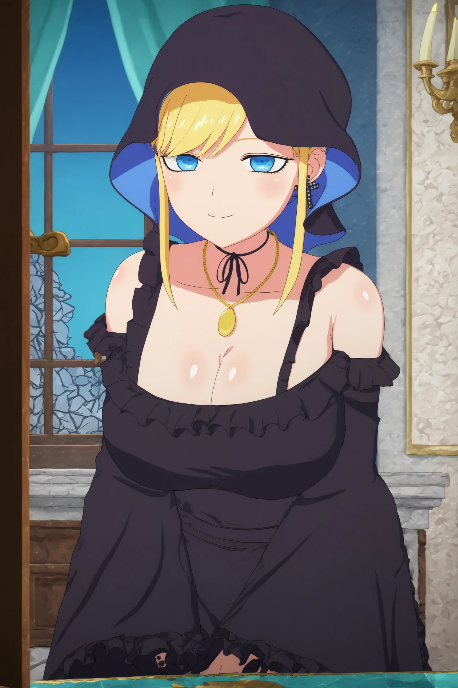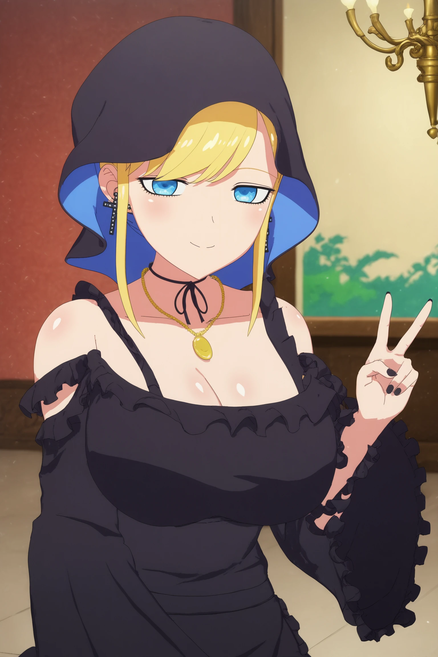 Triggers : alice lendrott,1girl,solo,mature_female,blonde_hair, breasts, cleavage, jewelry, necklace, large_breasts, dress,looking_at_viewer, earrings, black_dress, off-shoulder dress, long dress,choker,black nails,black headwear,bangs,bare shoulders,hood_up