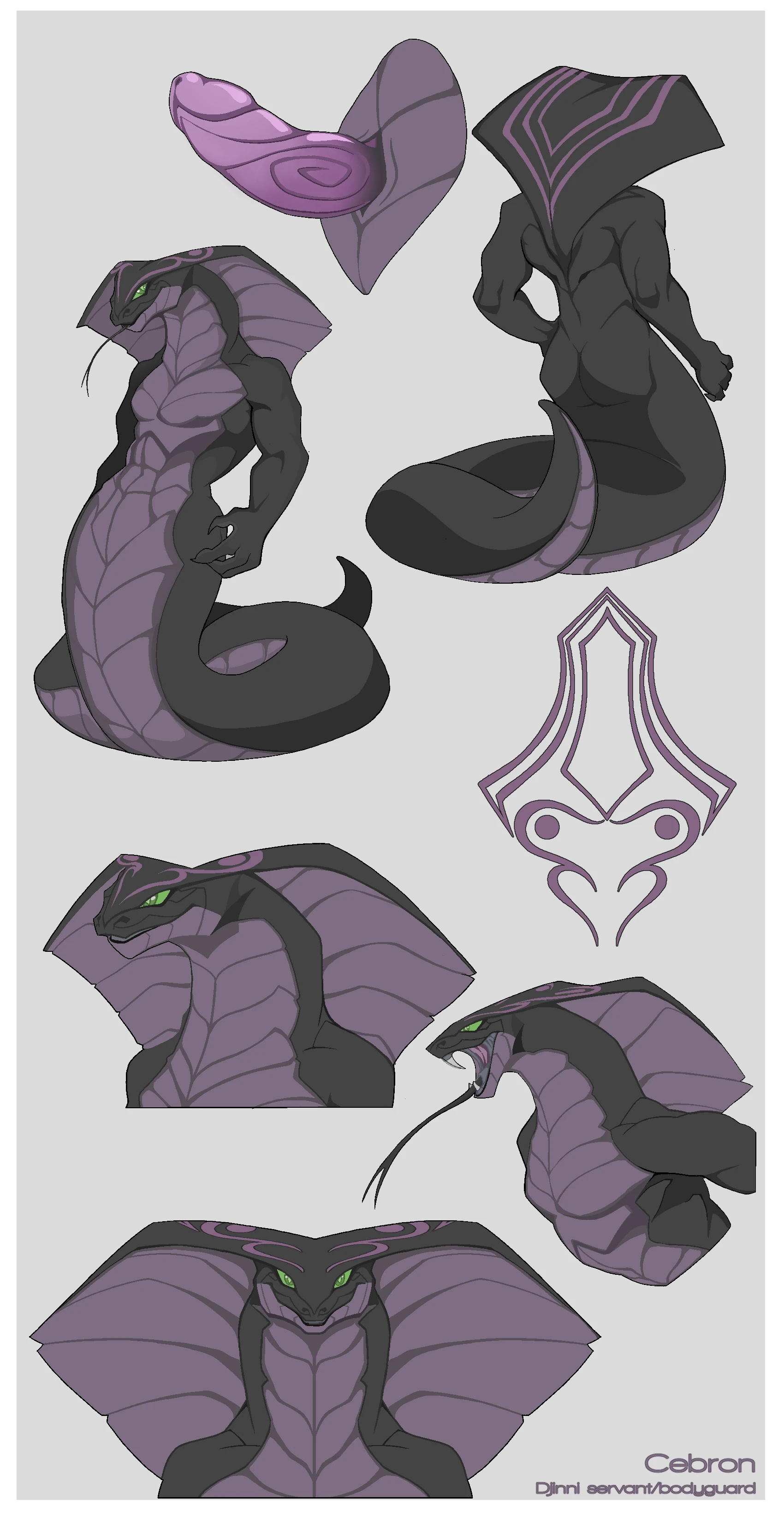 Cebron, 1boy, male, snake, cobra, djinn, slit eyes, green eyes, green sclera, muscular, black body, purple underbelly, tail,