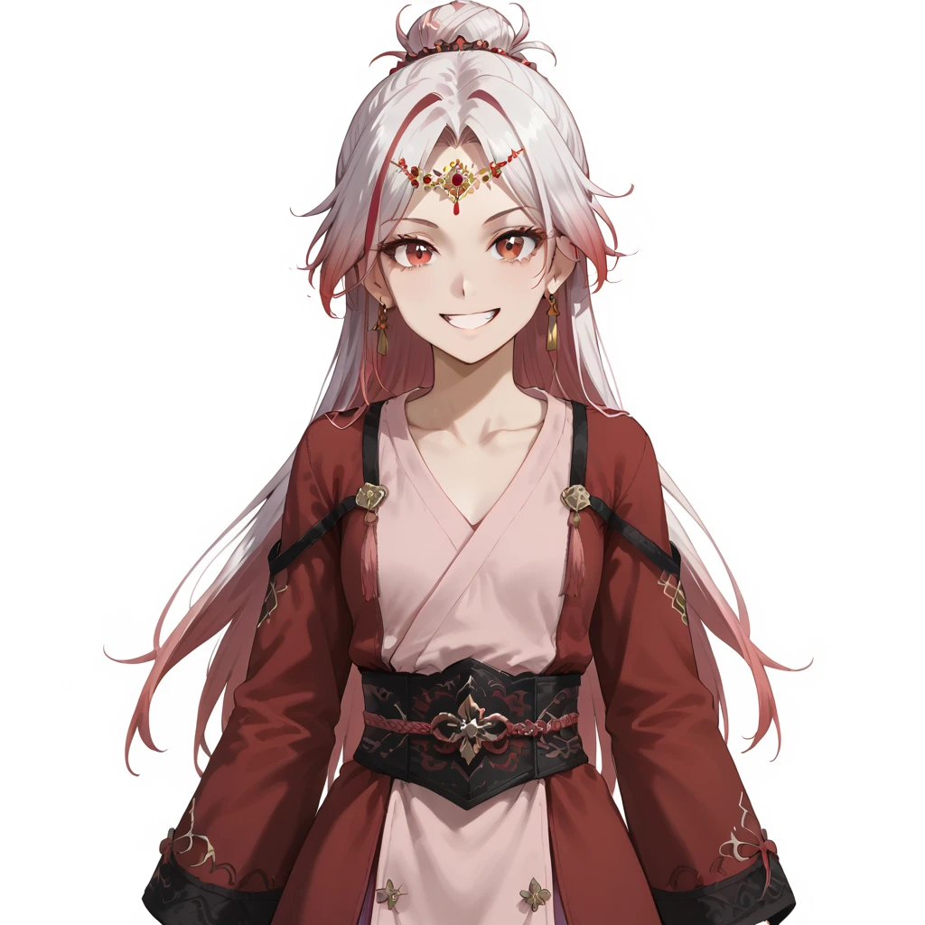yu_fuhua,long hair,bangs,red eyes,parted bangs,hair bun,hair ornament,red hair,pink hair,smile,earrings,grin,smile,single bun,multicolored hair,streaked hair,white hair,collarbone,red clothes,pink clothes,boots,