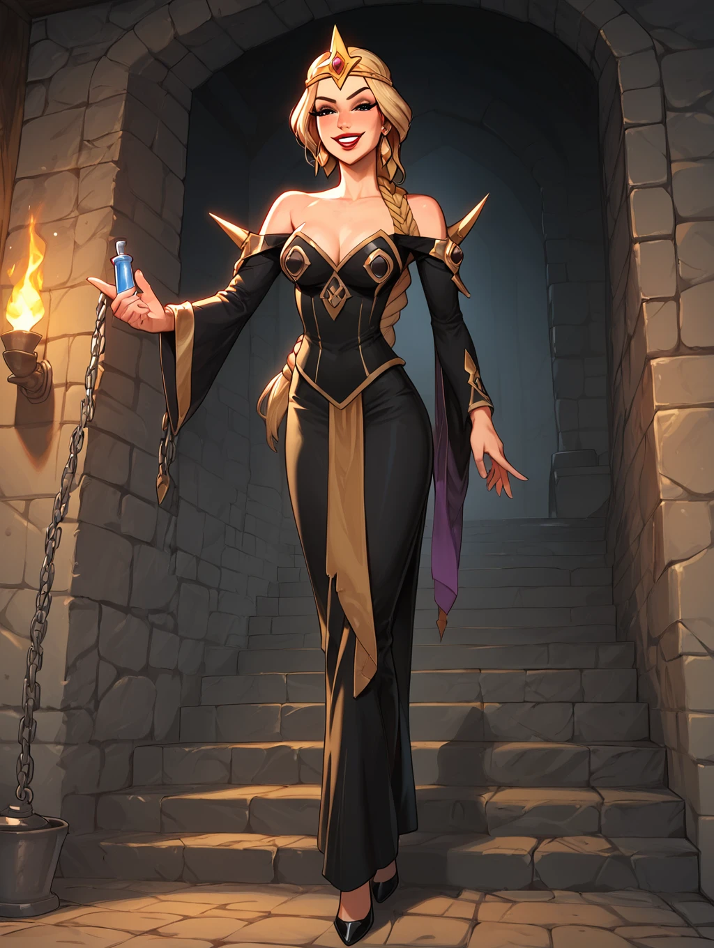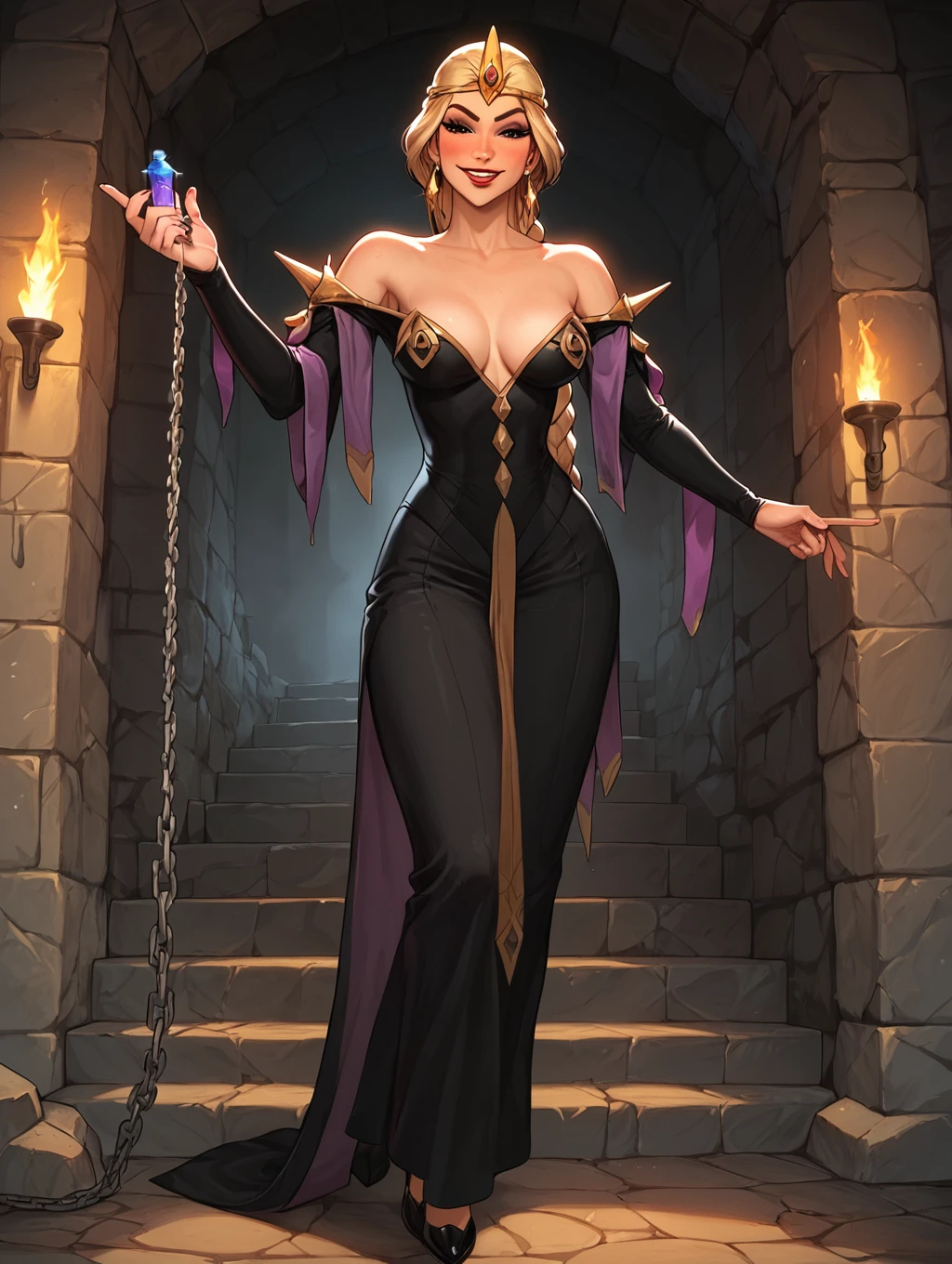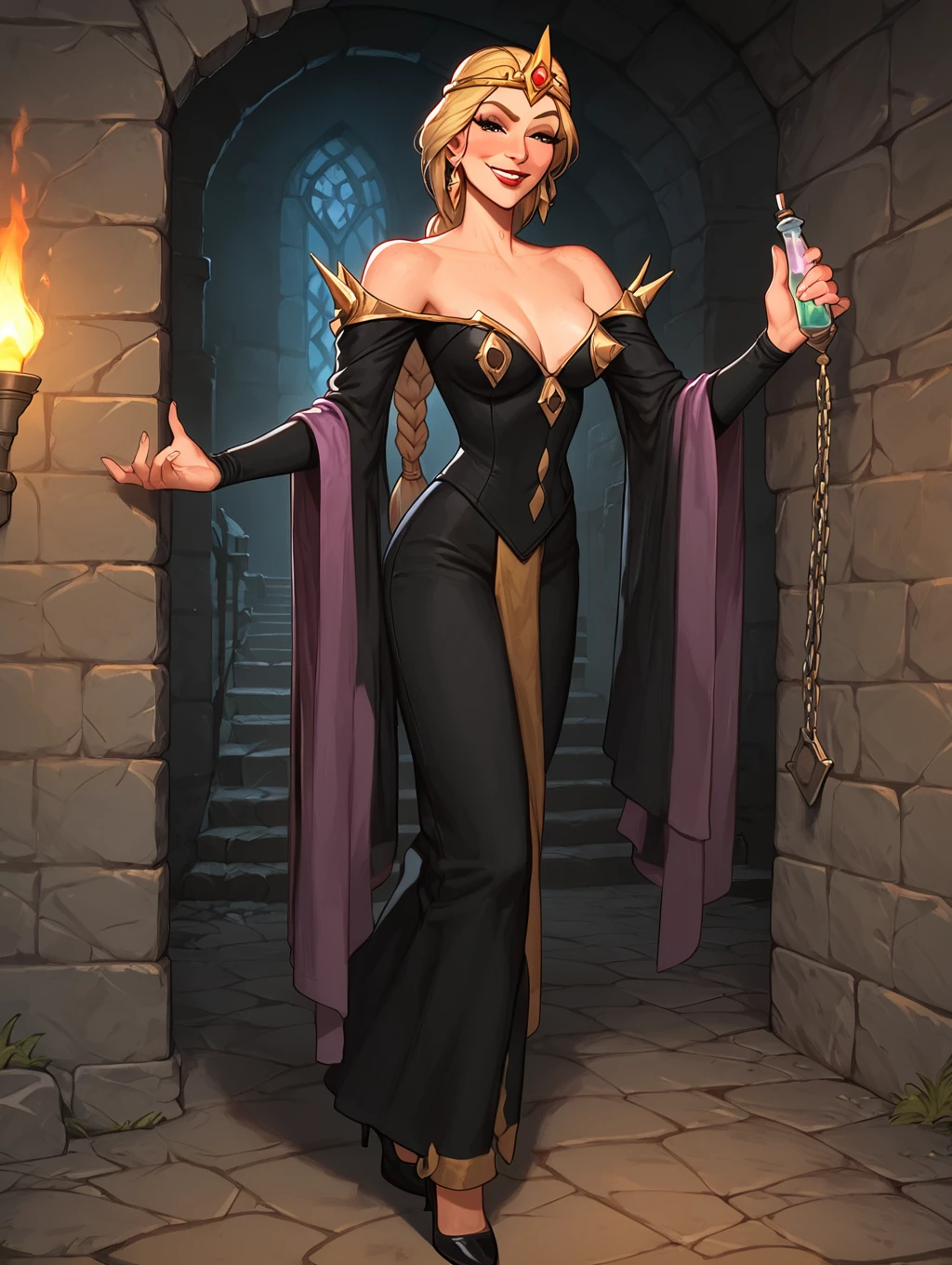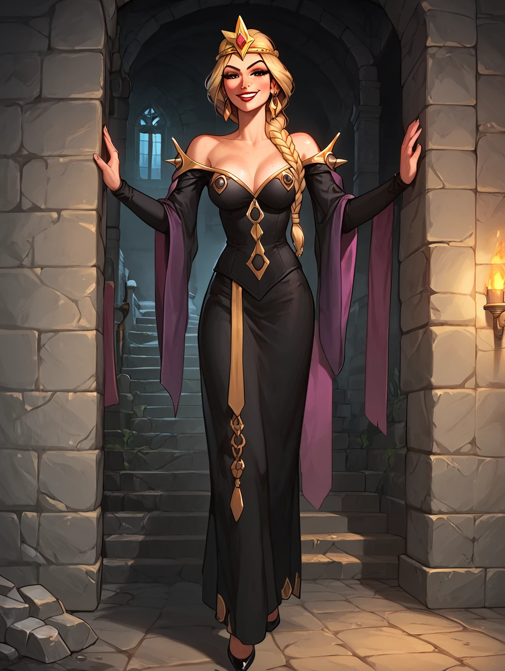 tall,evil smile,black top,black sleeves,black high heels, purple long skirt,gold crown,gold earrings,red lips,narrow waist,medium breasts,blonde hair,long braided ponytail,