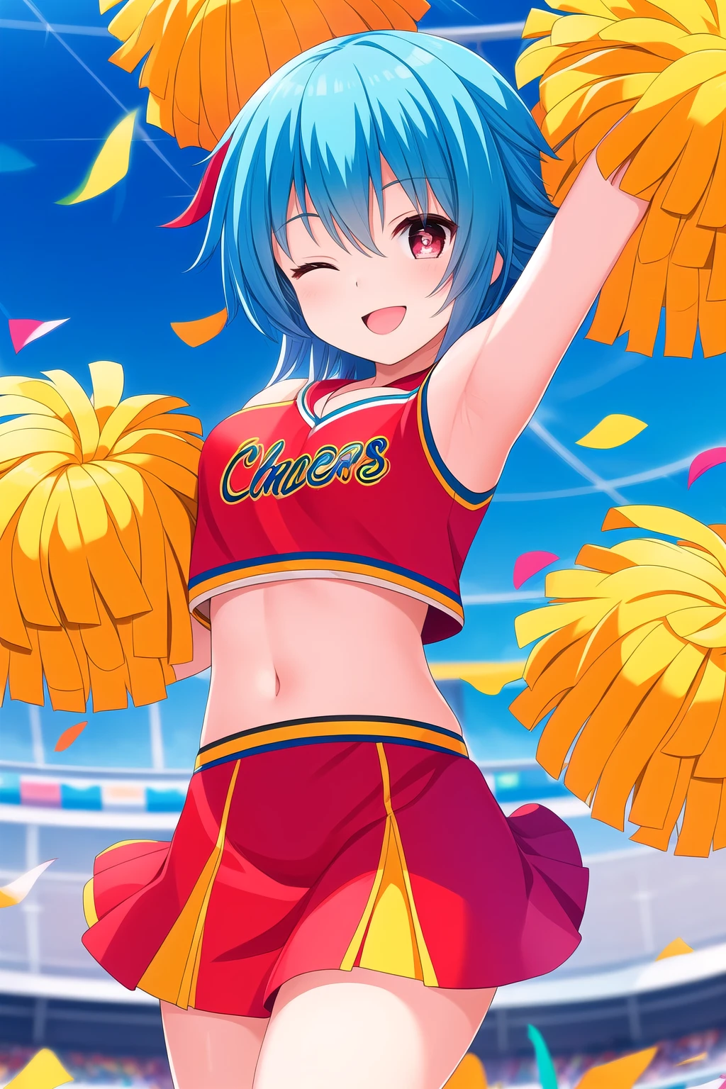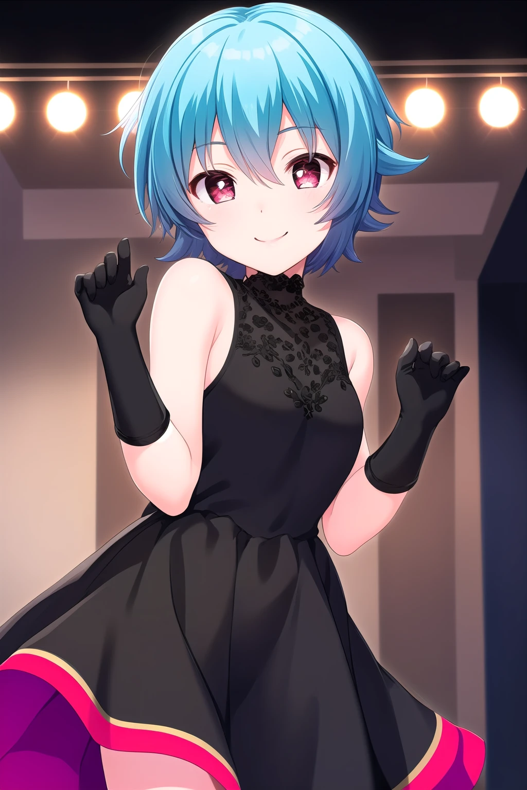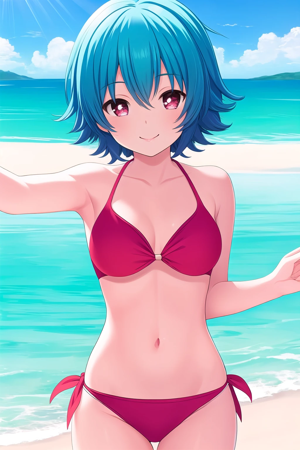 blue hair, hair between eyes, short hair, red eyes, star-shaped pupils