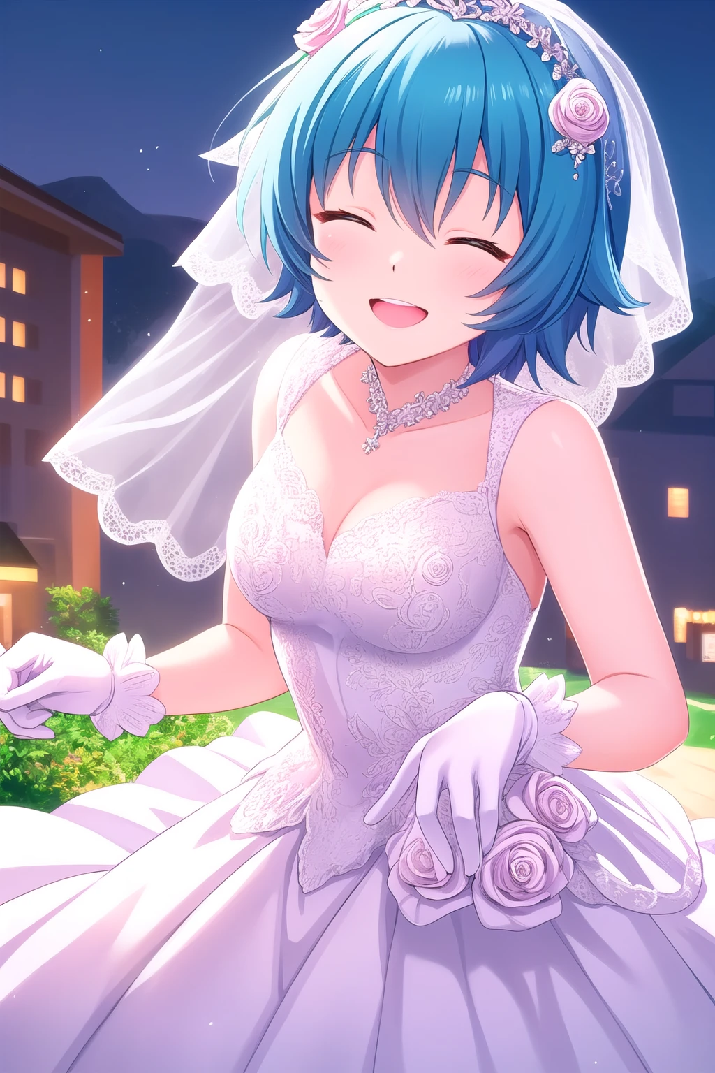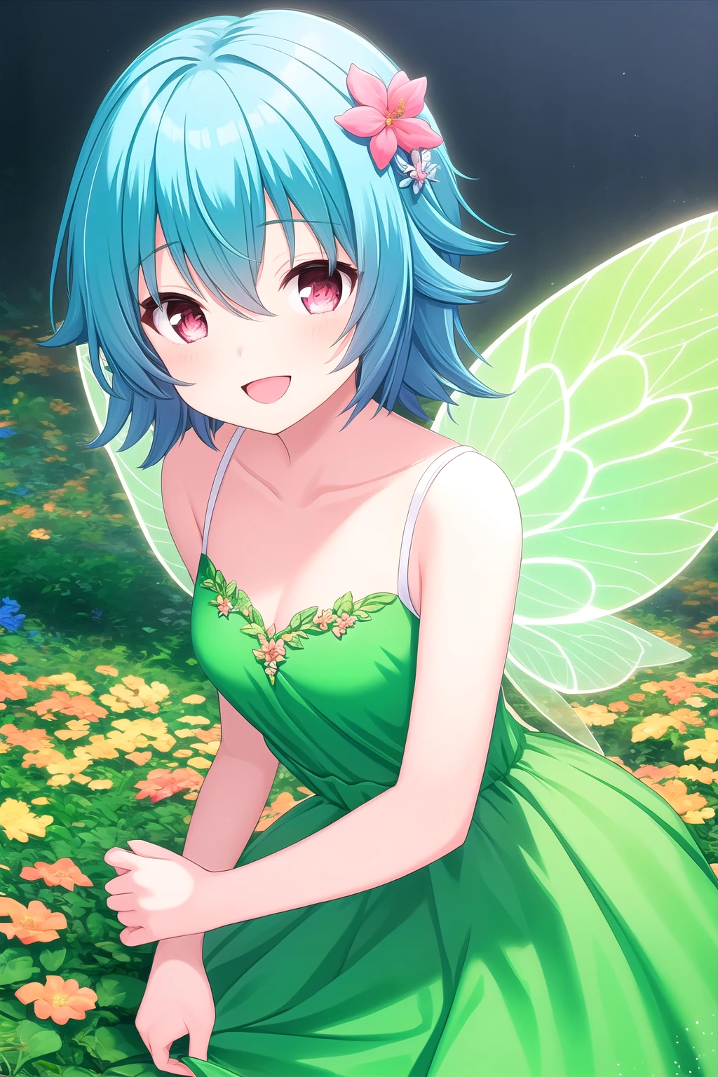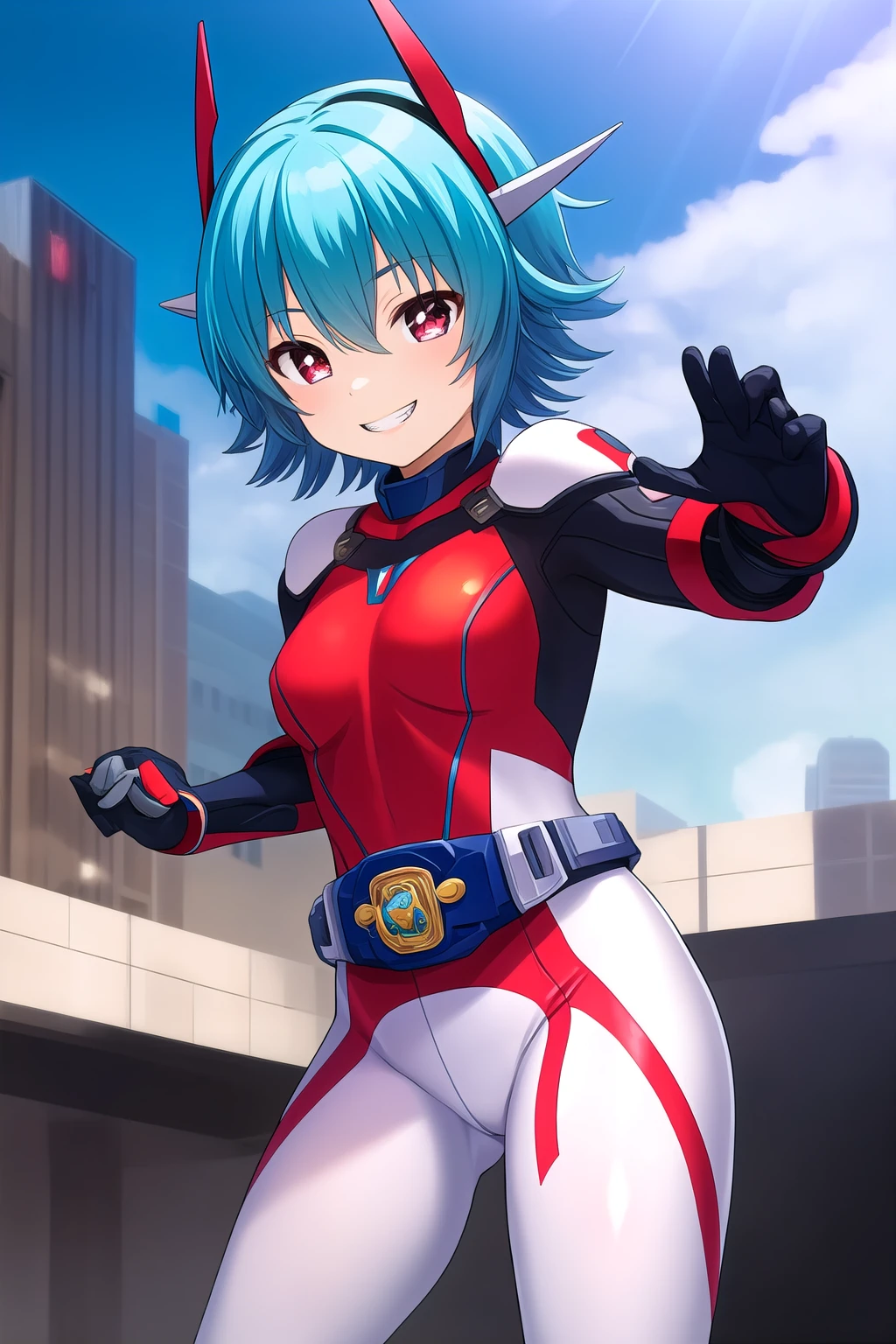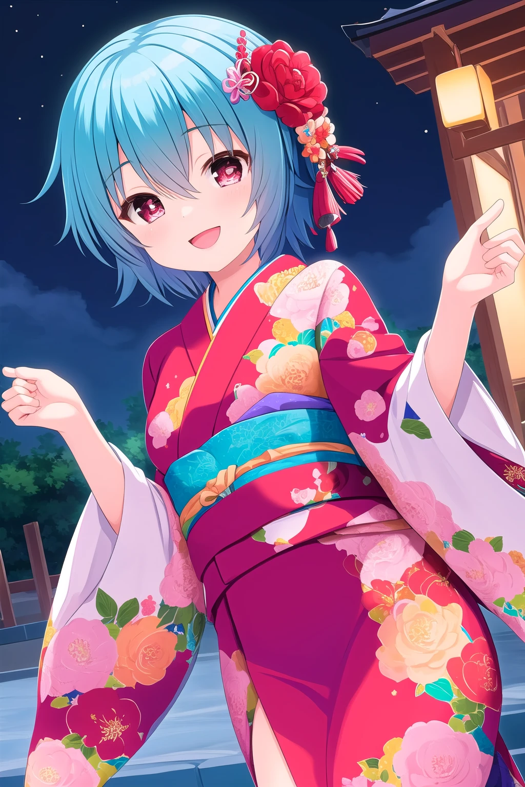 blue hair, hair between eyes, short hair, red eyes, star-shaped pupils