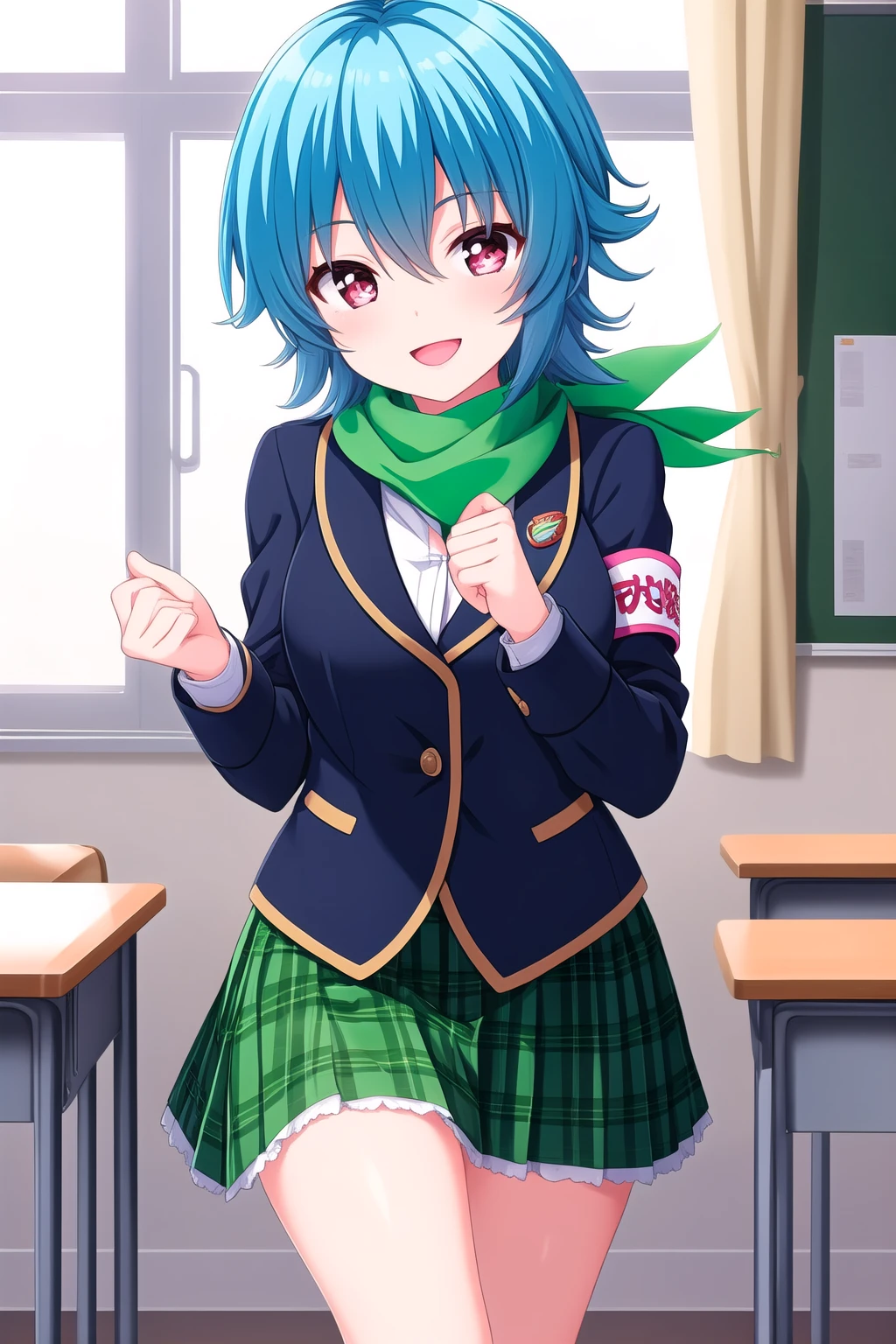 blue jacket, blazer, green scarf, white shirt, armband, green skirt, plaid skirt, school uniform