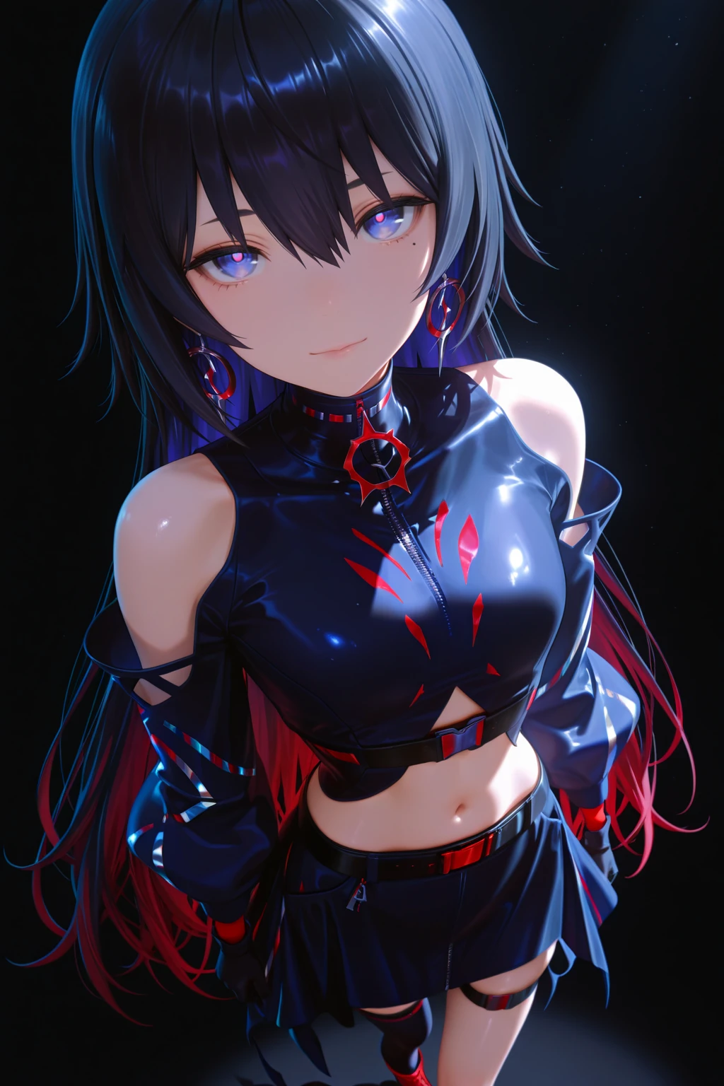 koko\(kamitsubaki studio\),vwp,v.w.p,long hair,black hair,red hair strands,Underlights,blue eyes,((black pupils)),earrings,((mole under left eye)),lower eyelashes,black gloves,black jacket,multicolored jacket,puffy long sleeves,black dress,red zipper pull tab,belt,navel,clothing cutout,bare shoulders,stomach cutout,shoulder cutout,asymmetrical legwear,uneven legwear,thigh strap,red footwear,