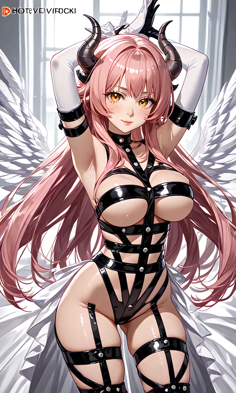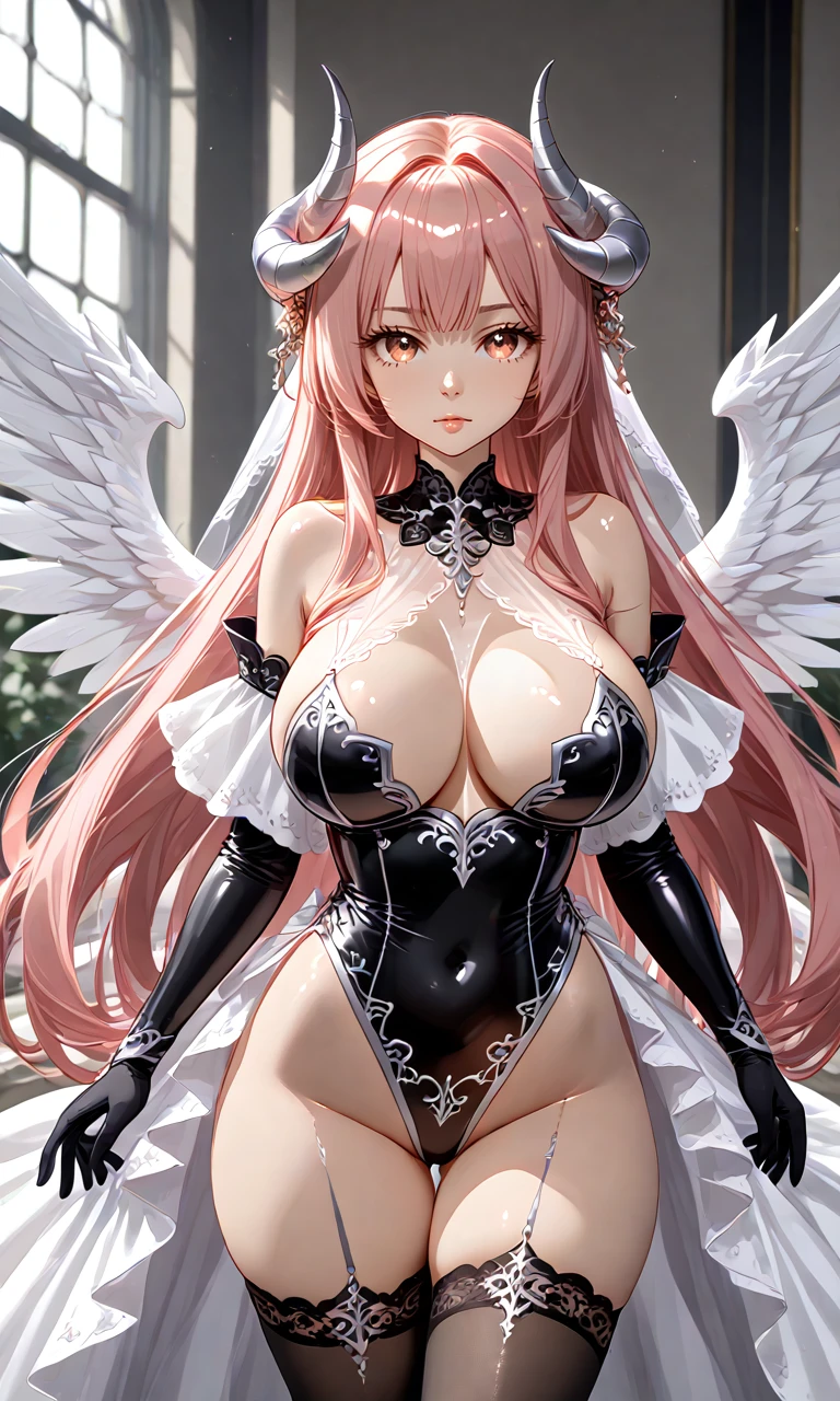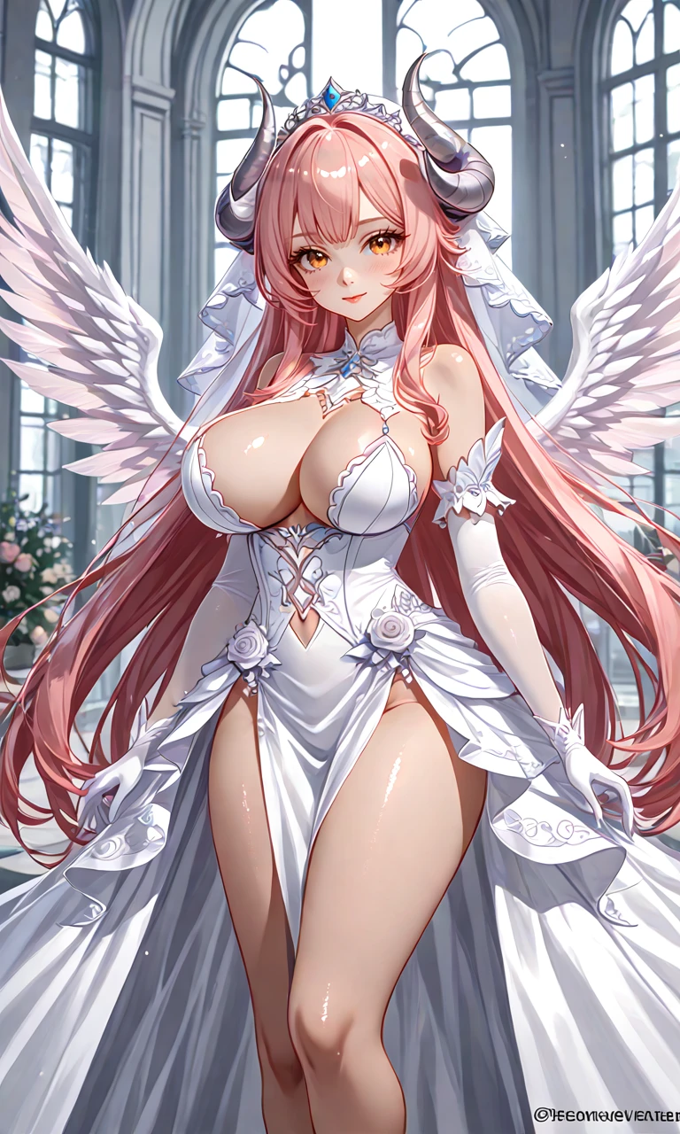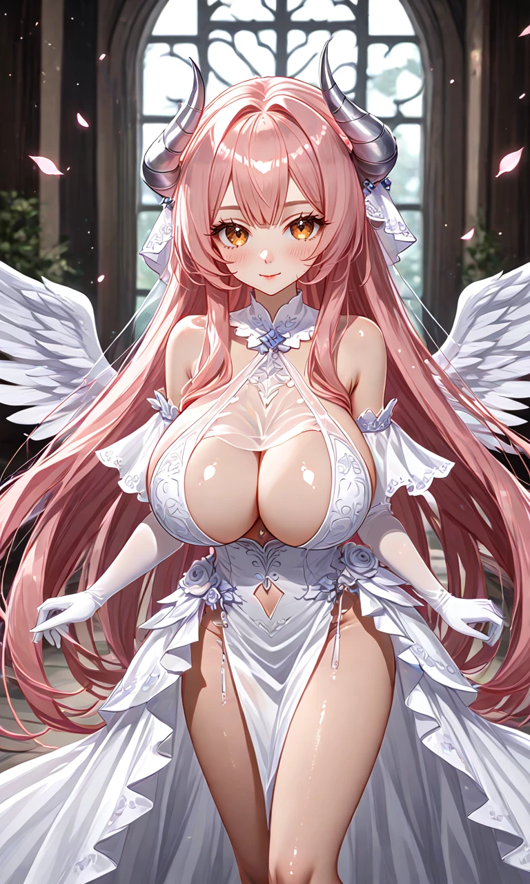 1girl, breasts, solo, shiny, long hair, gloves, shiny skin, shiny hair, pink hair, wings, white gloves, horns, bangs, elbow gloves, looking at viewer, dress, bare shoulders, large breasts, white dress, see-through