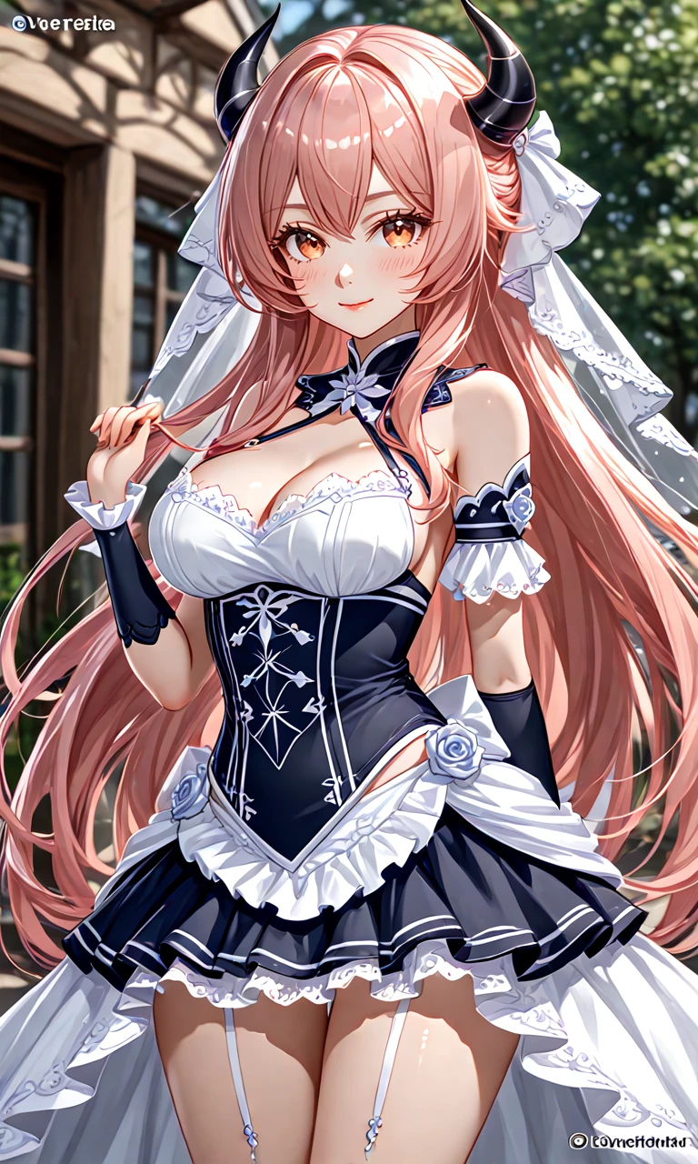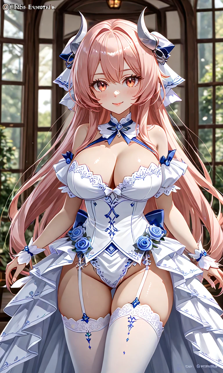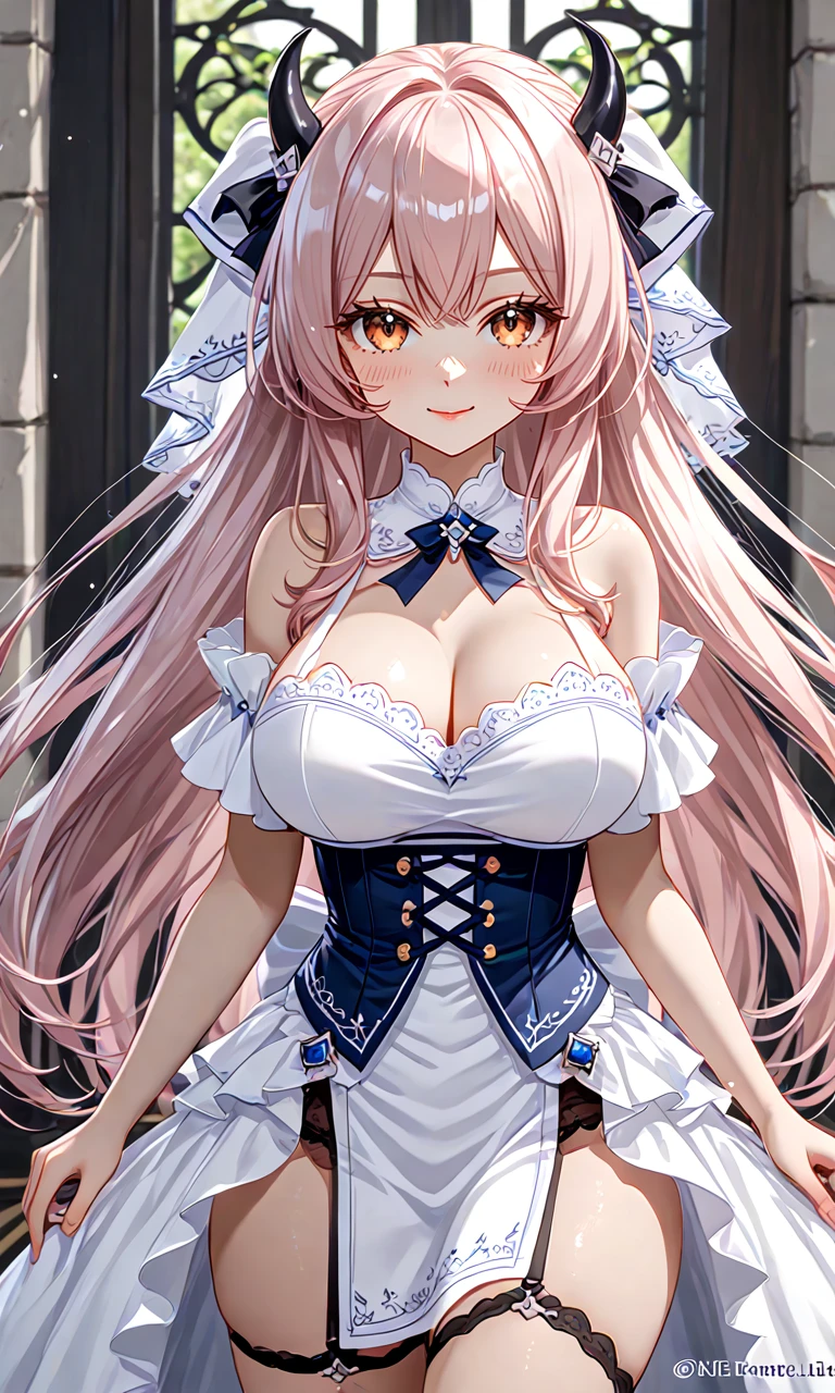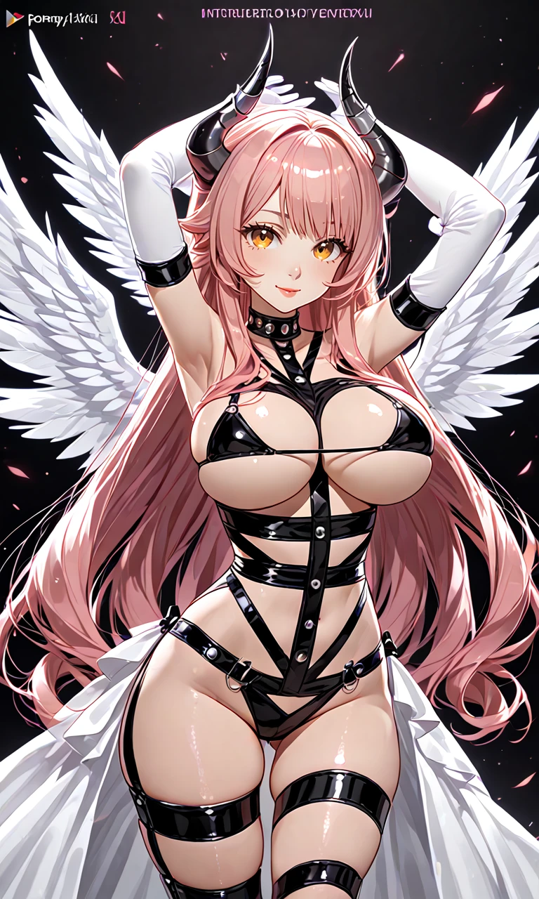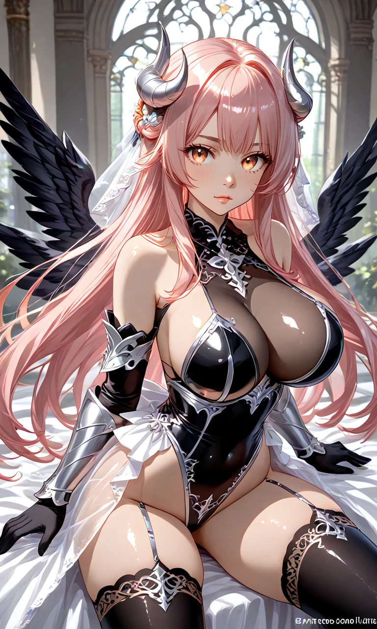 1girl, breasts, solo, shiny, long hair, gloves, shiny skin, shiny hair, pink hair, wings, white gloves, horns, bangs, elbow gloves, looking at viewer, dress, bare shoulders, large breasts, white dress, see-through