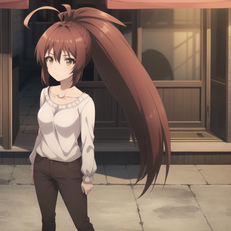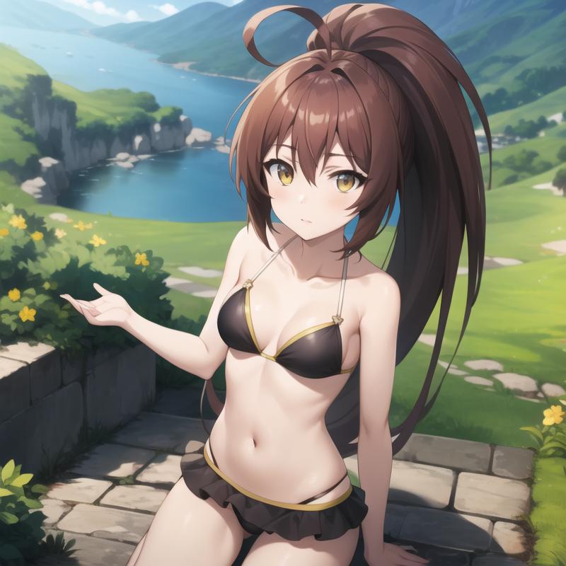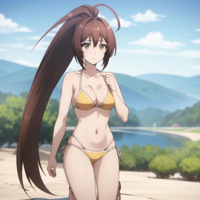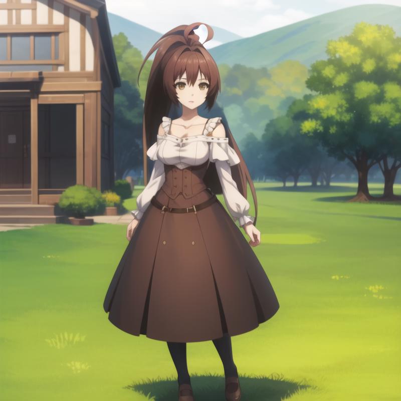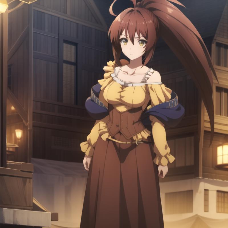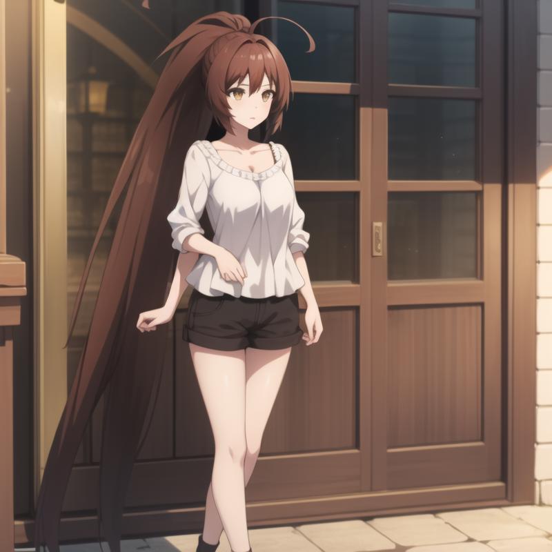 Trigger Word: icm-rin, long hair, brown hair, pony tail, blue eyes, ahoge, yellow shirt brown corset short shorts blue cape