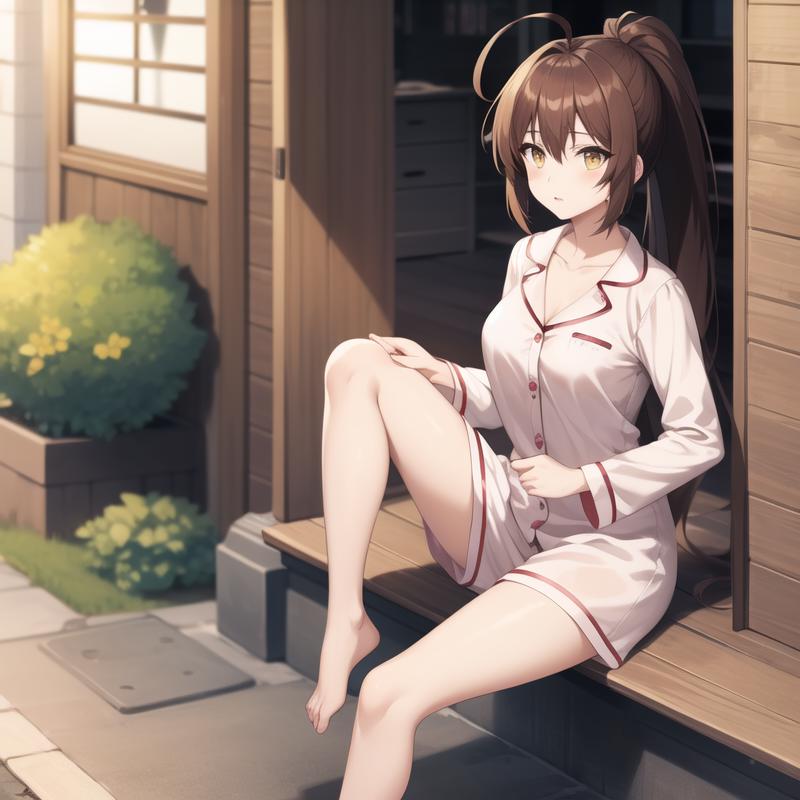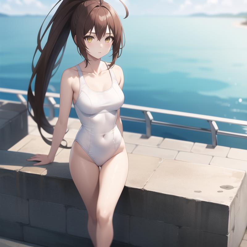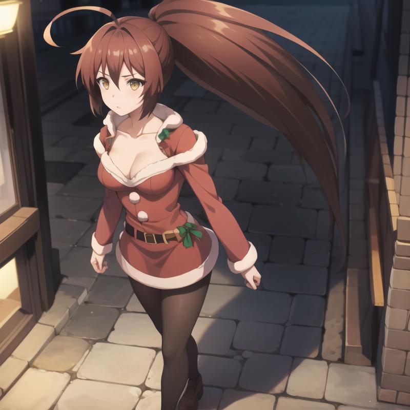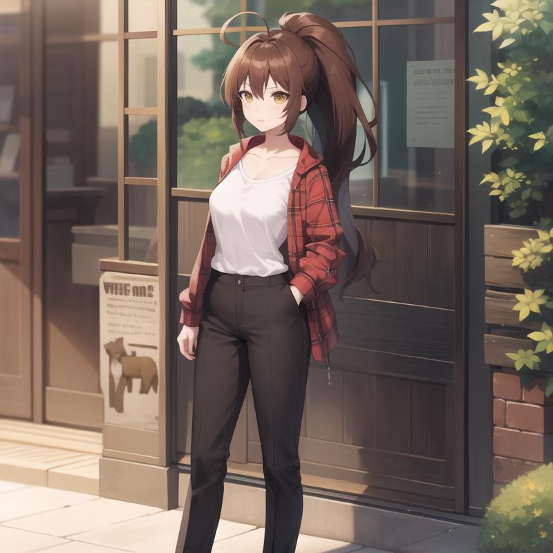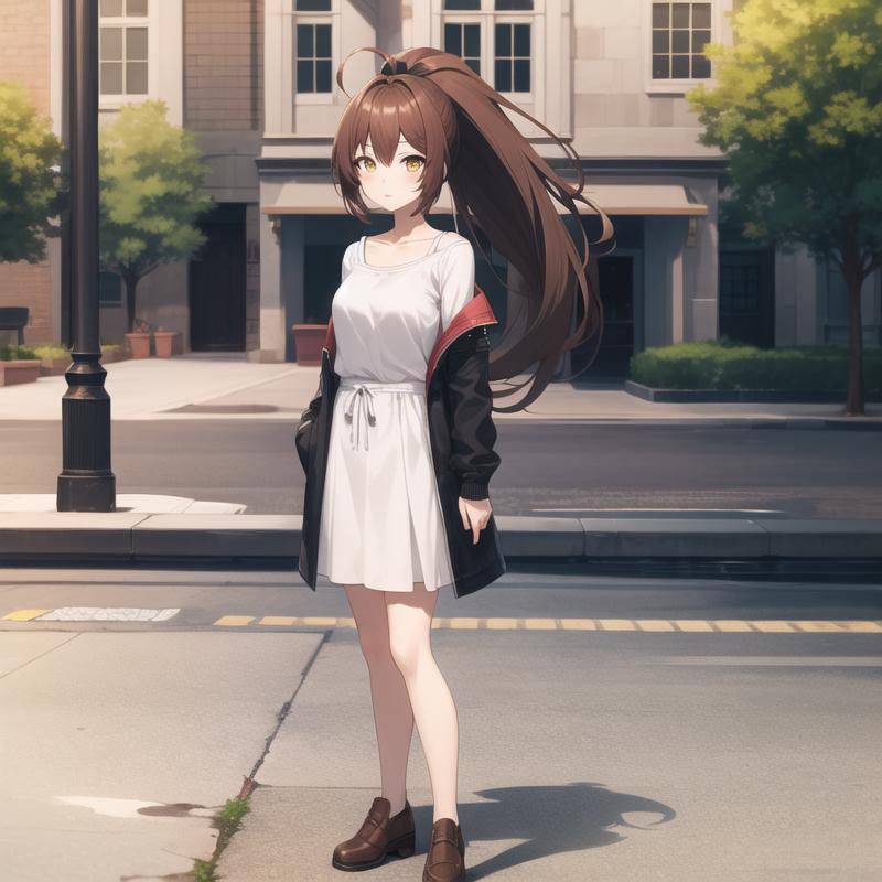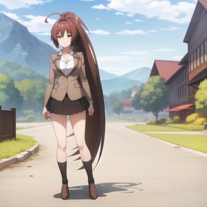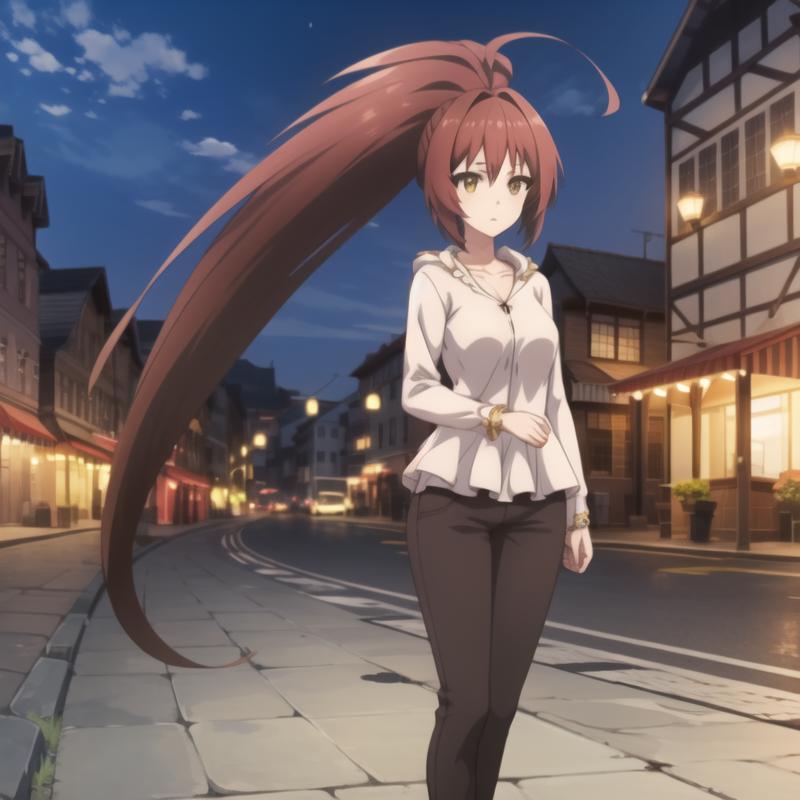 Trigger Word: icm-rin, long hair, brown hair, pony tail, blue eyes, ahoge, yellow shirt brown corset short shorts blue cape
