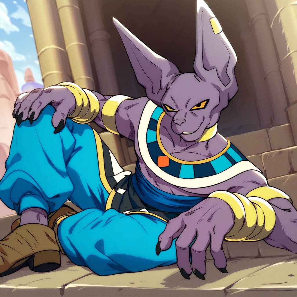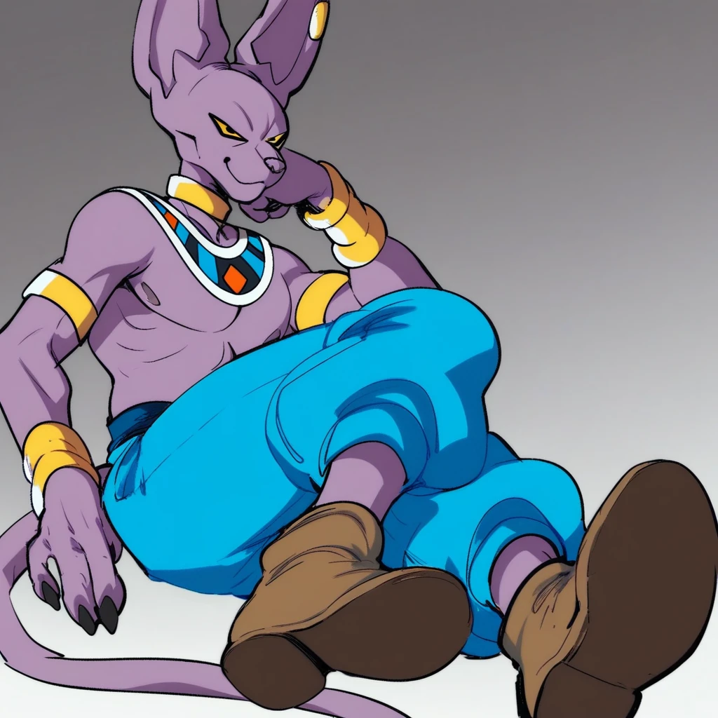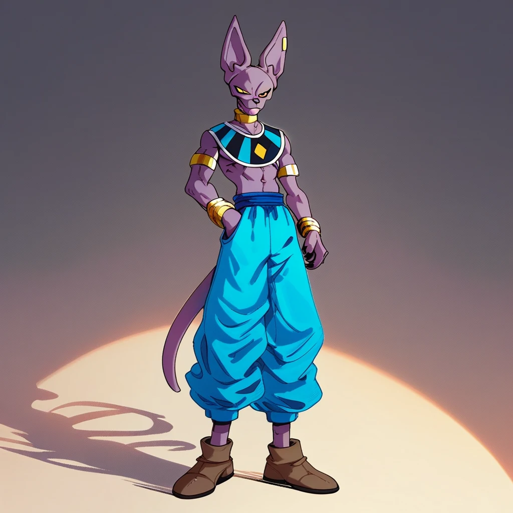 Beerus, anthro, male, cat, purple skin, yellow eyes, tail, slim, thin body