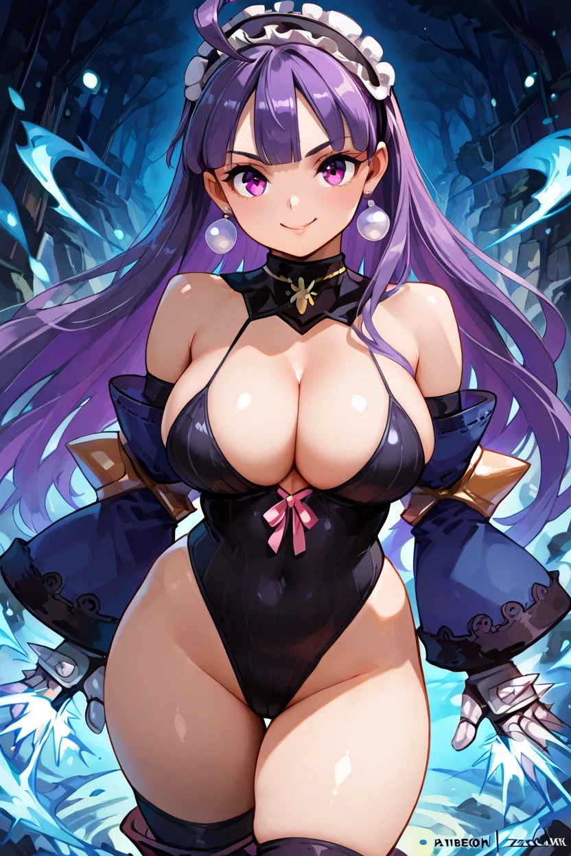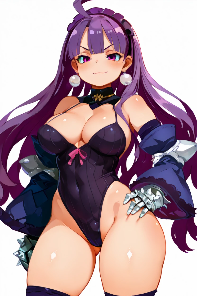 zzEclair, long hair, purple hair, earrings, detached sleeves, thighhighs, cleavage, highleg, gauntlets, highleg leotard,