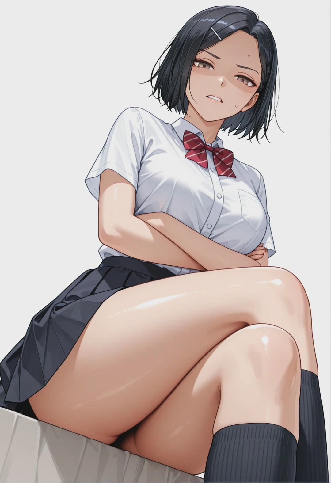 short sleeves, collared shirt, striped bowtie, medium skirt, black skirt, black kneehighs,