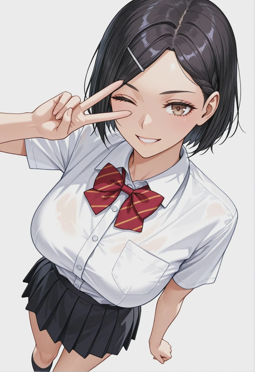 karu7gf, black hair, brown eyes, large breasts, short hair, bangs, hair ornament, hairclip,