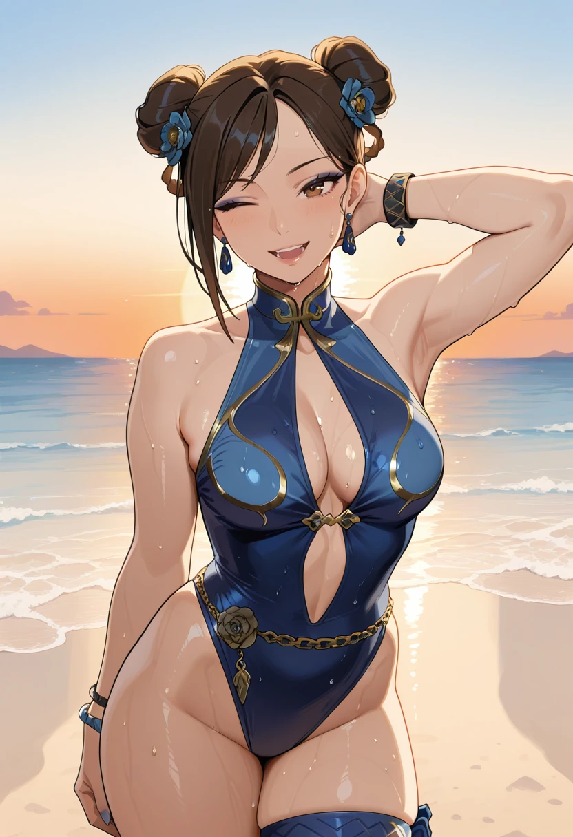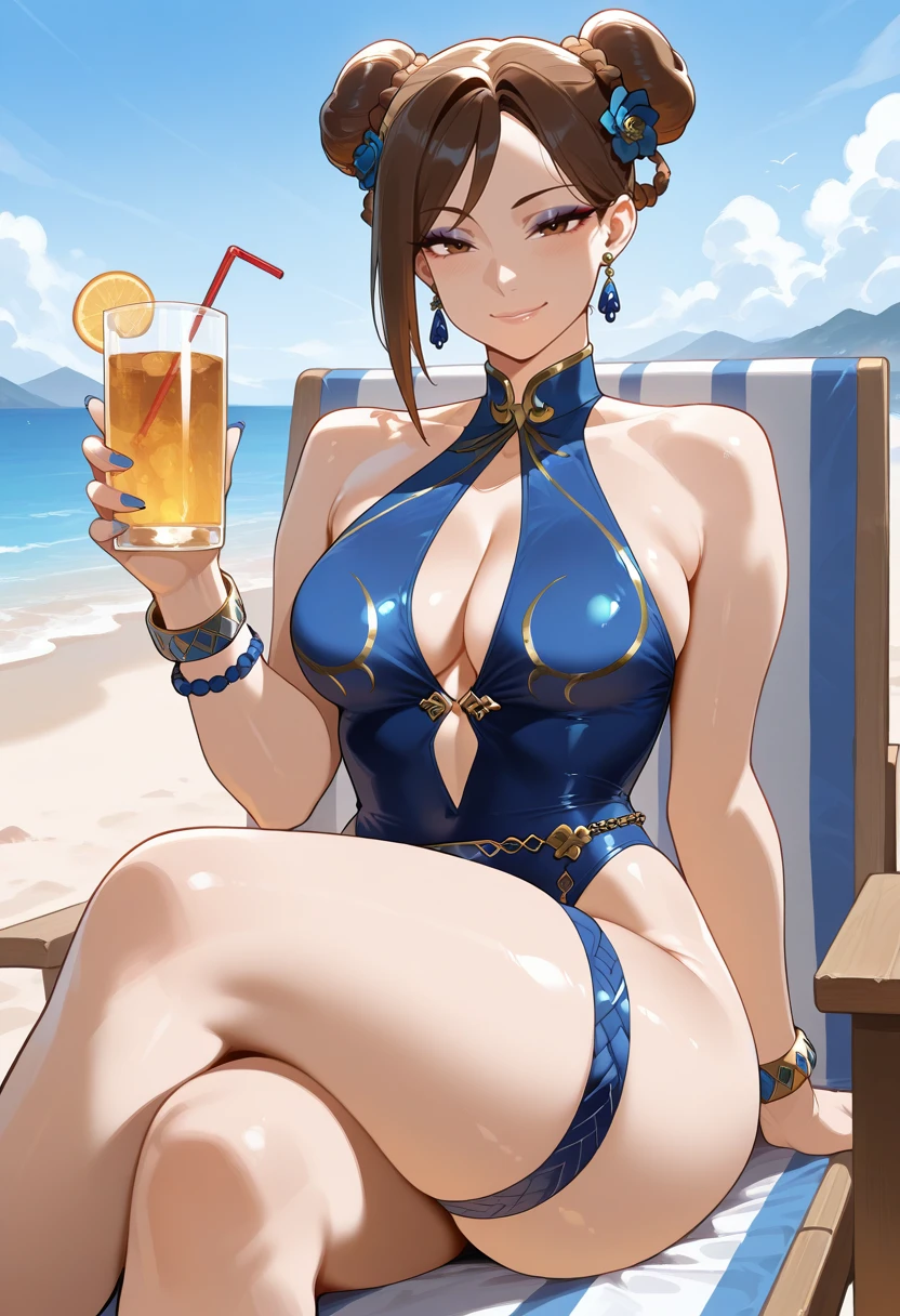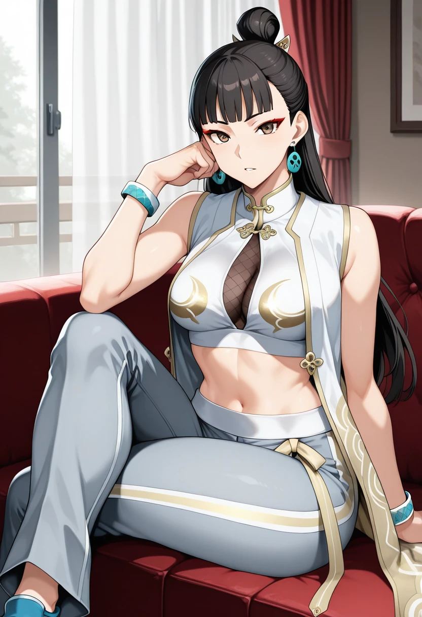 "CLIALPH, brown hair, double bun, hair ribbon, cropped sleeveless vest, blue bodysuit,black bracelet, spiked bracelet"