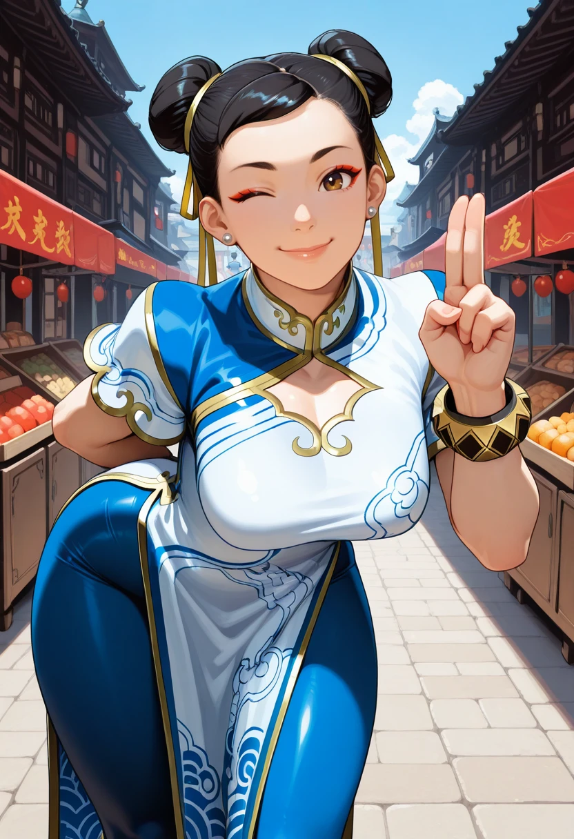 "CLICLASS, black hair, double bun, bun cover, blue china dress, puffy sleeves, short sleeves, pelvic curtain,spiked bracelet, black bracelet, pantyhose"