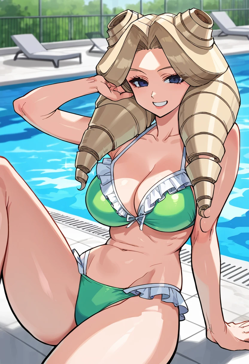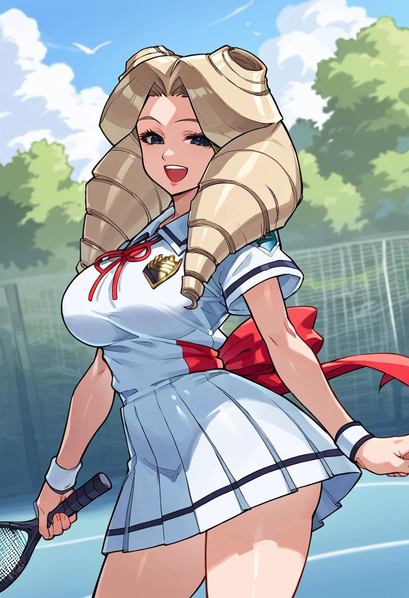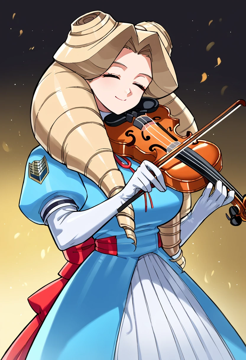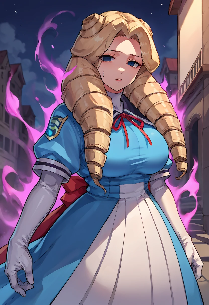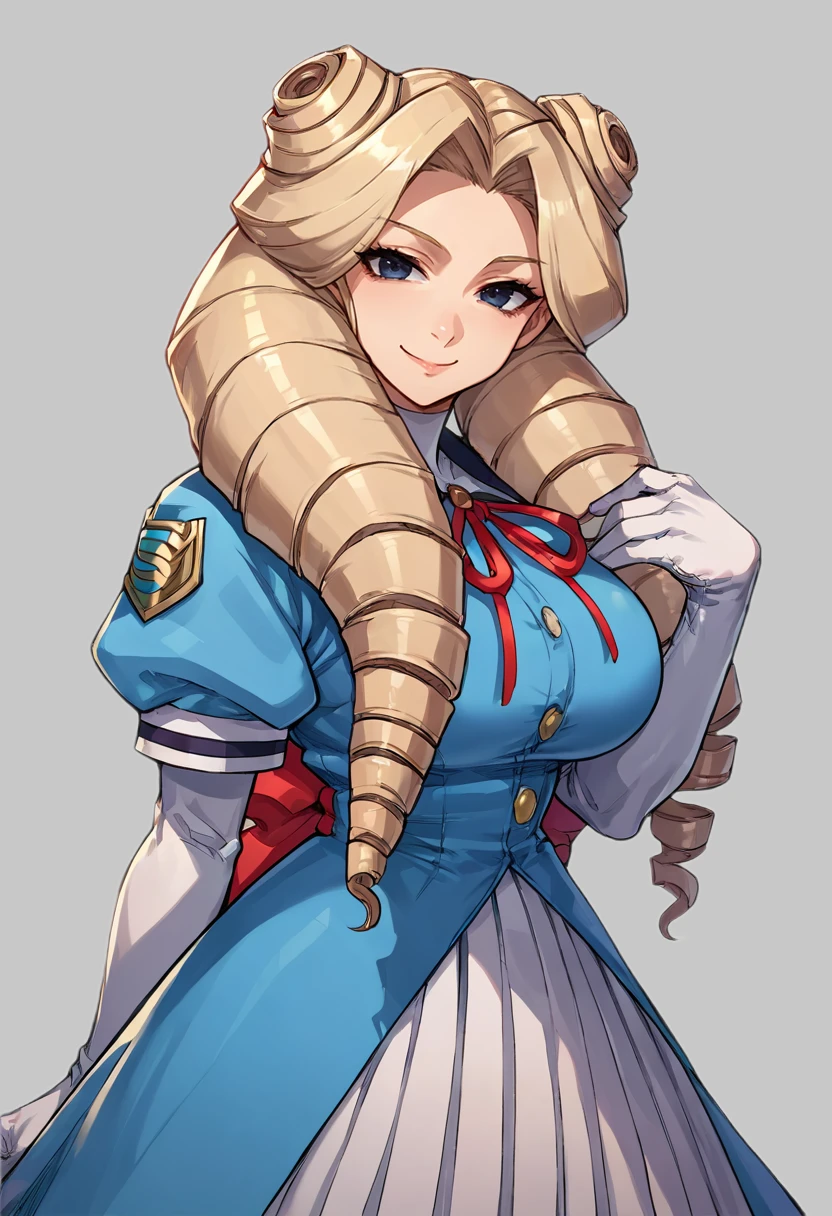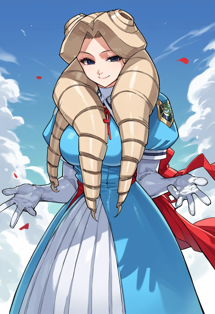 blue dress, white gloves, long skirt, pleated skirt, large breasts, curly hair, blonde hair, twin drills, blue eyes