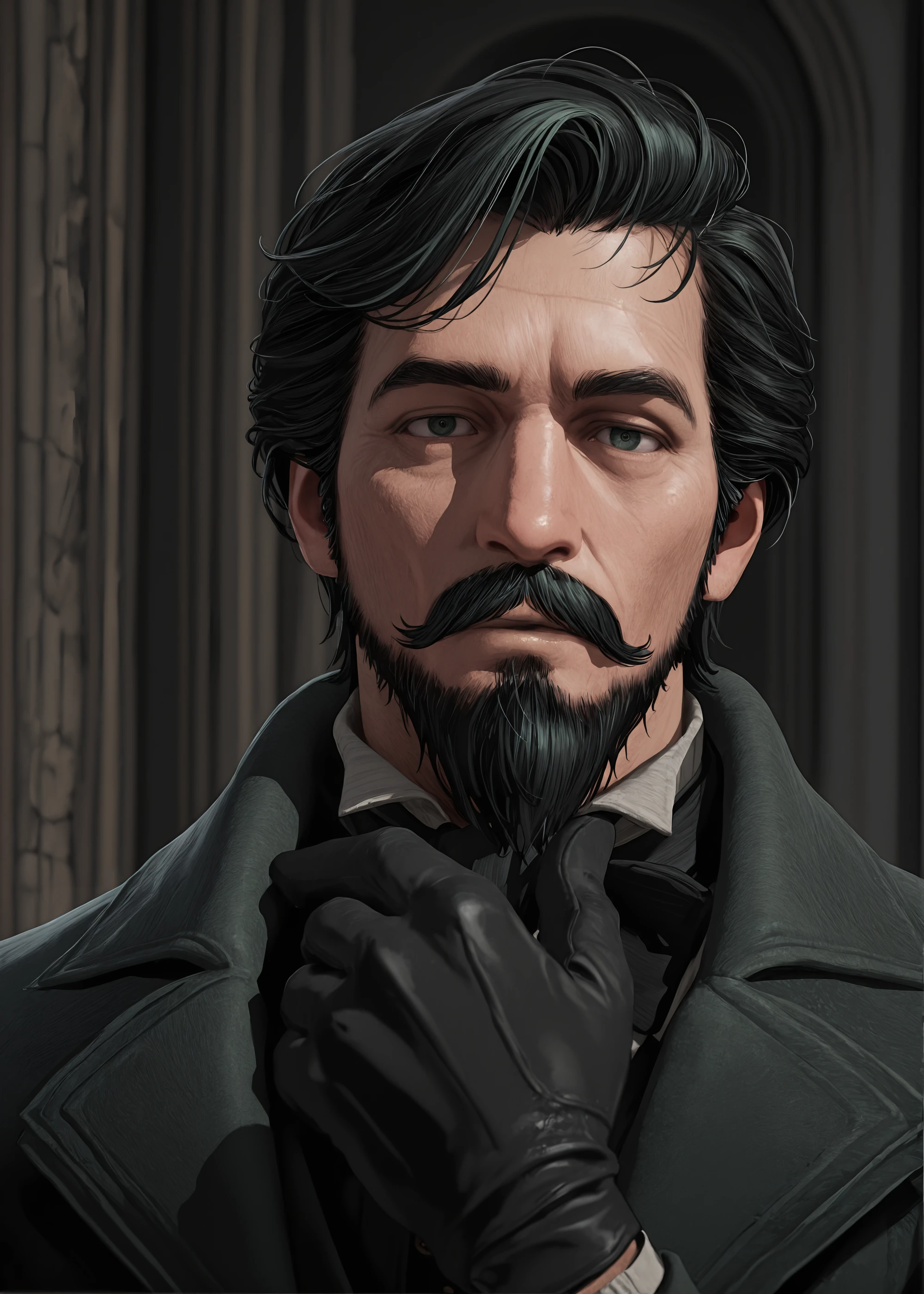 phineasnigellusblack, black gloves, beard, mustache, black hair, dark green coat,