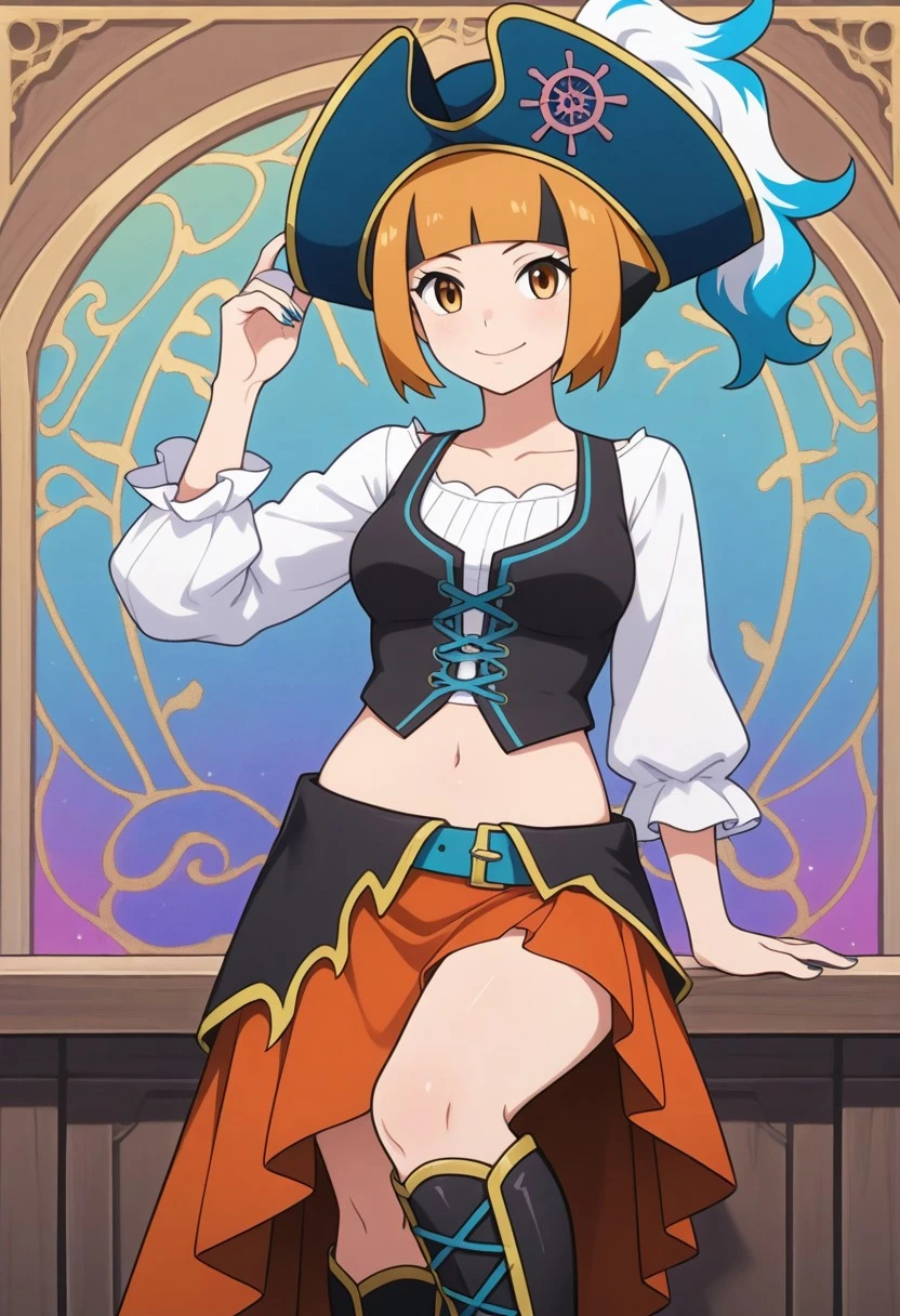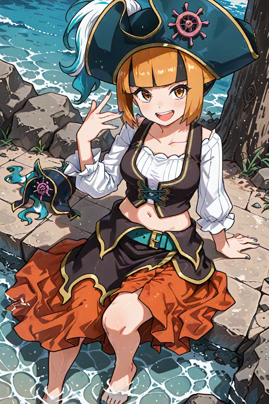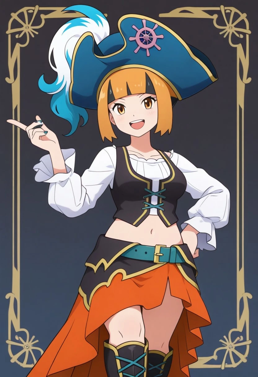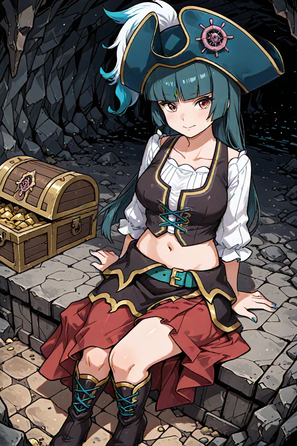 pirate hat, blue headwear, hat feather, pirate, white shirt, long sleevees, blue nails, vest, midriff, navel, belt, skirt, high heel boots, knee boots, black footwear