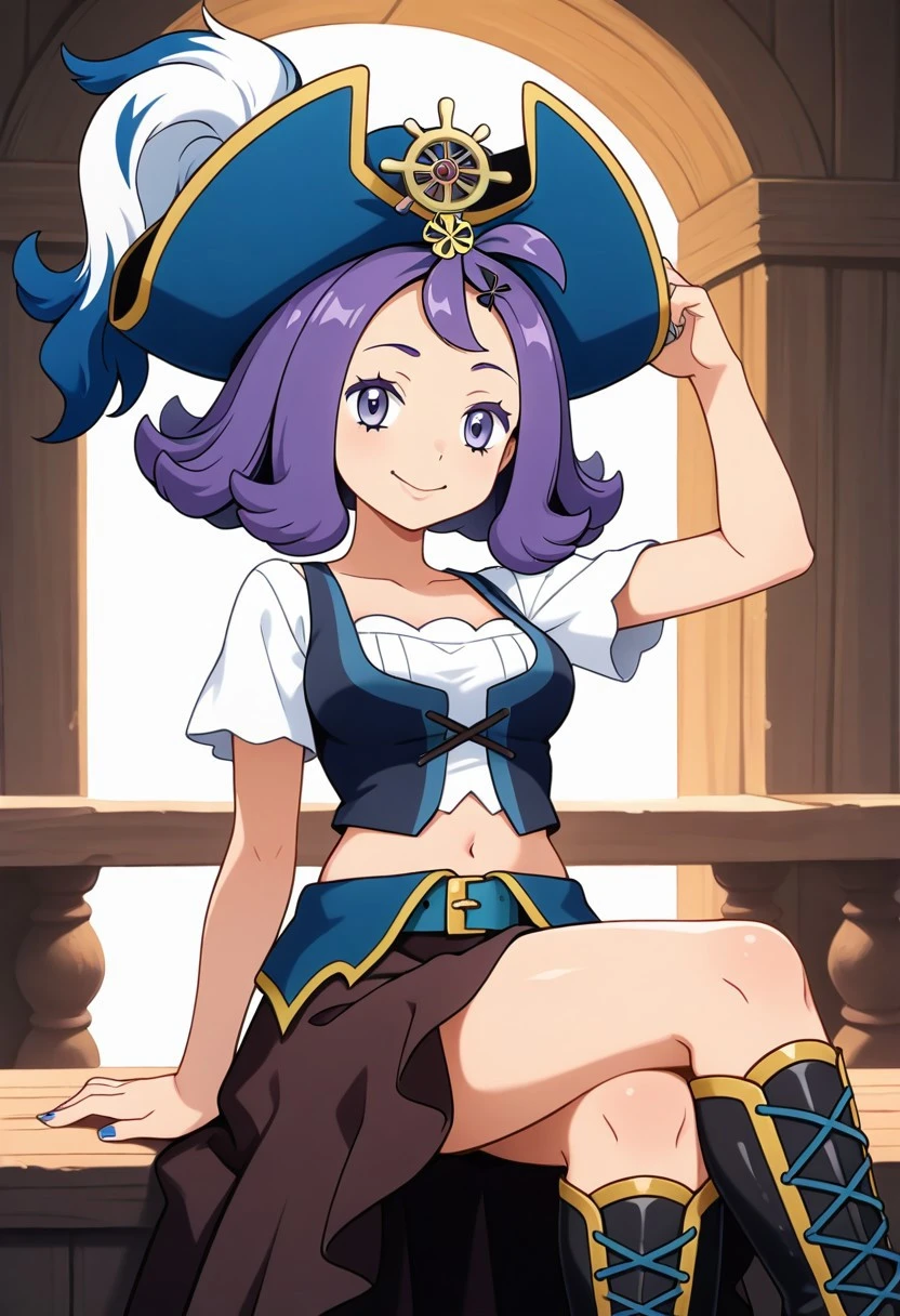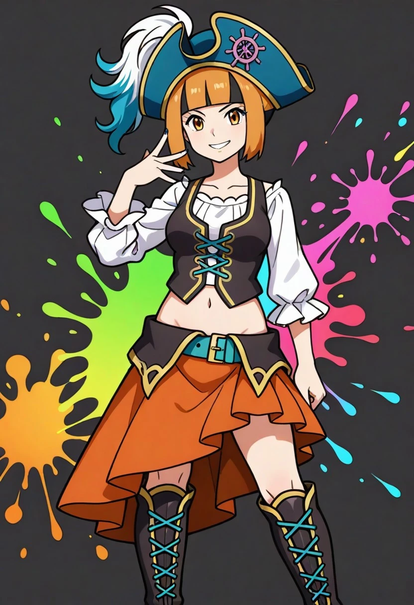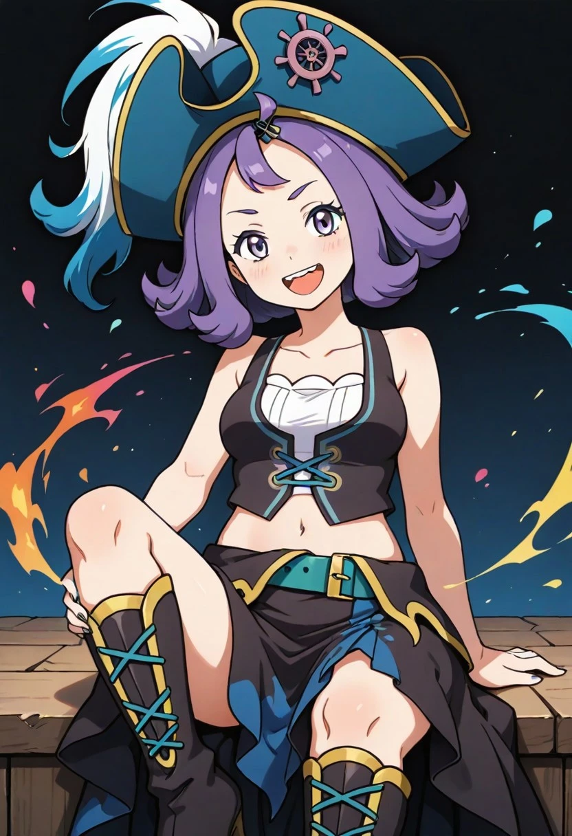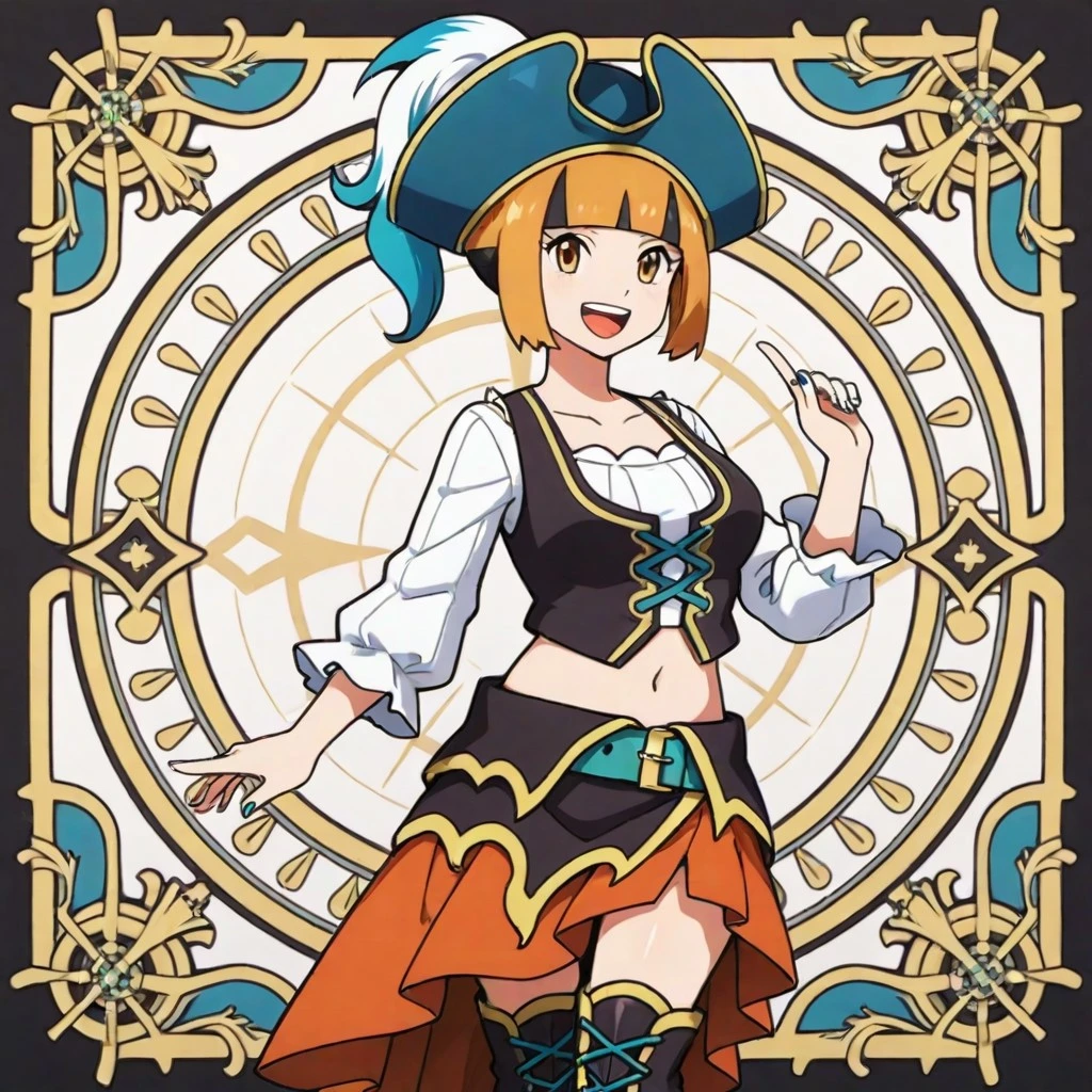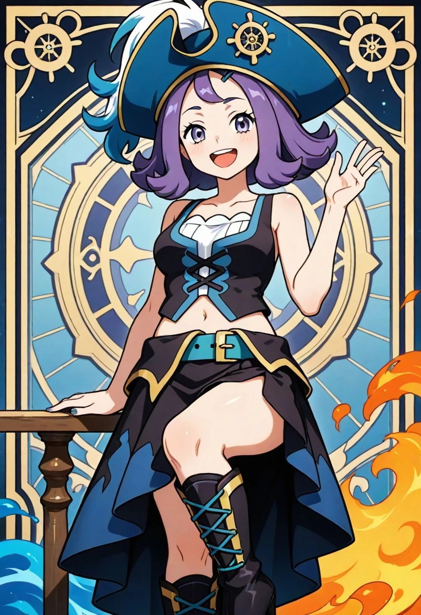 pirate hat, blue headwear, hat feather, pirate, white shirt, long sleevees, blue nails, vest, midriff, navel, belt, skirt, high heel boots, knee boots, black footwear