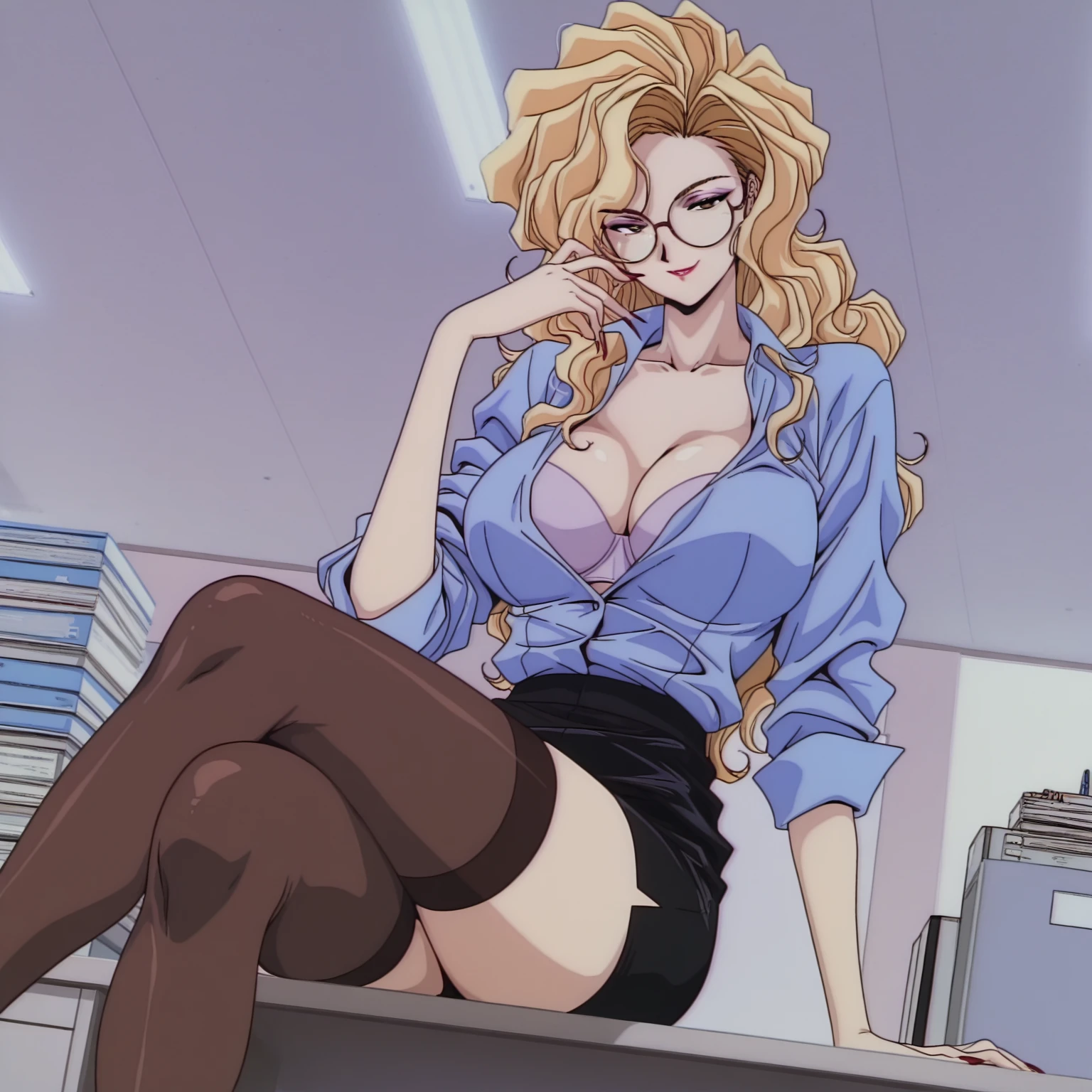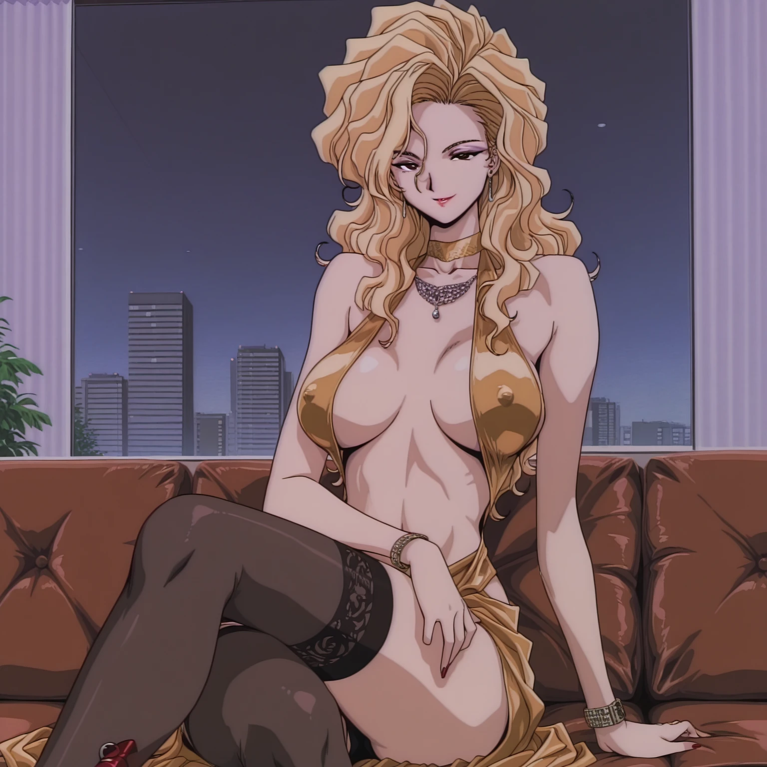 blonde hair, long hair, curly hair, brown eyes, large breasts, lipstick, eyeliner, slender, anime screencap, retro artstyle