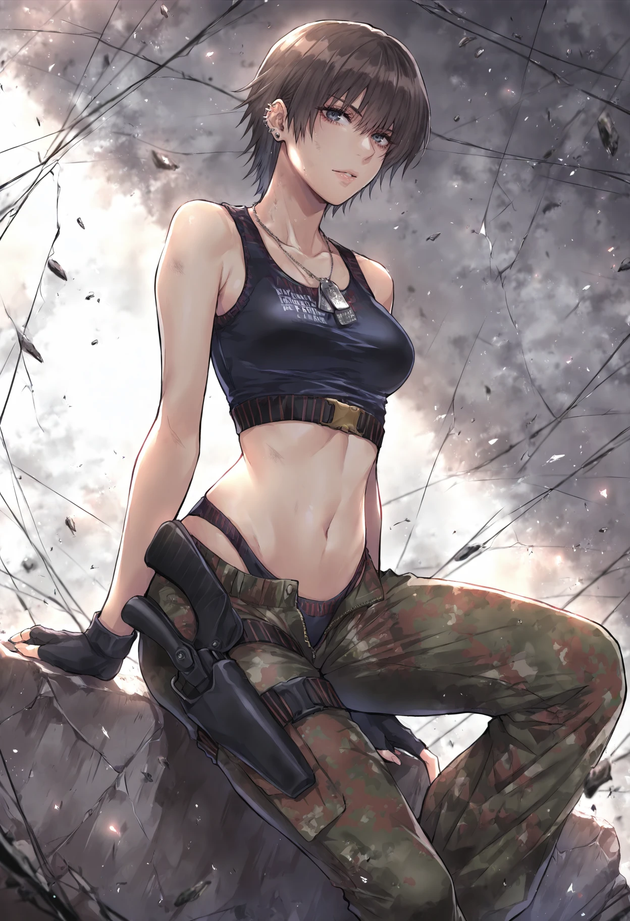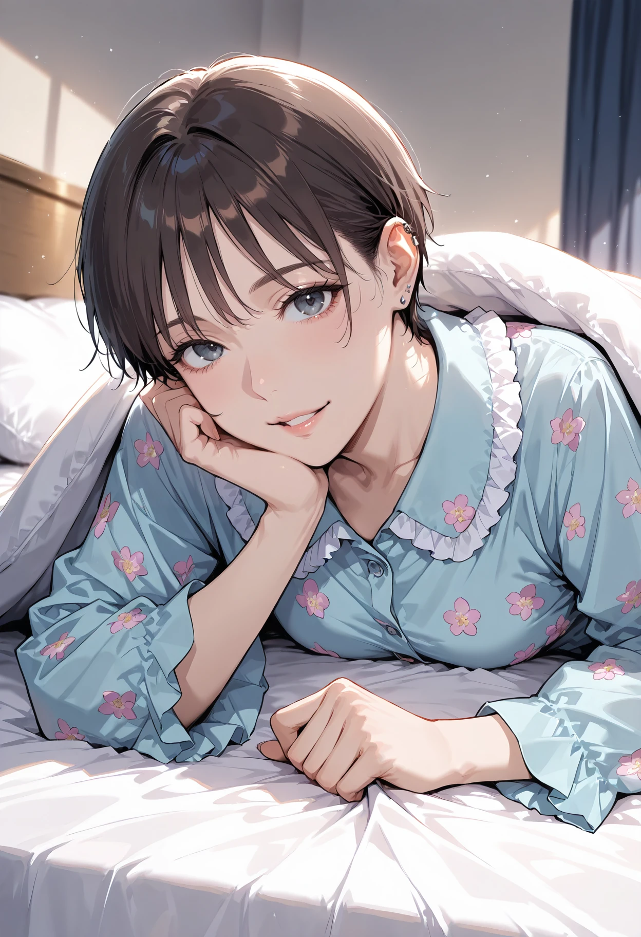 1girl,blue eyes,grey eyes,brown hair,black hair,black eyes,short hair,bangs,ear piercing