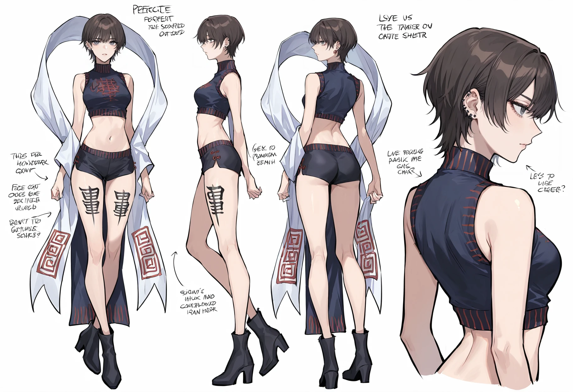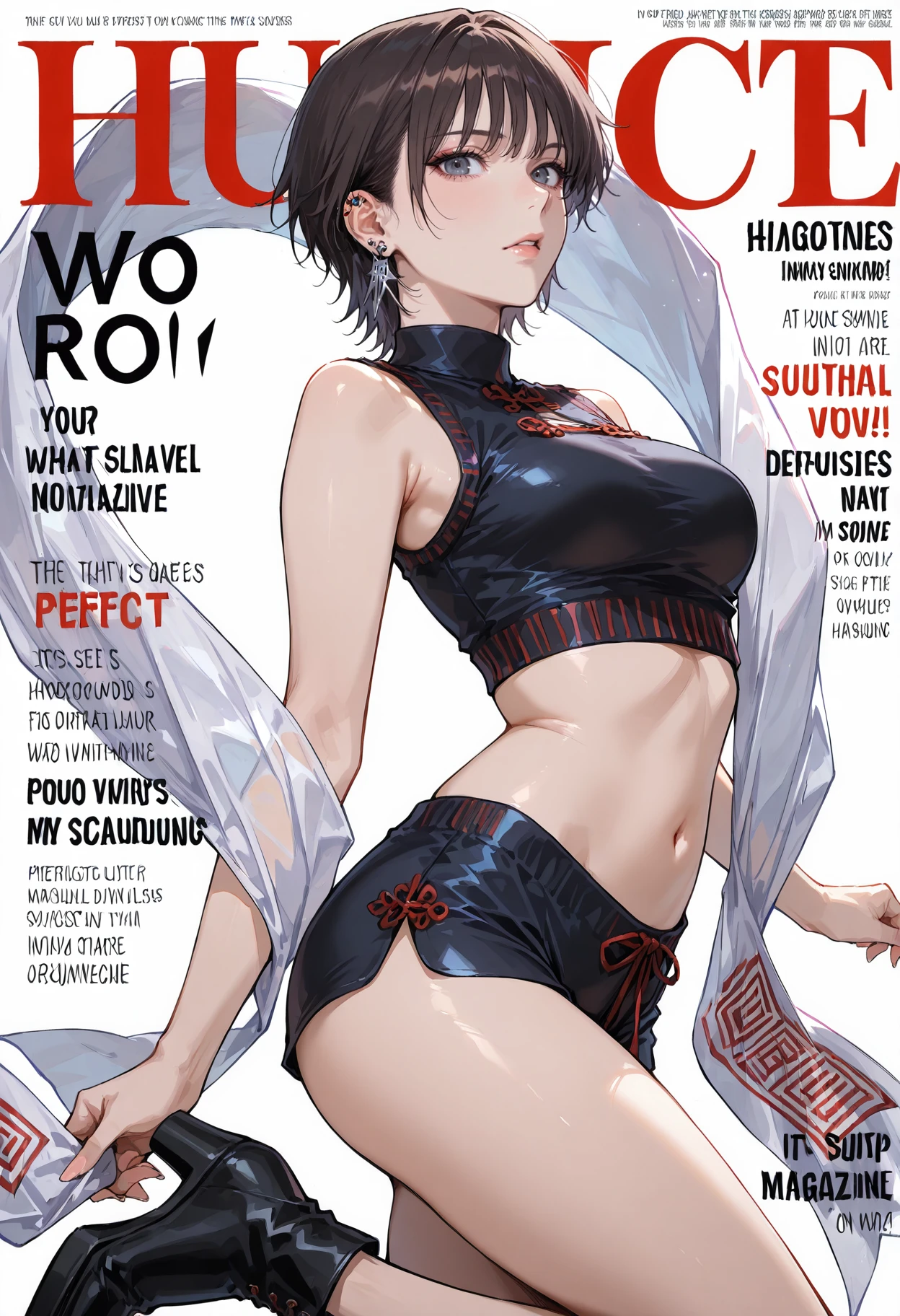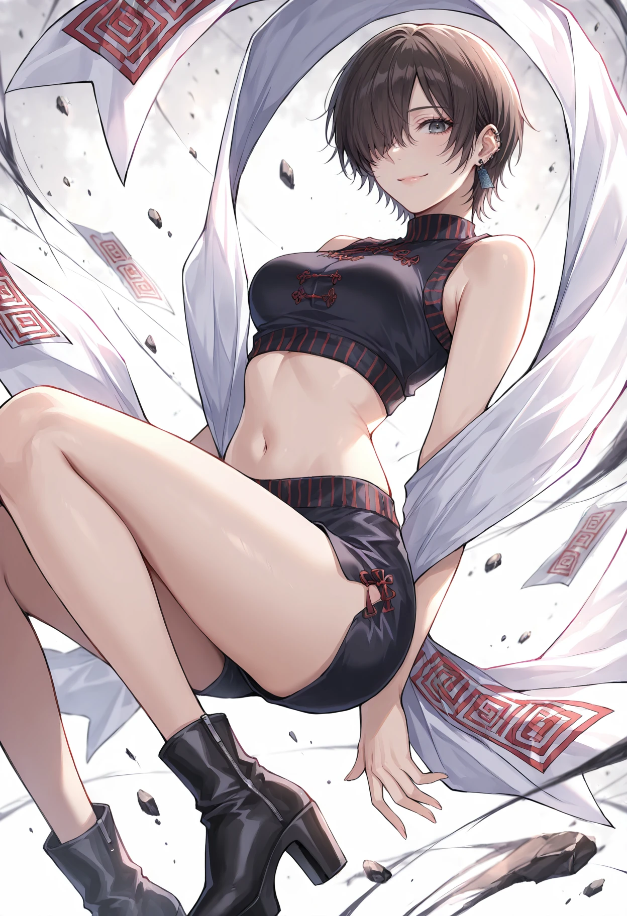 crop top,midriff,shawl,black footwear,bare shoulders,high heels,piercing,sleeveless,ofuda,jewelry,earrings,breasts,shorts,bare legs,chinese clothes,bare arms,medium breasts,black shorts,shirt,short shorts,boots,turtleneck,underwear,hagoromo,leg tattoo