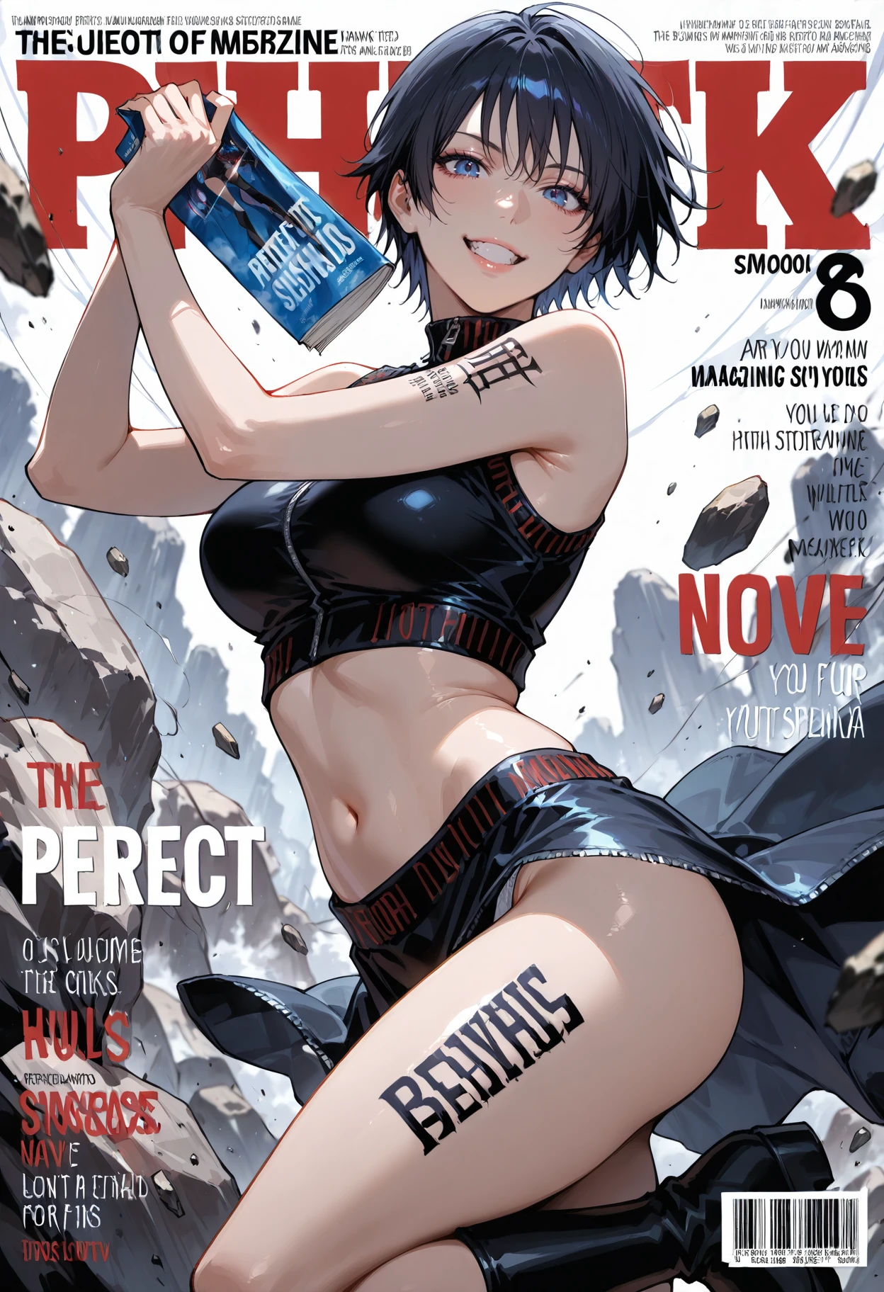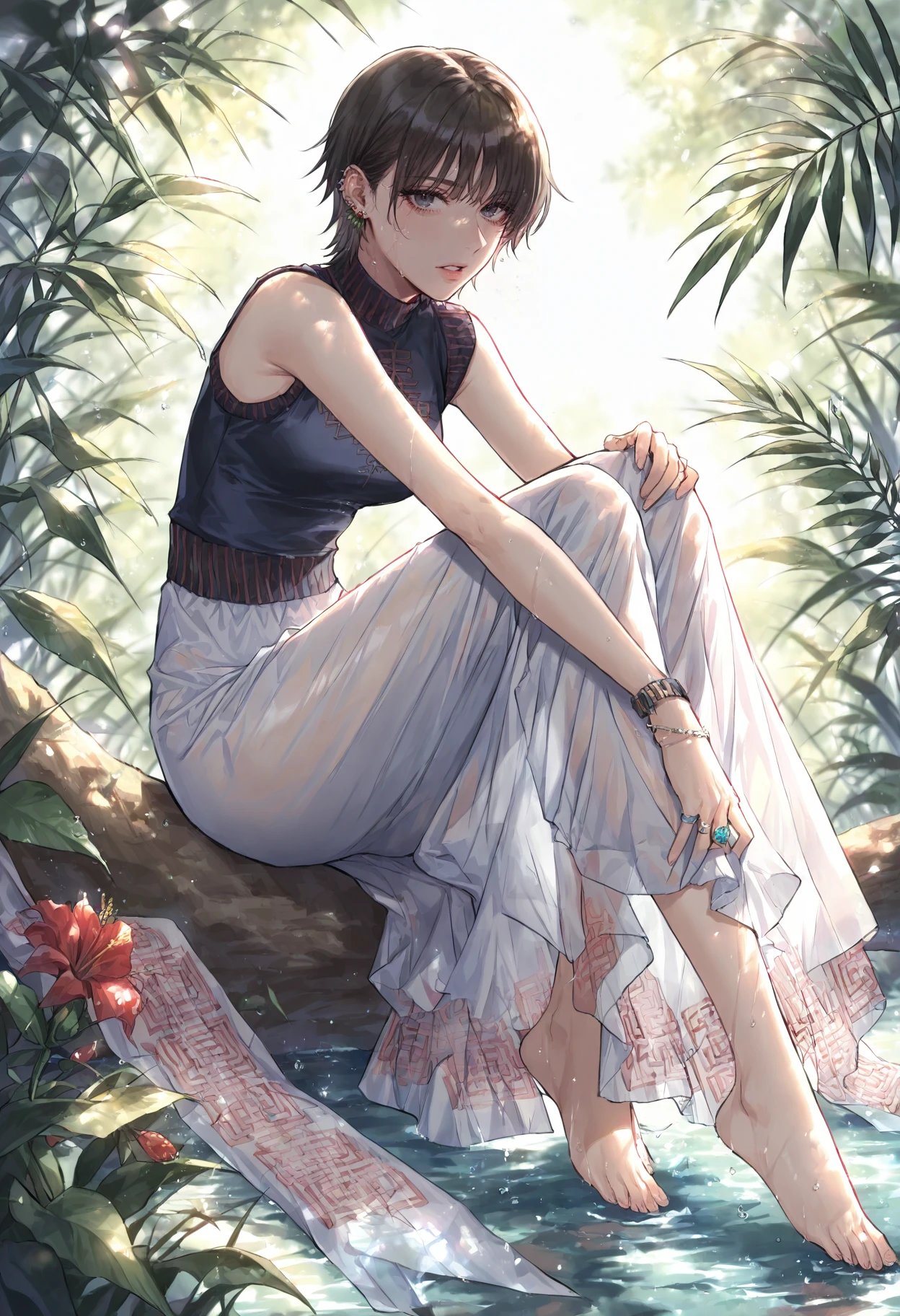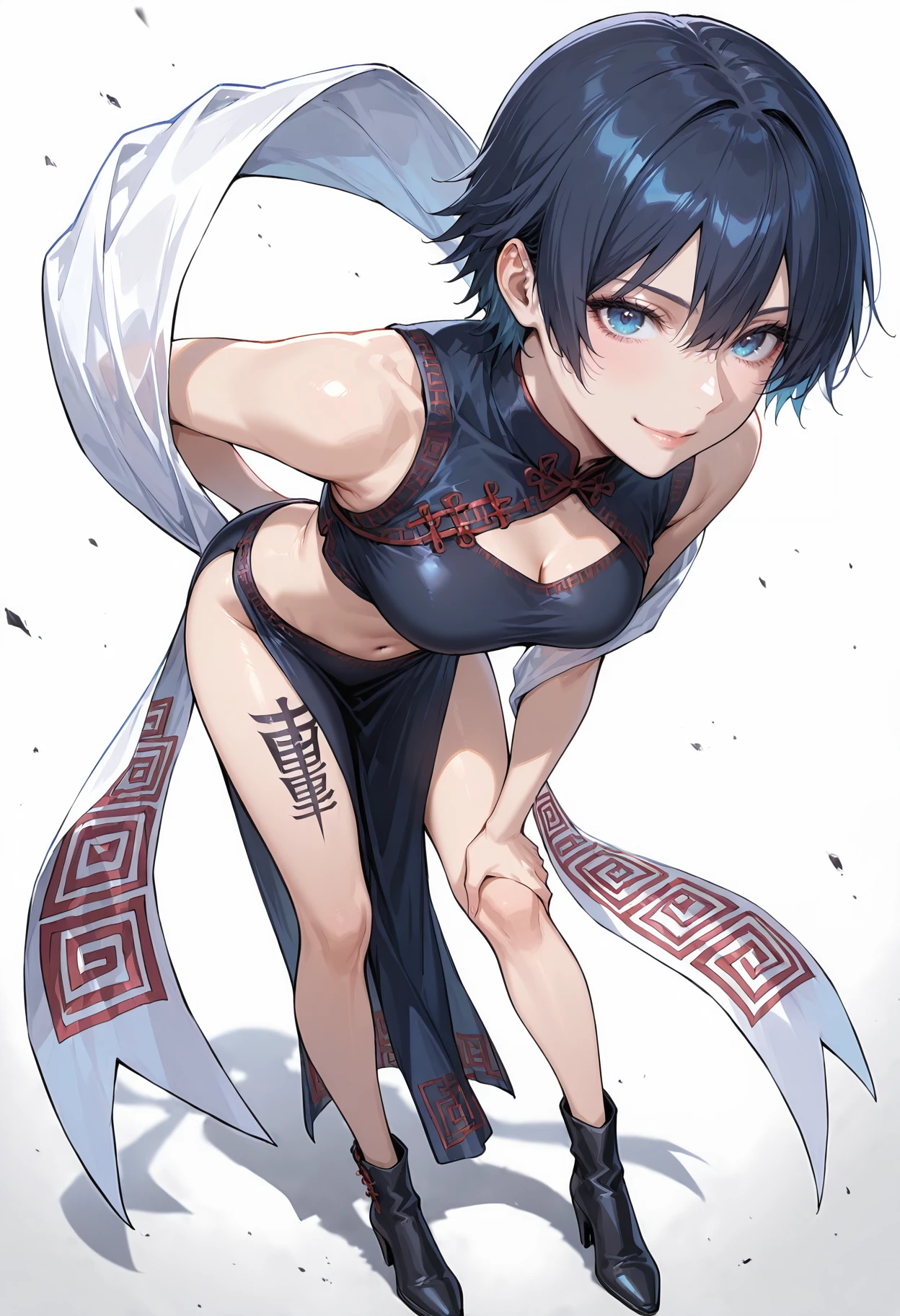 crop top,midriff,shawl,black footwear,bare shoulders,high heels,piercing,sleeveless,ofuda,jewelry,earrings,breasts,shorts,bare legs,chinese clothes,bare arms,medium breasts,black shorts,shirt,short shorts,boots,turtleneck,underwear,hagoromo,leg tattoo