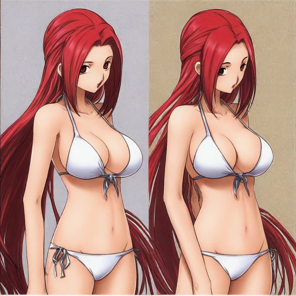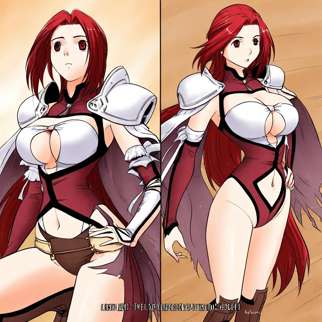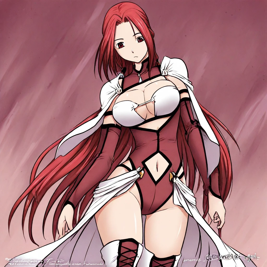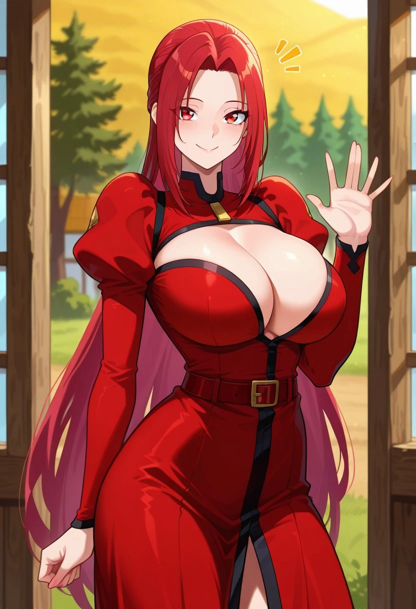 red hair, very long hair, parted hair, forehead, red eyes, large breasts,