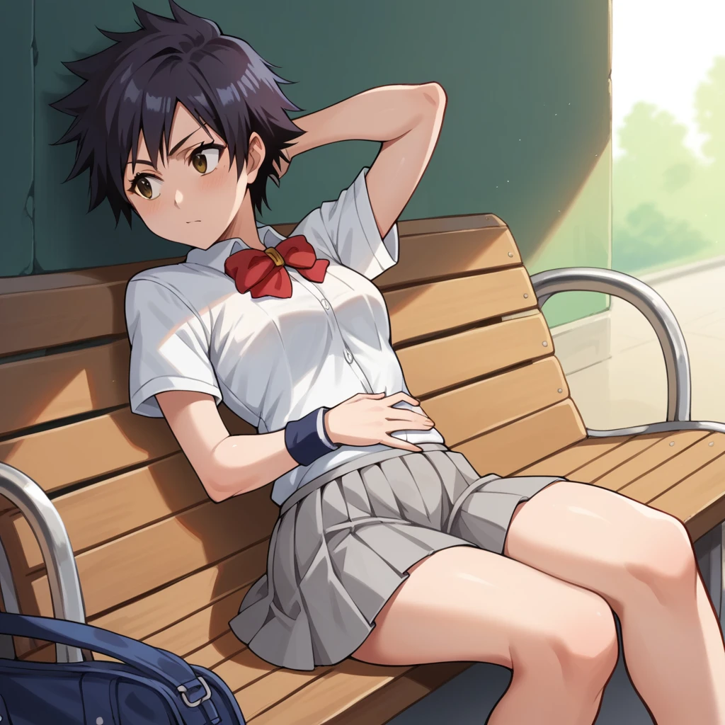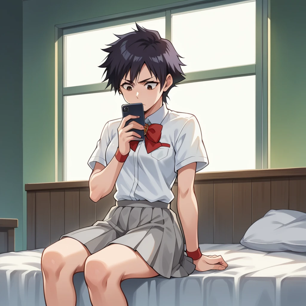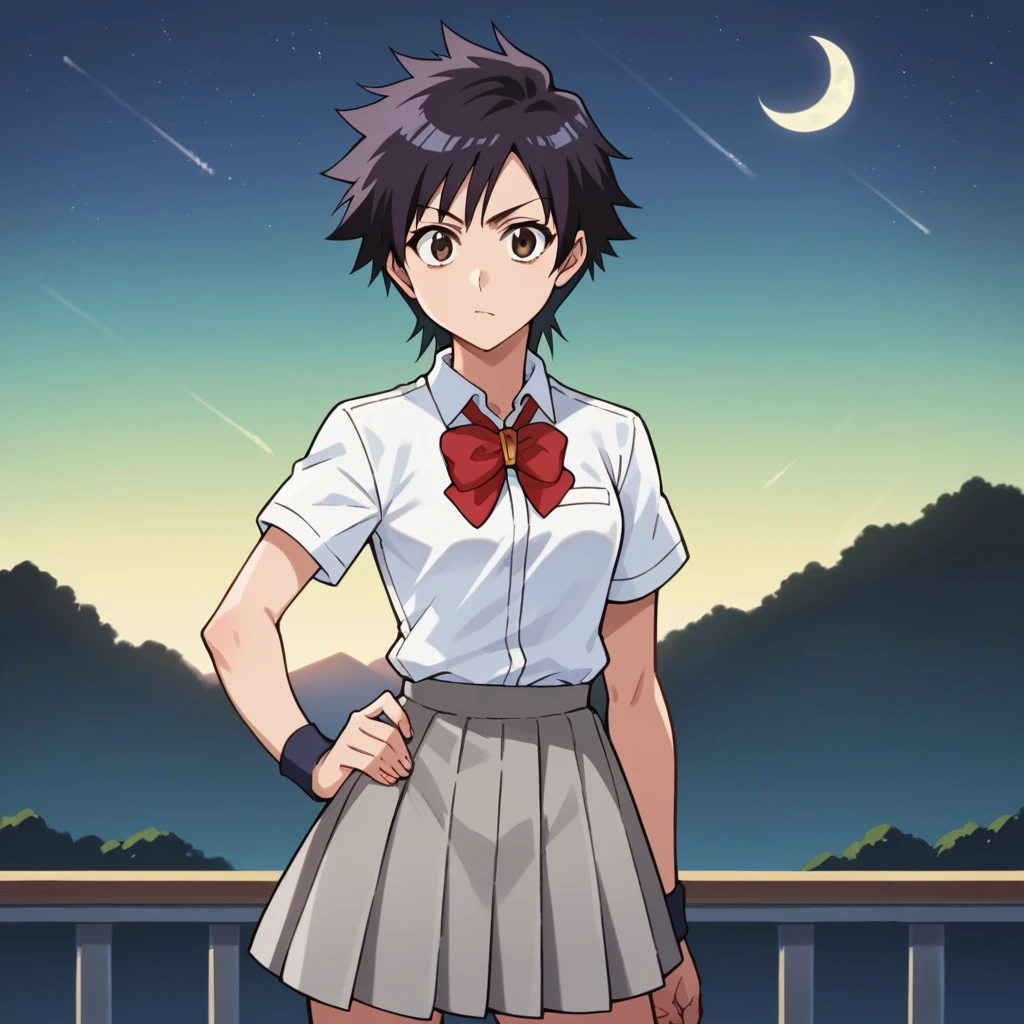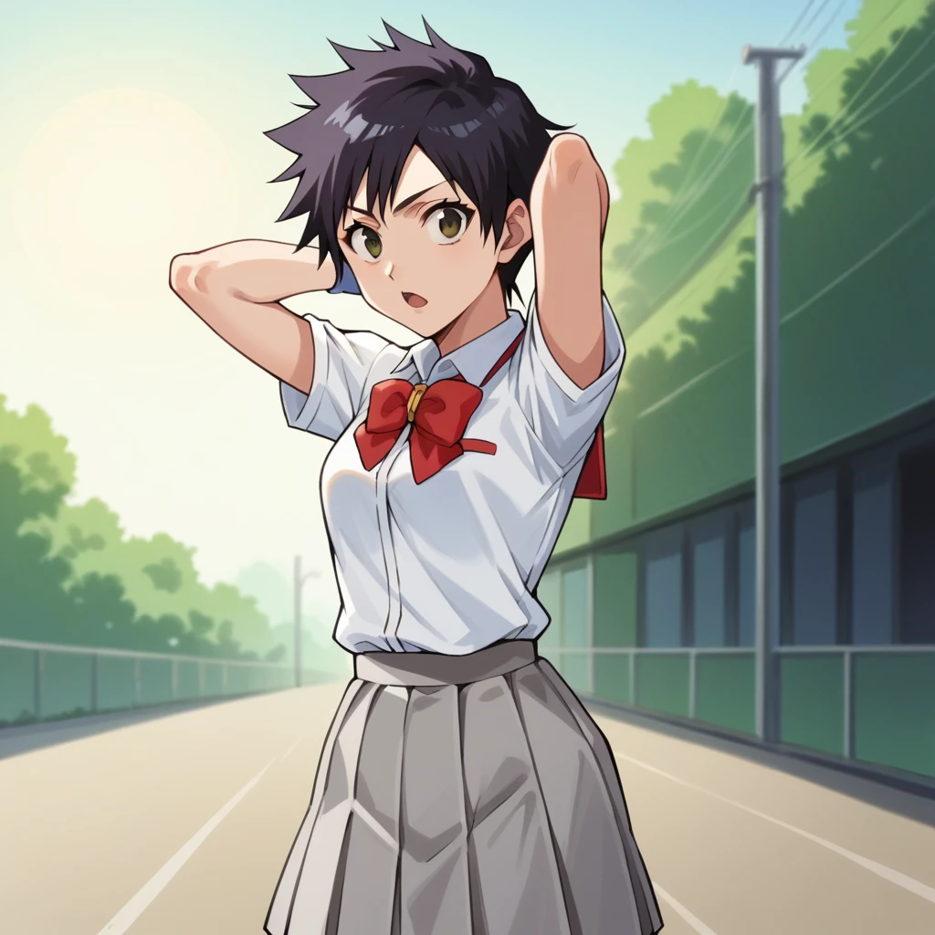 Ari_Young, black hair, short hair, spiked hair, brown eyes,School Outfit: