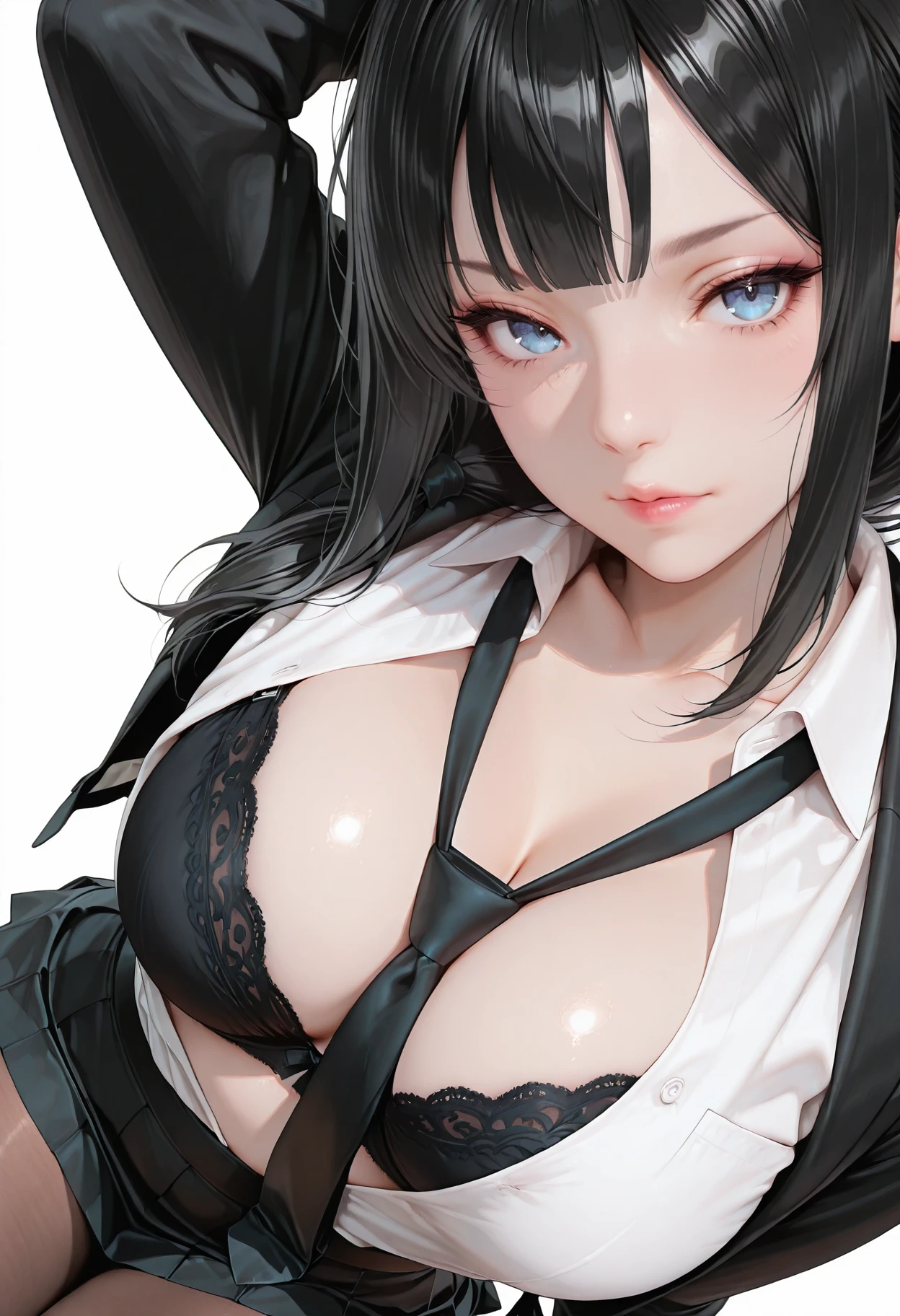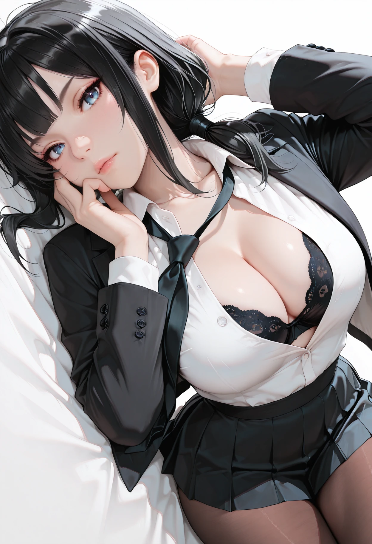 black skirt, microskirt,  (pantyhose), open jacket, black jacket, white shirt, partially unbuttoned shirt, black bra, pleated skirt, cleavage, tuxedo jacket, loose necktie, black necktie,