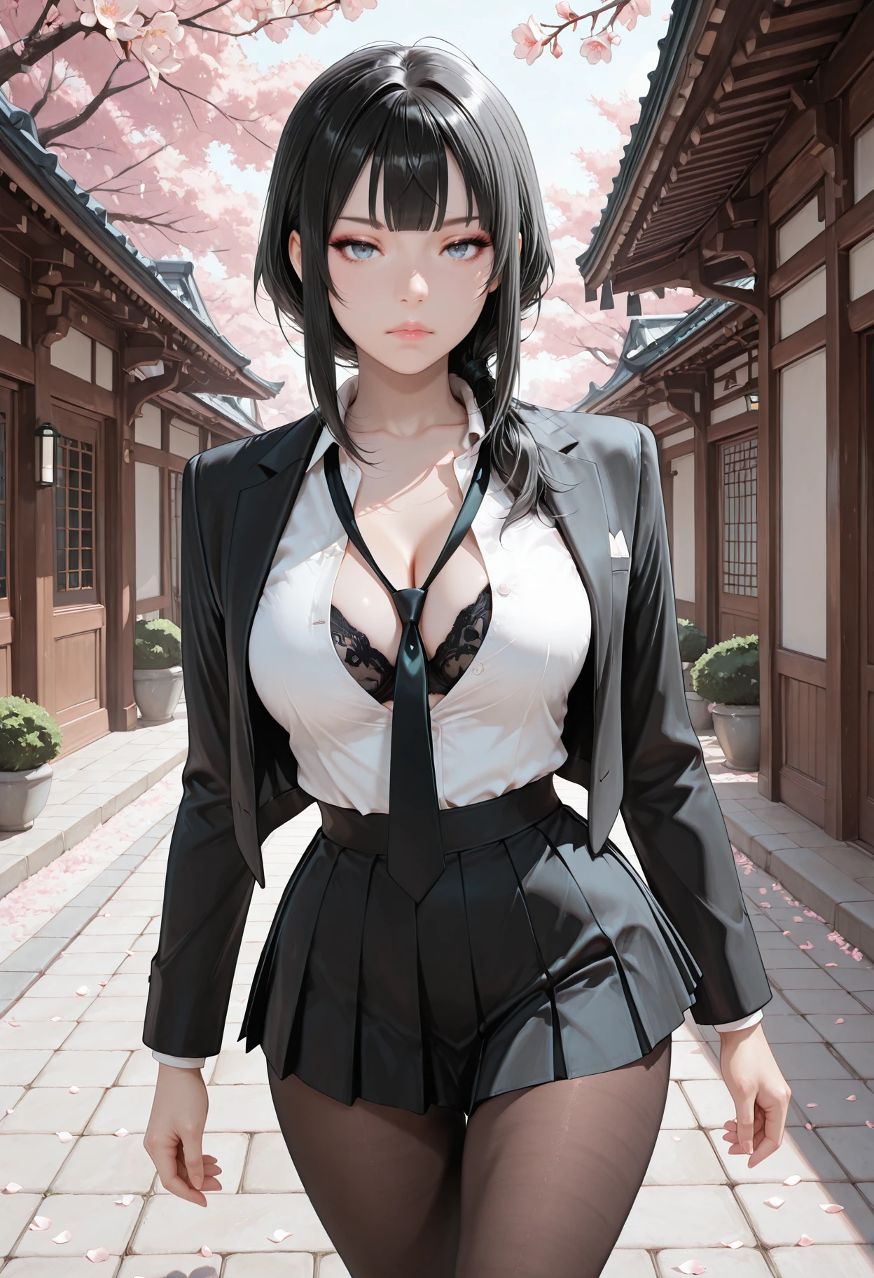 black skirt, microskirt, (pantyhose), , black jacket, white shirt, partially unbuttoned shirt, black bra, pleated skirt, cleavage, tuxedo jacket, loose necktie, black necktie,