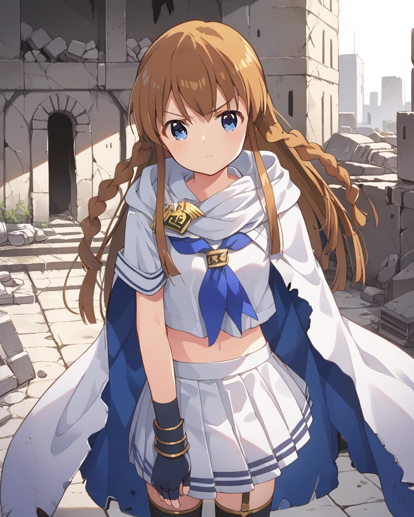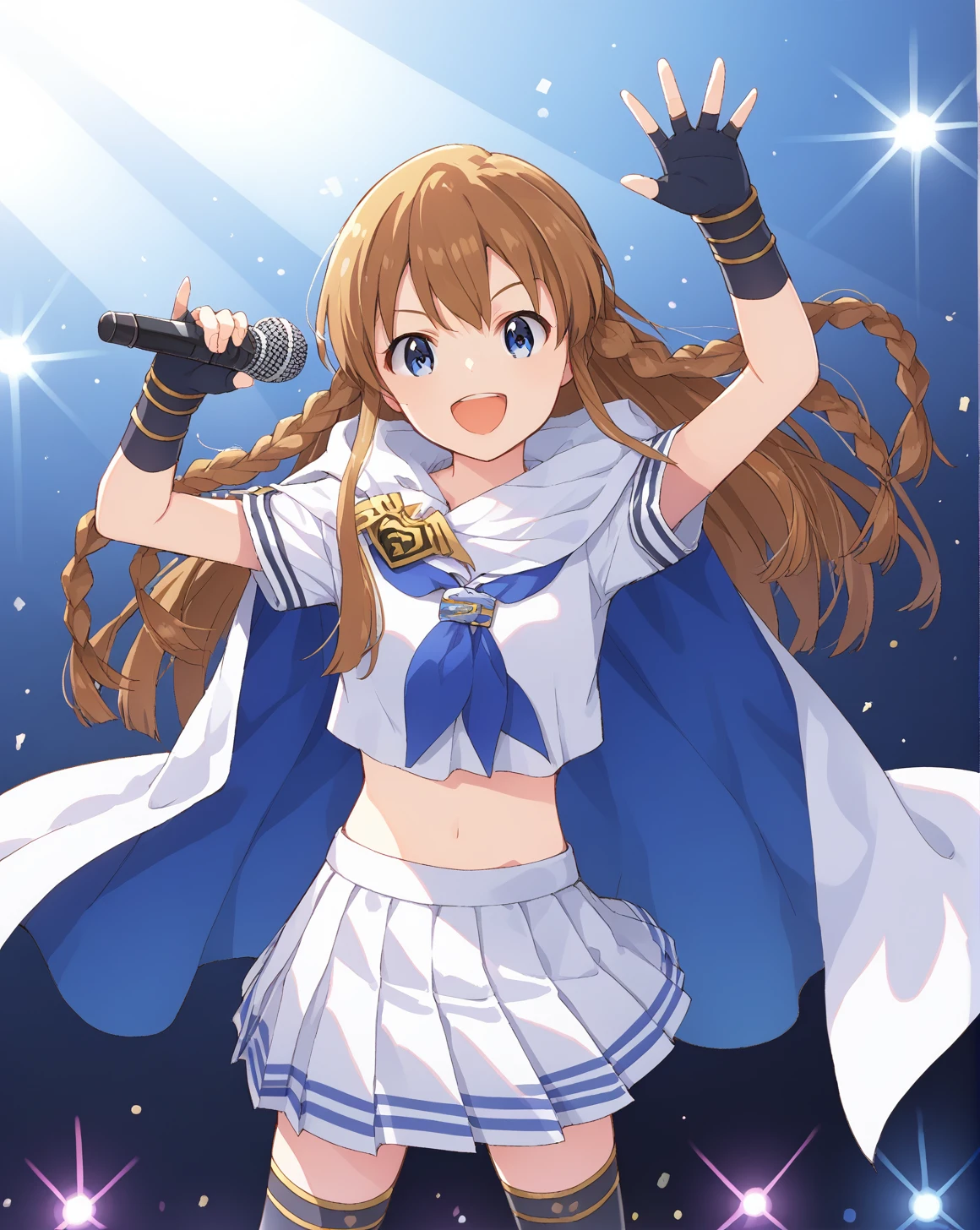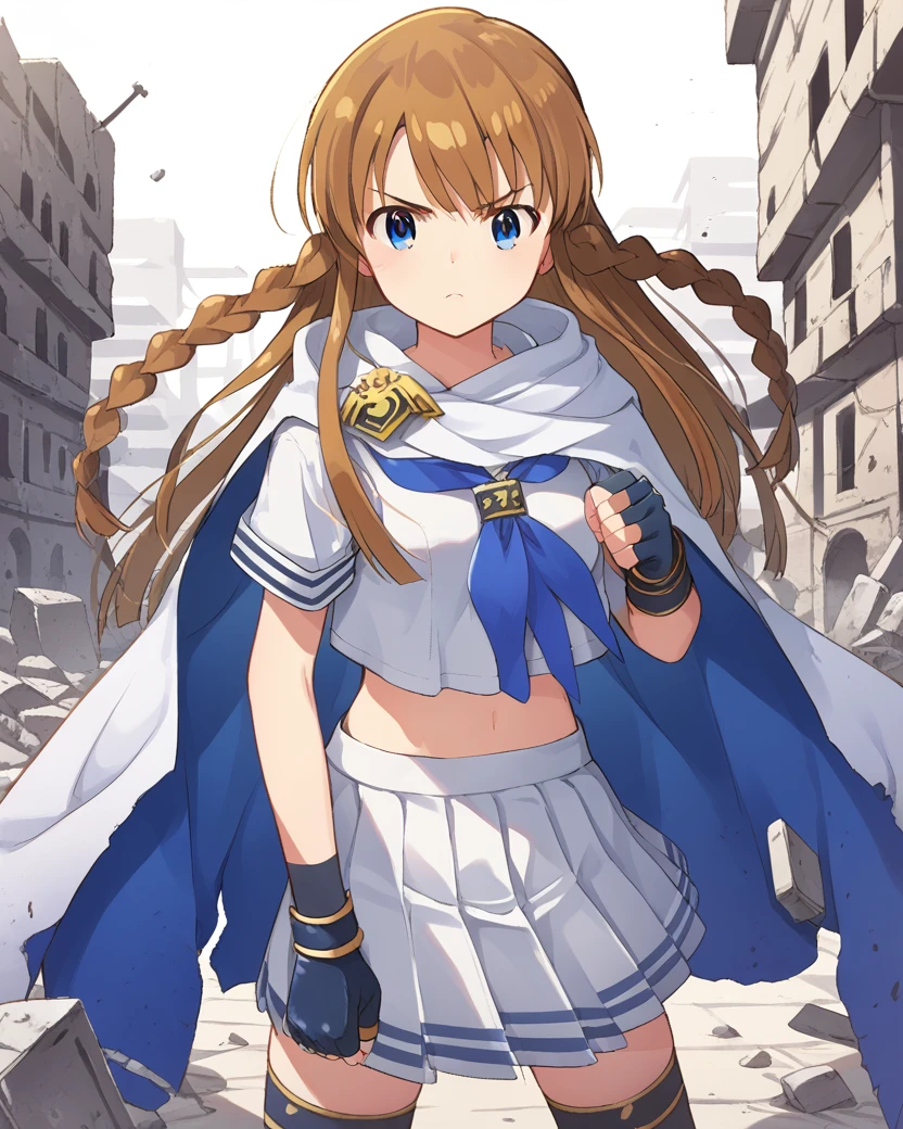 Clothes: MightySailor,white shirt,white skirt,midriff,multicolored cape,blue cape,white cape,thighhighs,fingerless gloves,blue neck ribbon,single badge,loafers,
