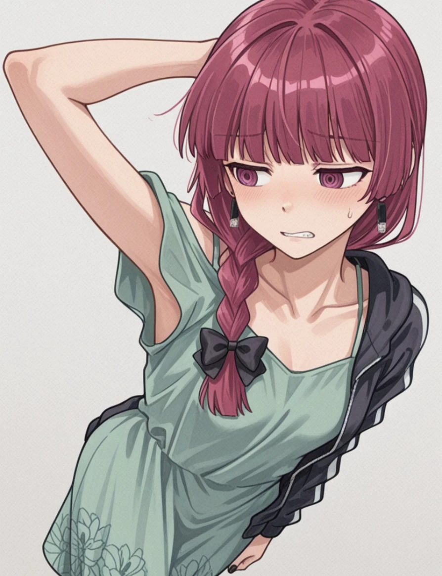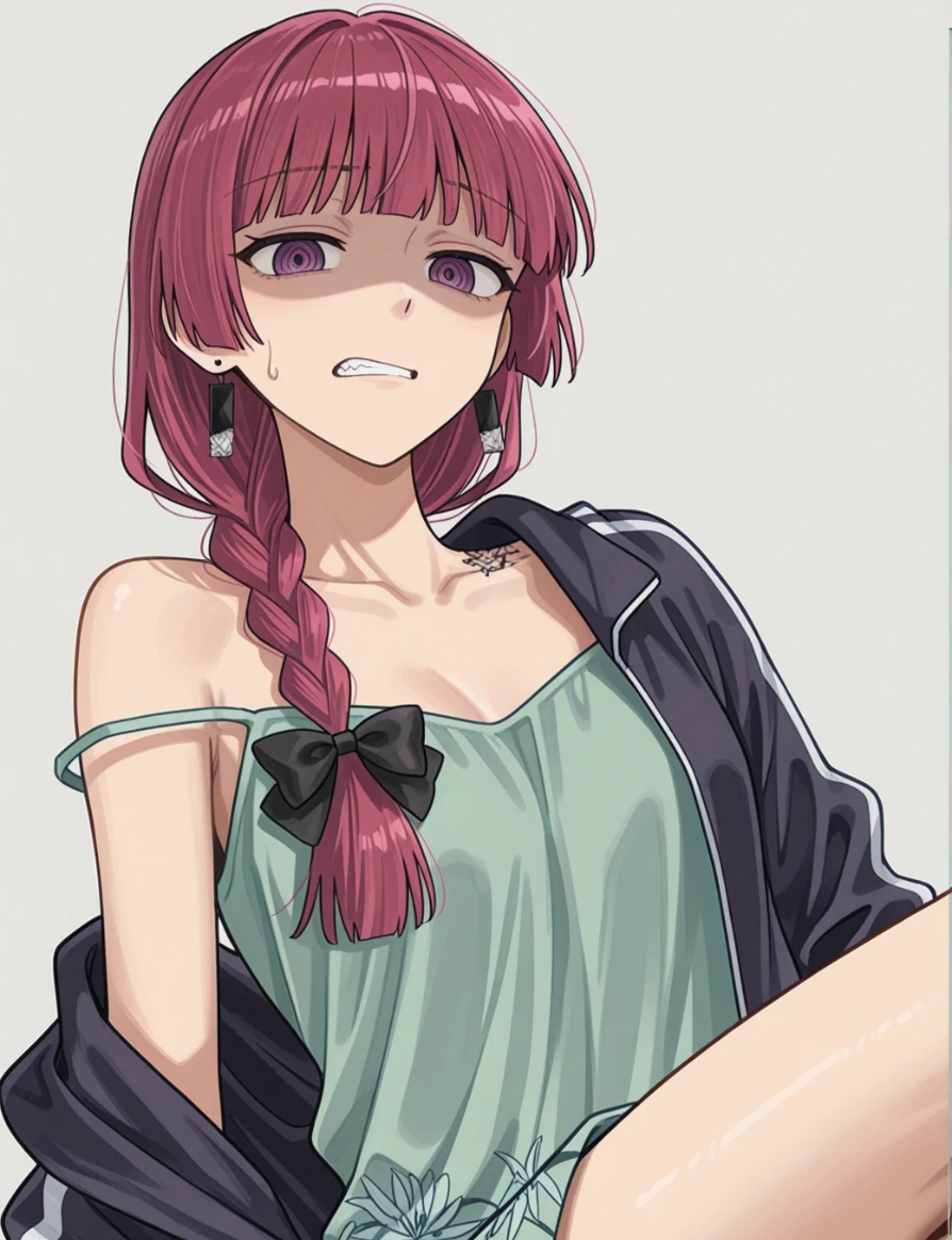 • hiroi5kikuri, small breasts, purple hair, purple eyes, ringed eyes, bangs, long hair, braid, blunt bangs, hair over shoulder, single braid, bow, black nails, earrings,
