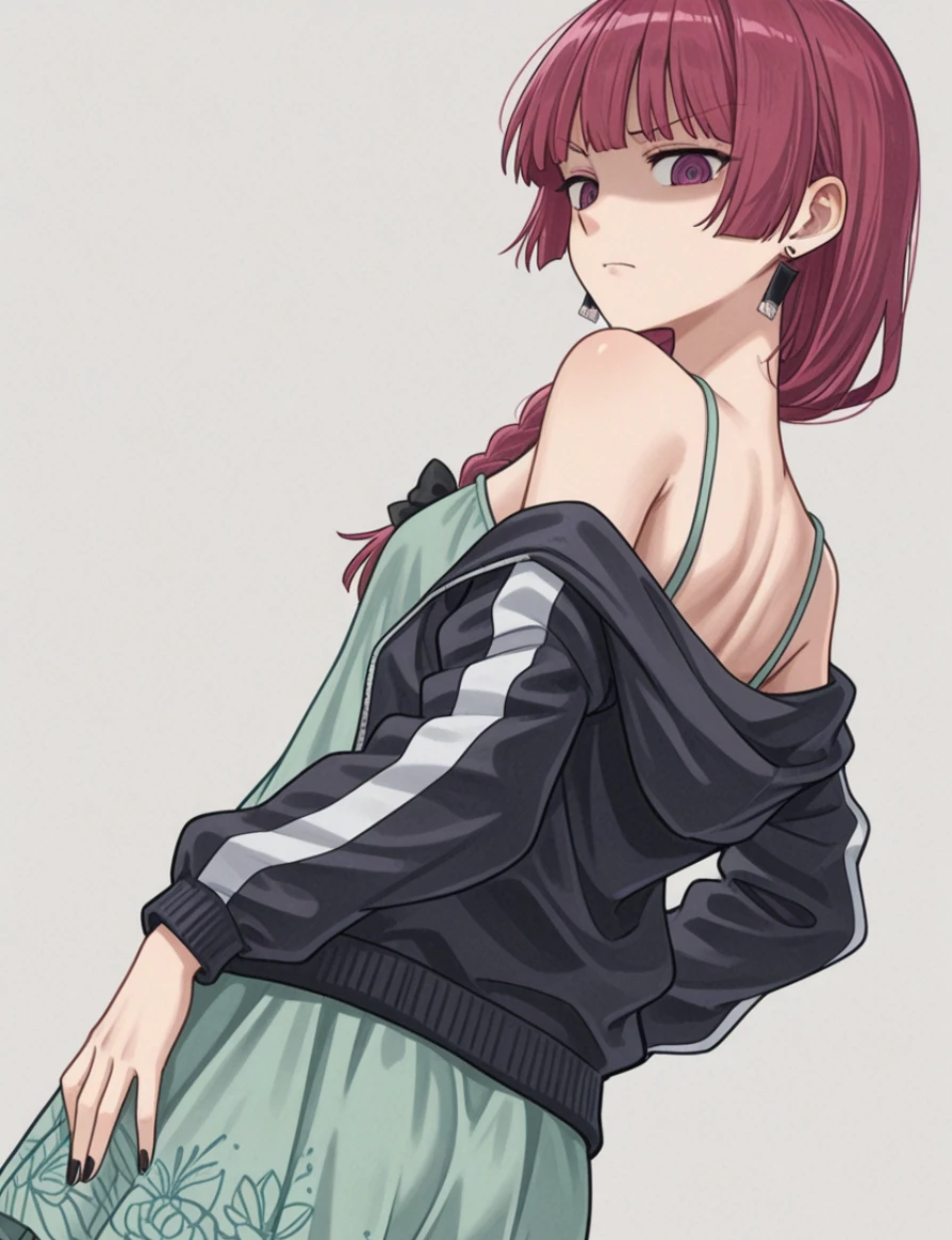 track jacket, black jacket, hoodie, green dress, spaghetti_strap, off shoulder, single bare shoulder,