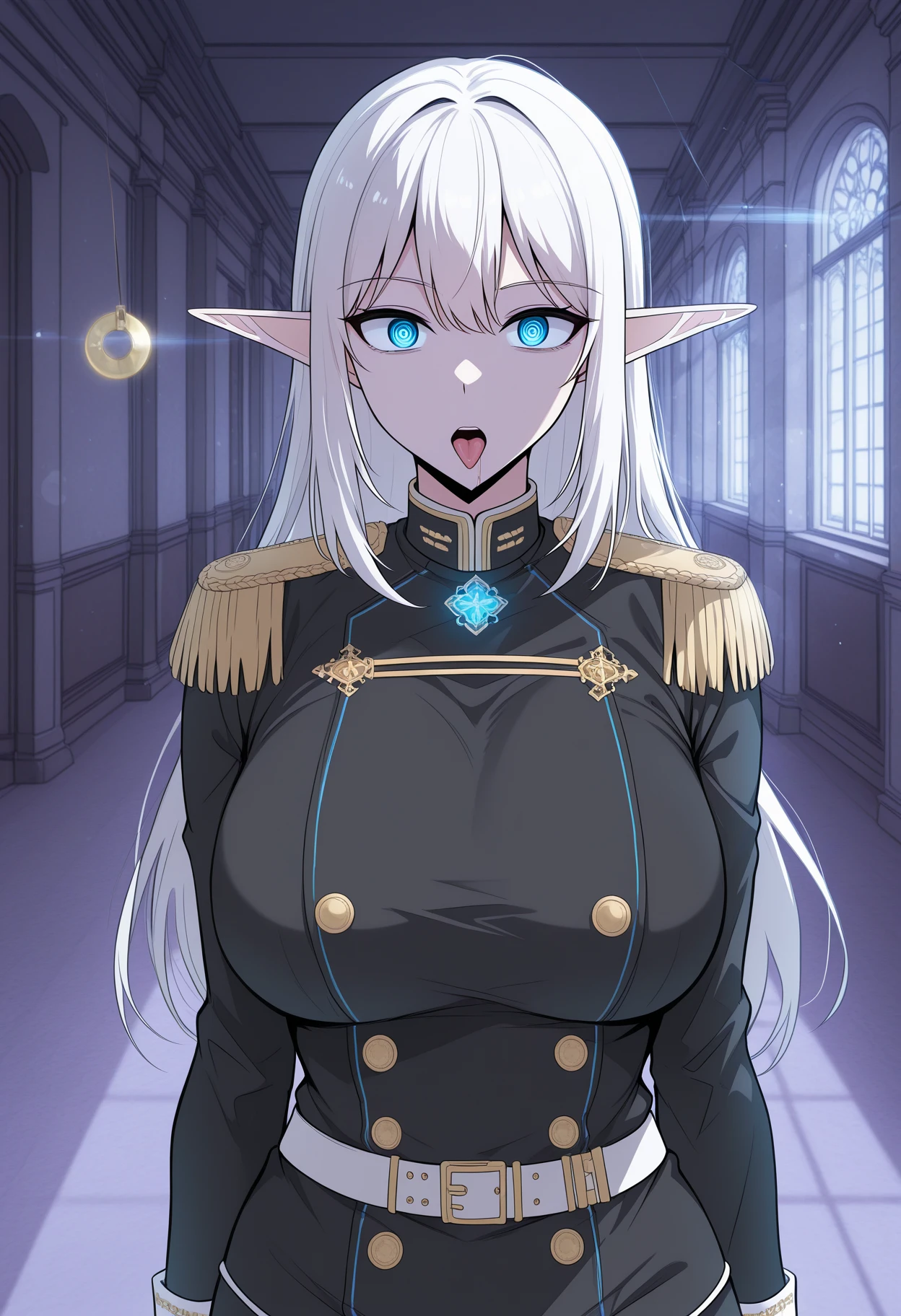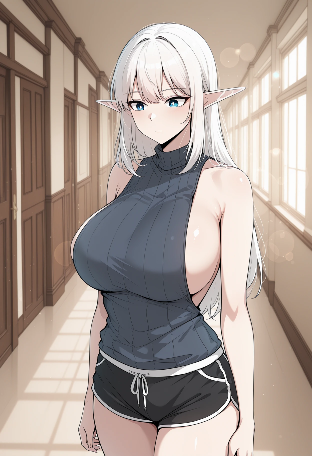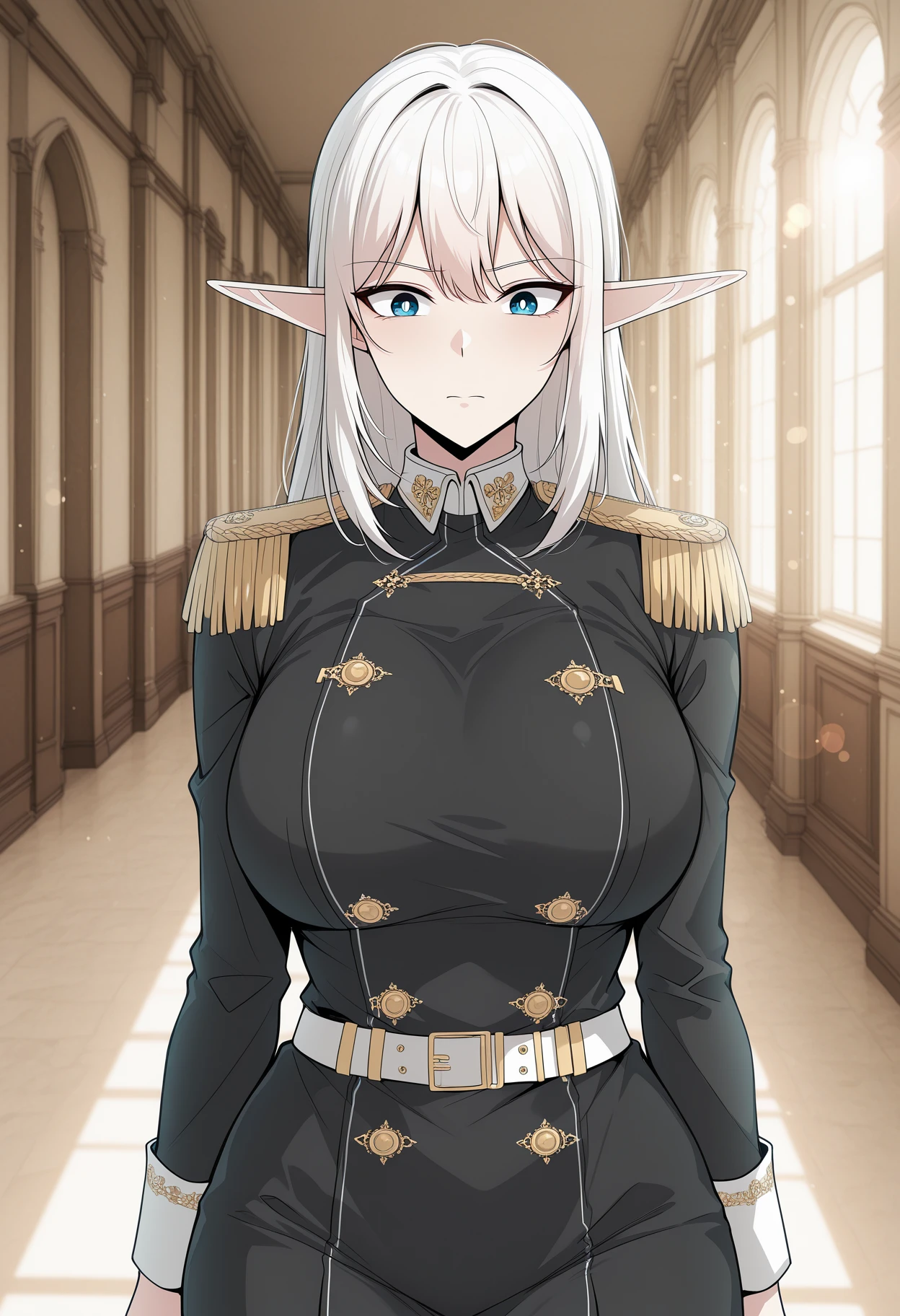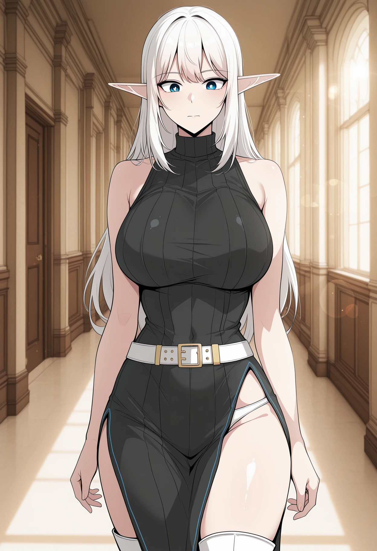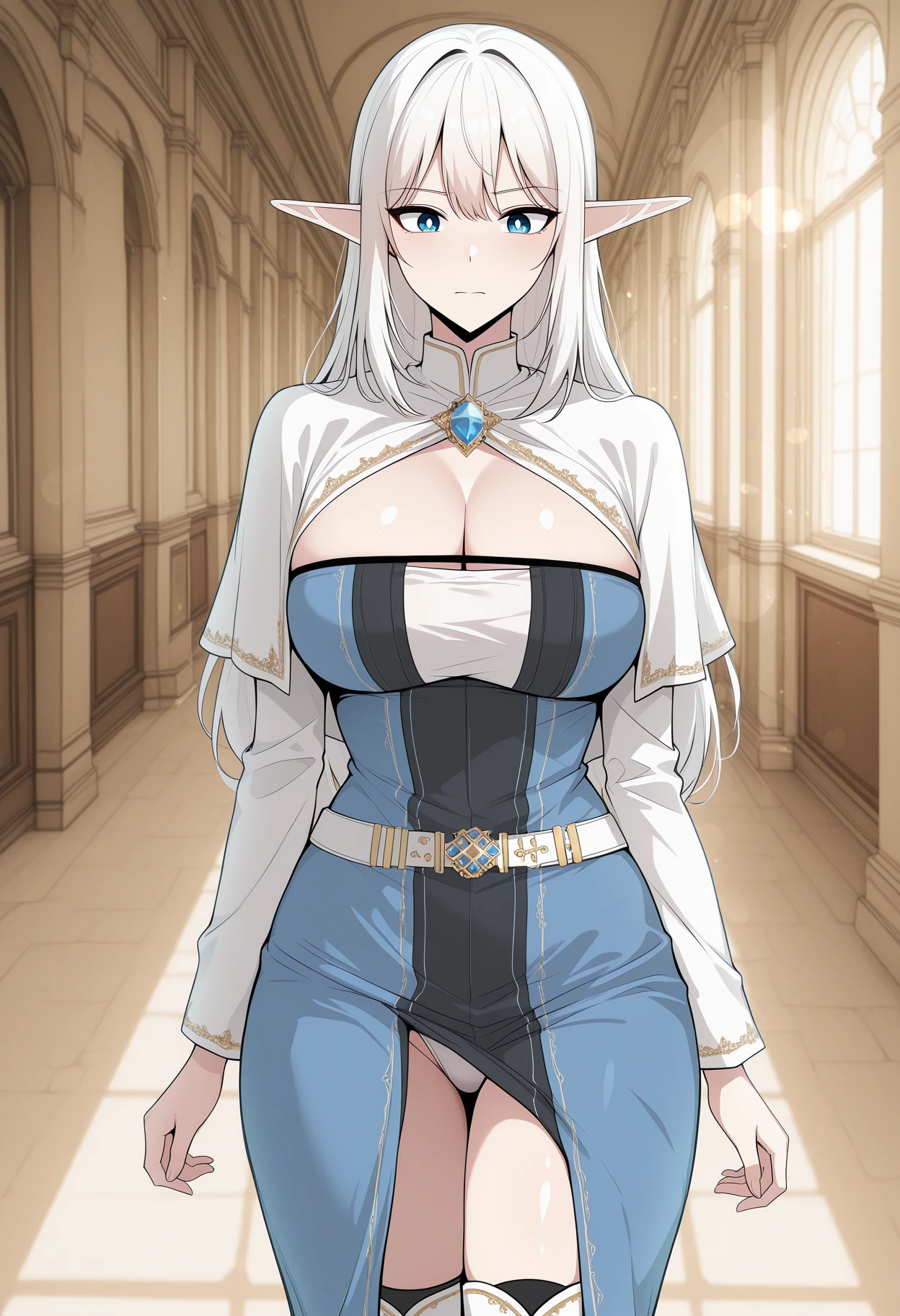 erdella, elf, pointy ears, white hair, long hair, bangs, blue eyes, white pupils, large breasts,