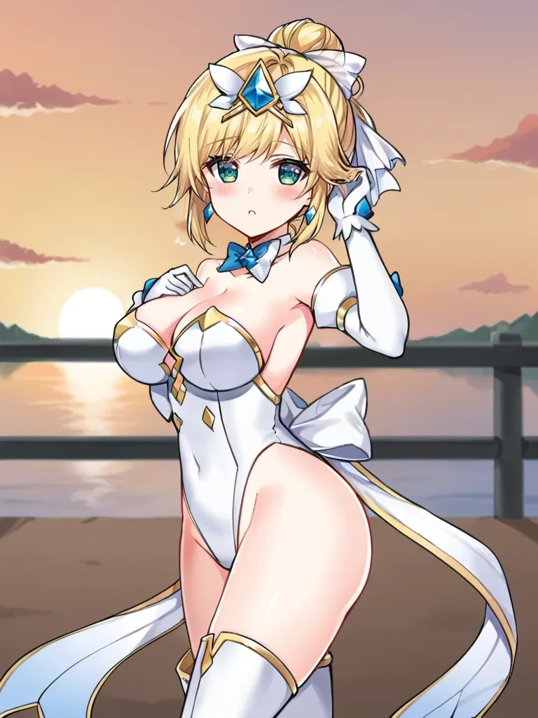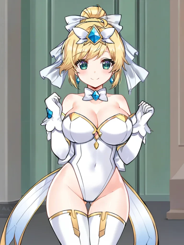 magical girl, blonde hair, green eyes, single hair bun, tiara, jewelry, hair bow, bowtie, gloves, elbow gloves, bare shoulders, cleavage, large breasts, leotard, thigh boots, high heels