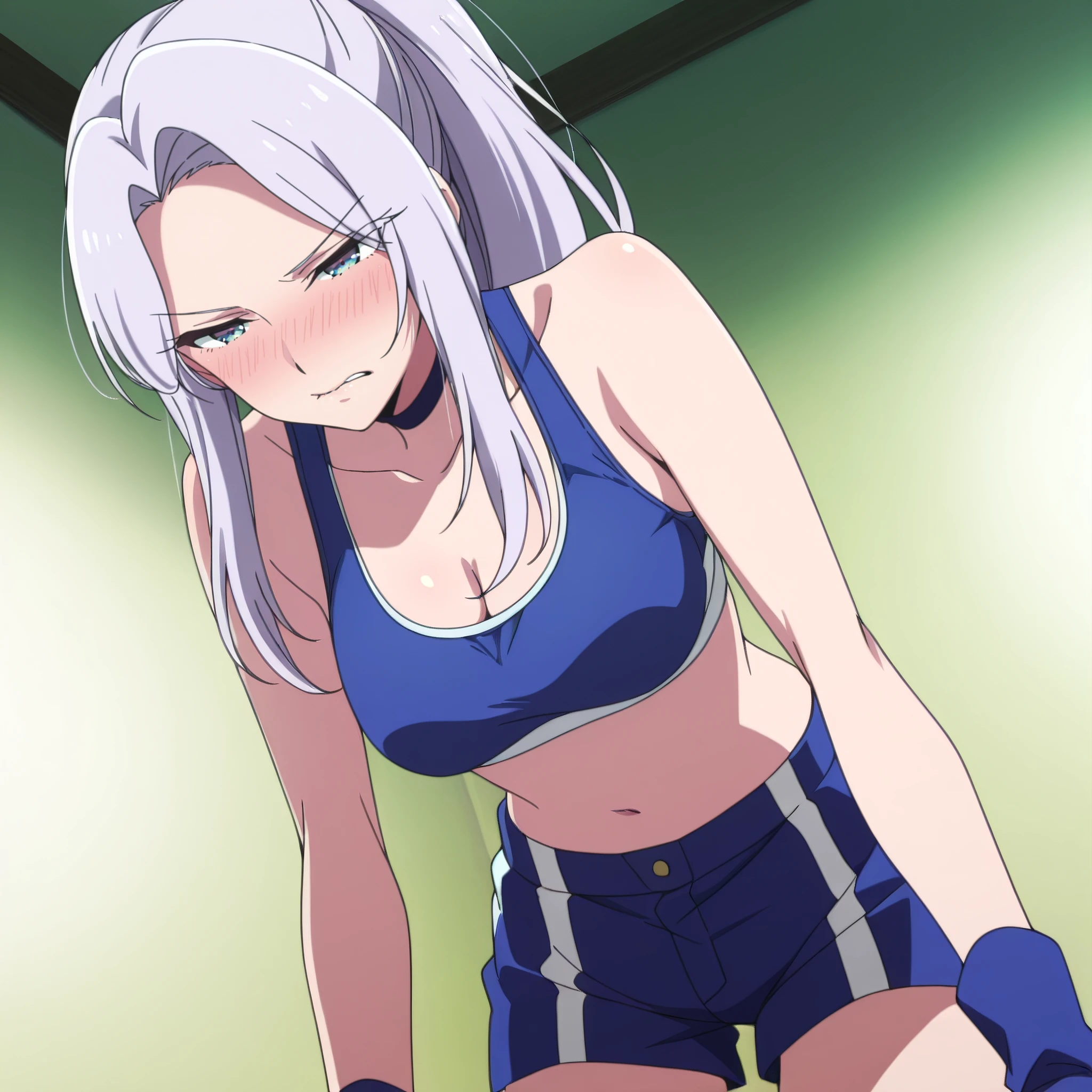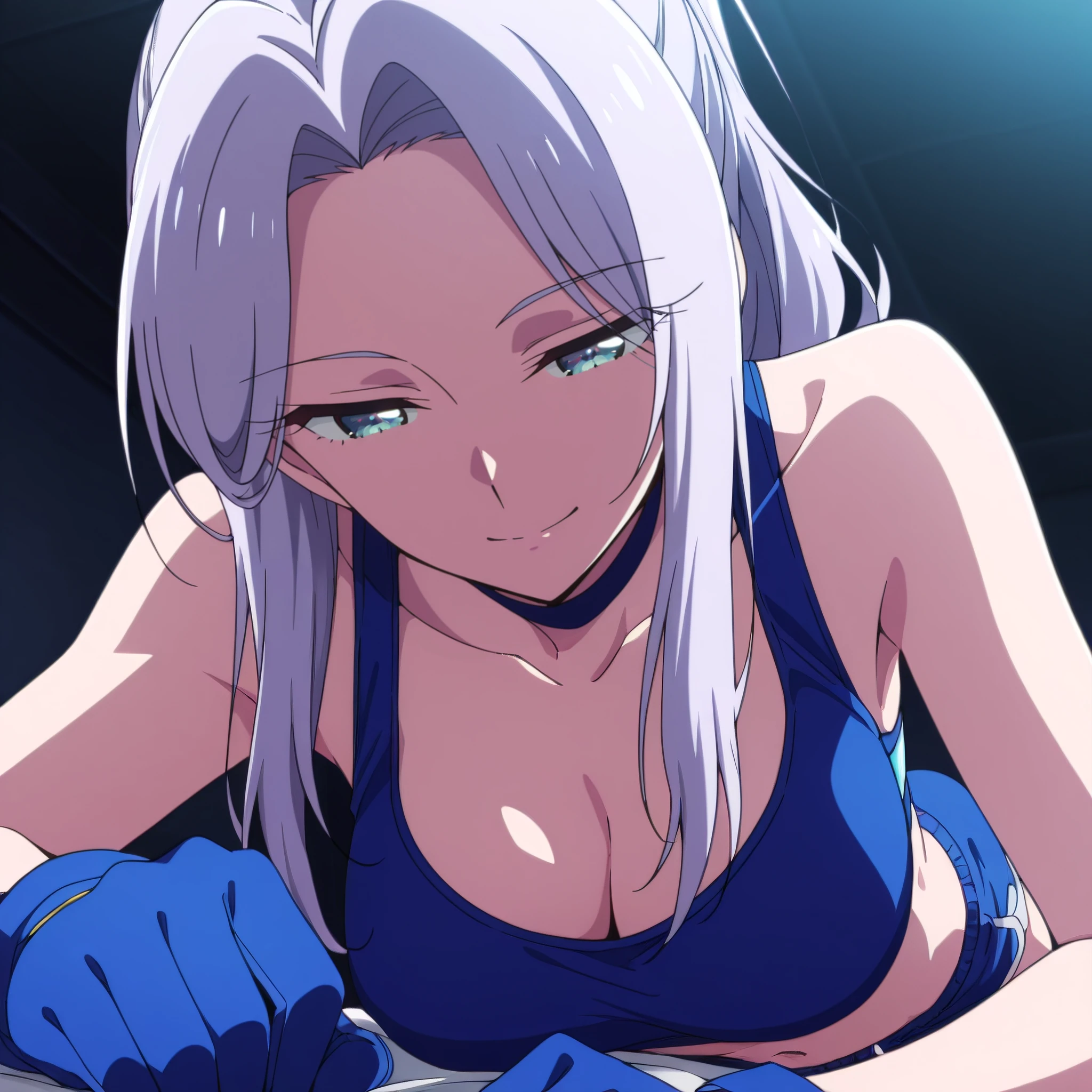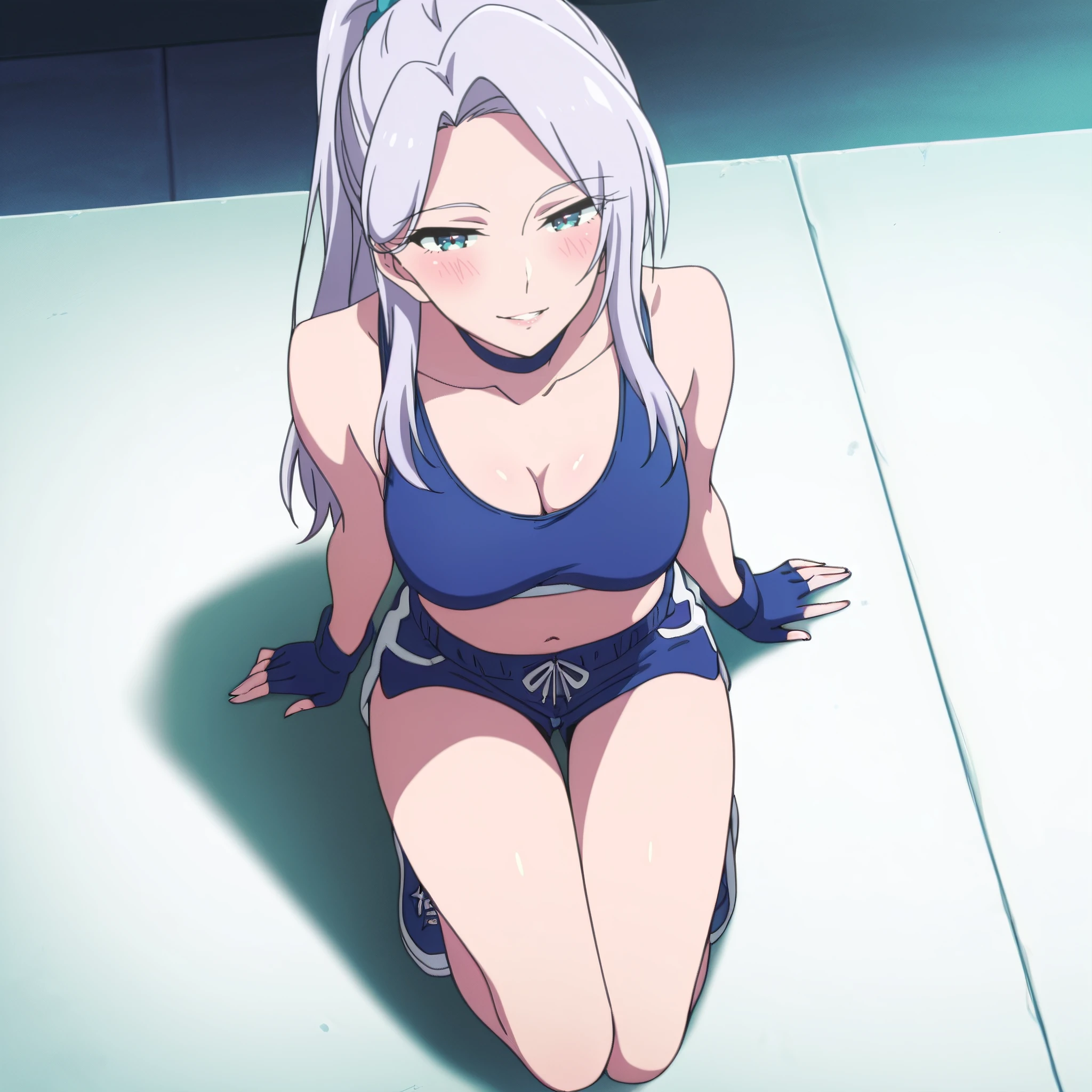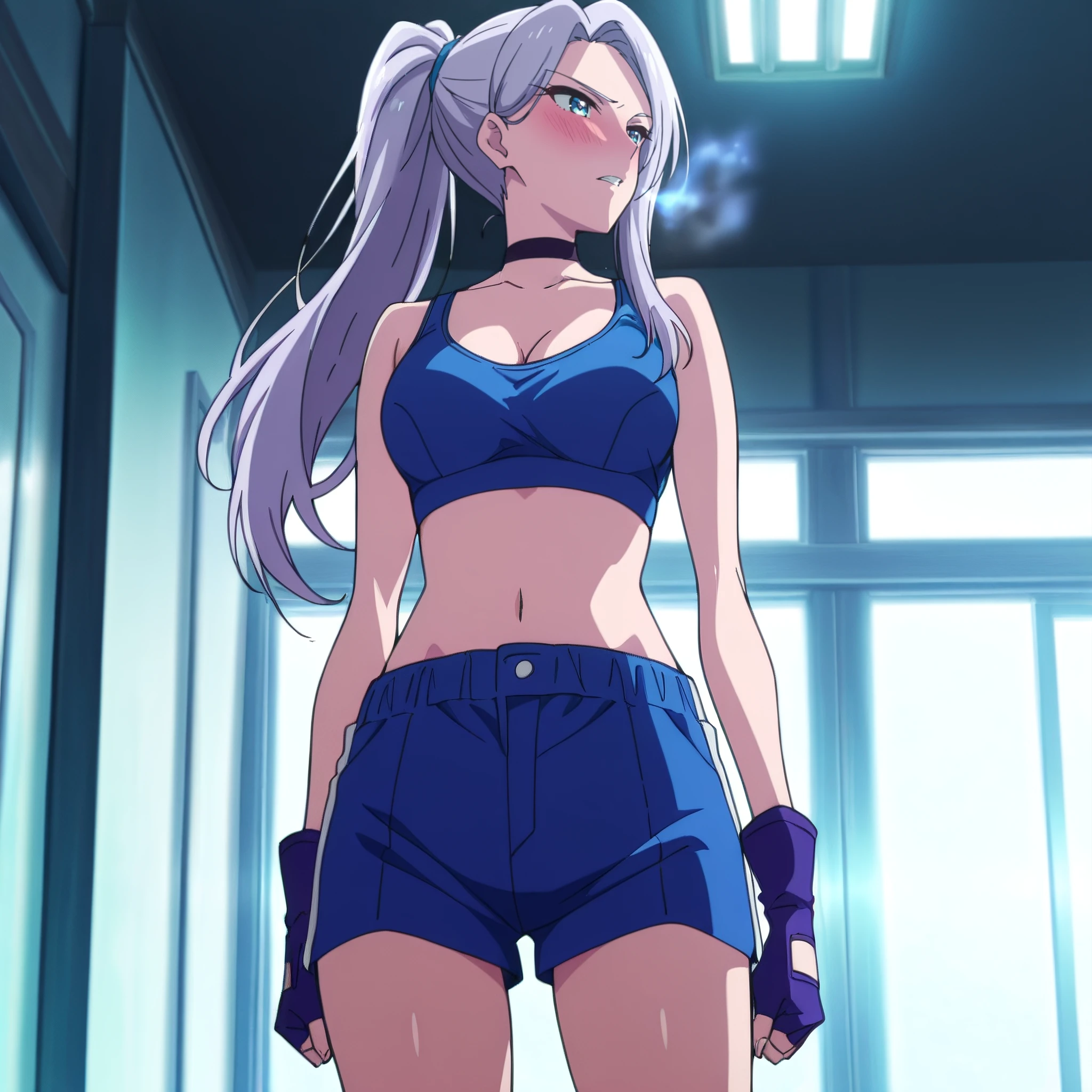 ZoyaBoxing, bare shoulders, cleavage, gloves, choker, collarbone, midriff, ponytail, parted bangs, navel, blue shorts, blue sports bra, hair intakes,