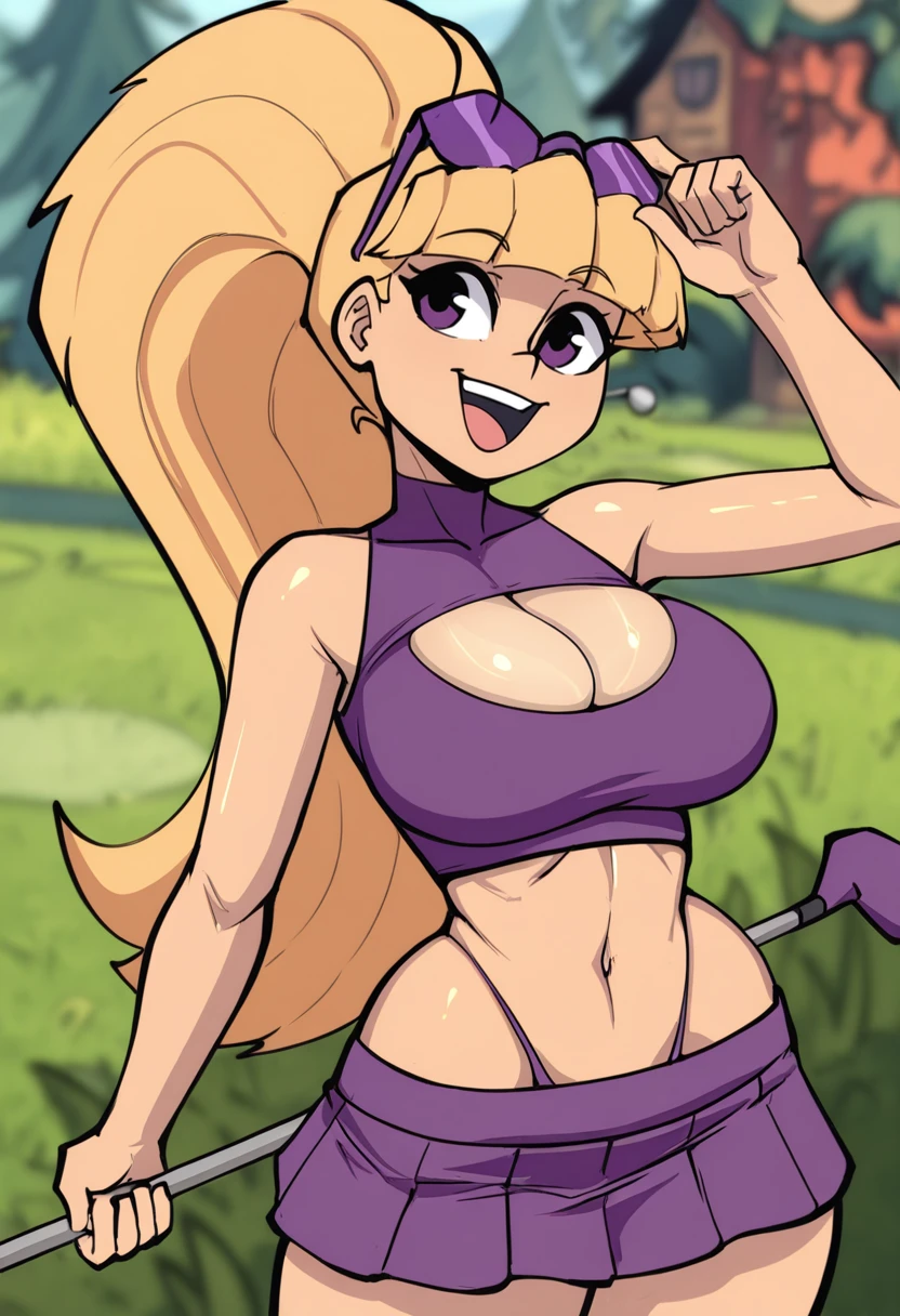 GogPacifica, 1girl, long hair, blonde hair, ponytail, large breasts, fair skin, crop top, clothing cutout, sleeveless, midriff, purple miniskirt, g-string,