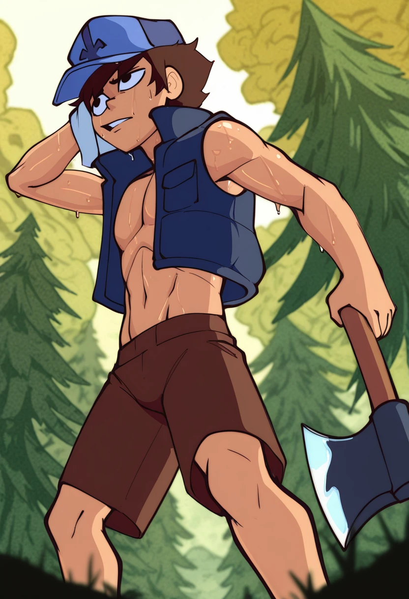 GogDipper, 1boy, short hair, brown hair, red shirt, blue sleeveless jacket, blue and white cap,