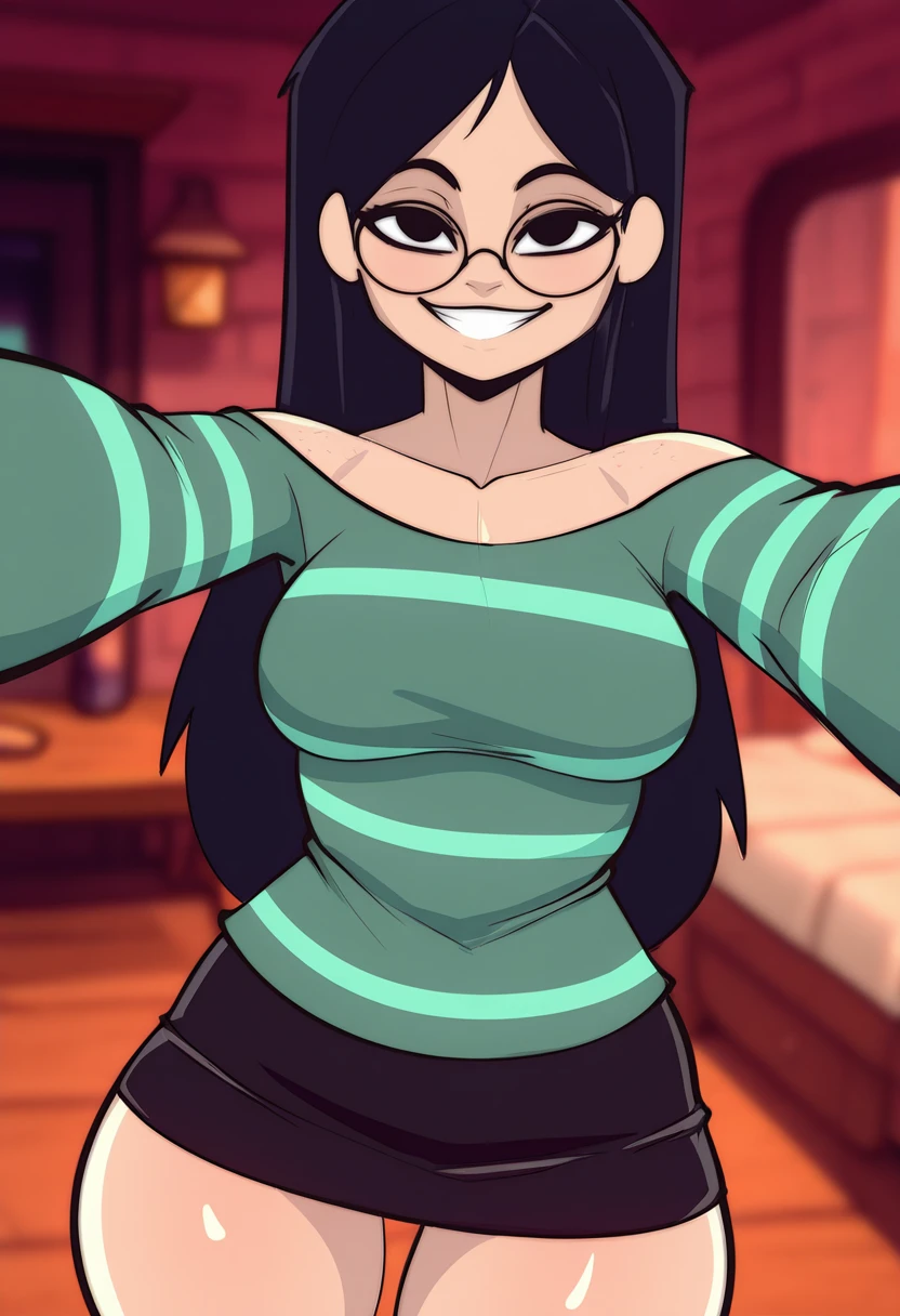 GogCandy, 1girl, fair skin, long hair, black hair, medium breasts, glasses, green striped shirt, off-shoulder, black miniskirt,