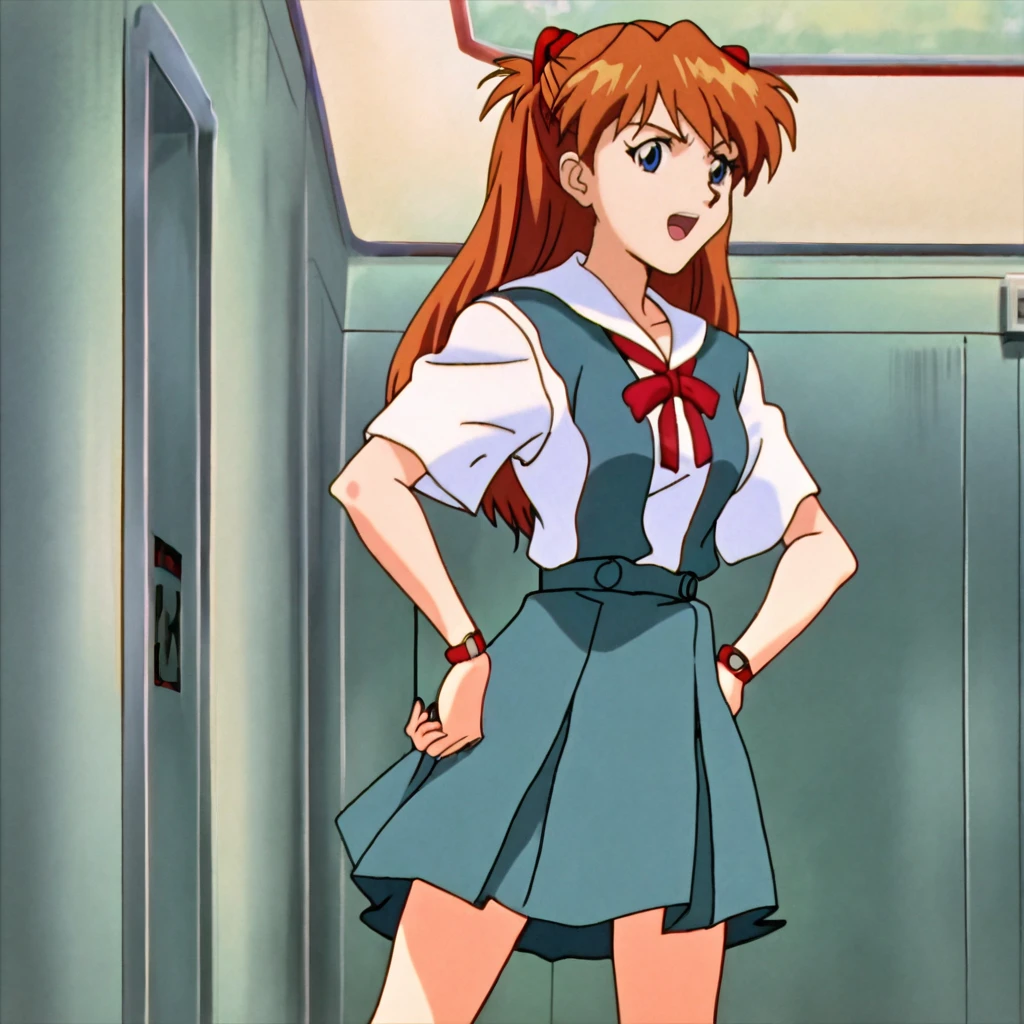Trigger with school outfit: AsukaNGESchool, 1girl, souryuu asuka langley, watch, wristwatch, tokyo-3 middle school uniform, long hair, blue eyes, orange hair, interface headset,short sleeves, bangs headgear, hair ornament, skirt, ribbon, cowboy shot