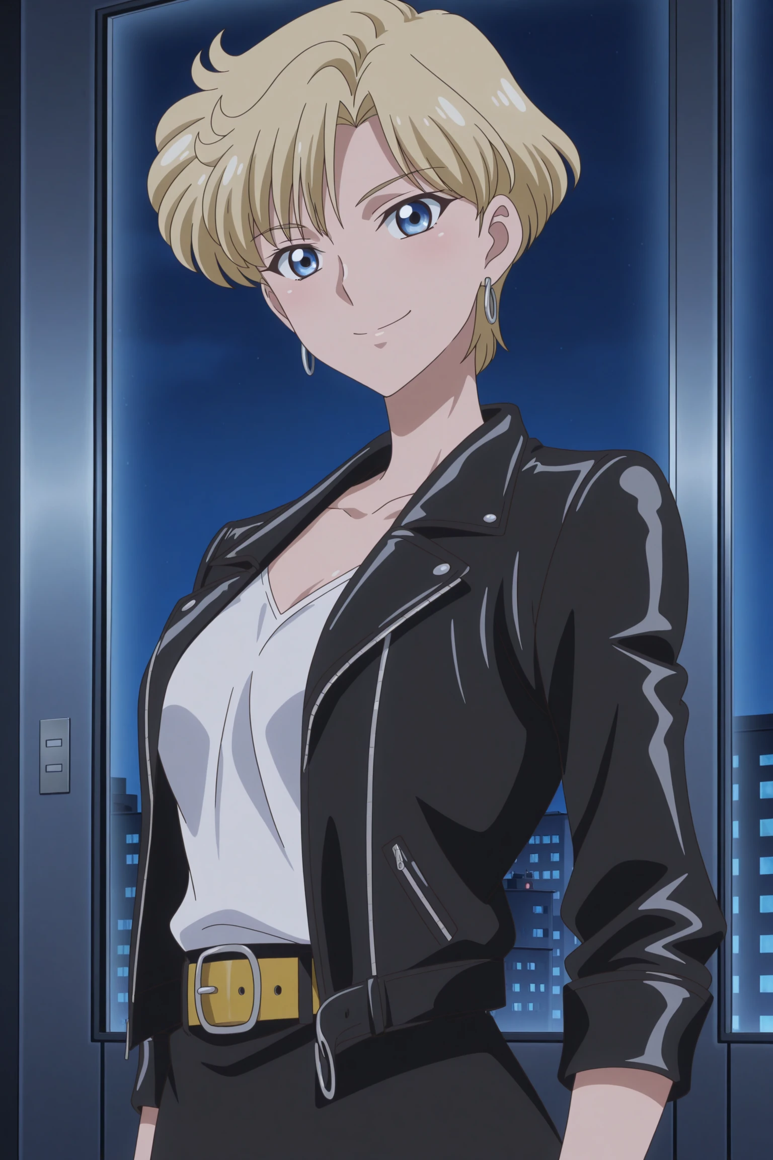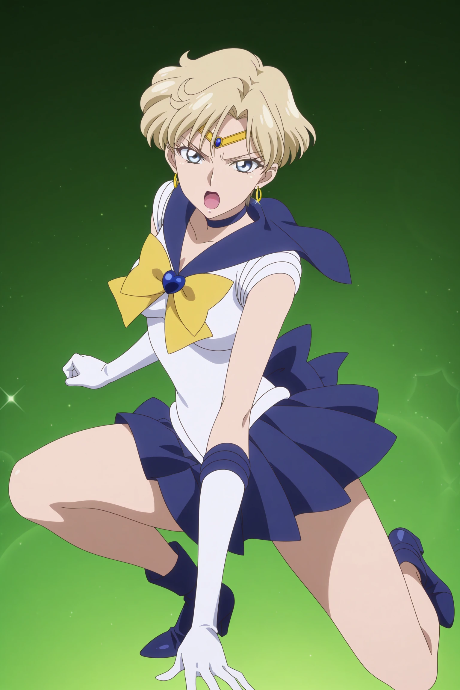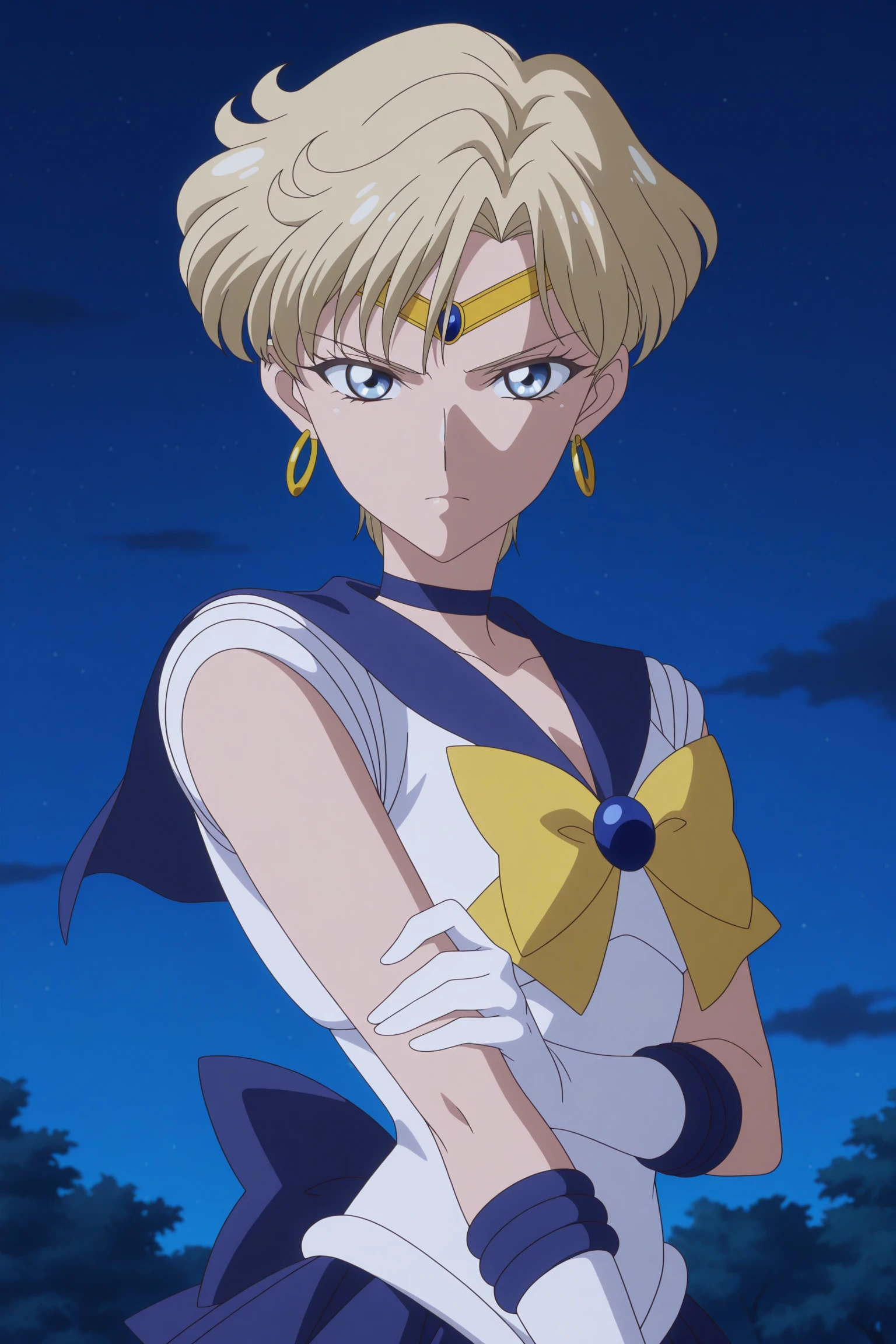 sailor uranus, very short hair, blonde hair, blue eyes, yellow earrings, crescent earrings, circlet, sailor senshi uniform, magical girl, blue choker, blue sailor collar, yellow bow, white gloves, elbow gloves, blue skirt, pleated skirt, blue back bow, blue footwear, bootsPrompt for ILXL V1